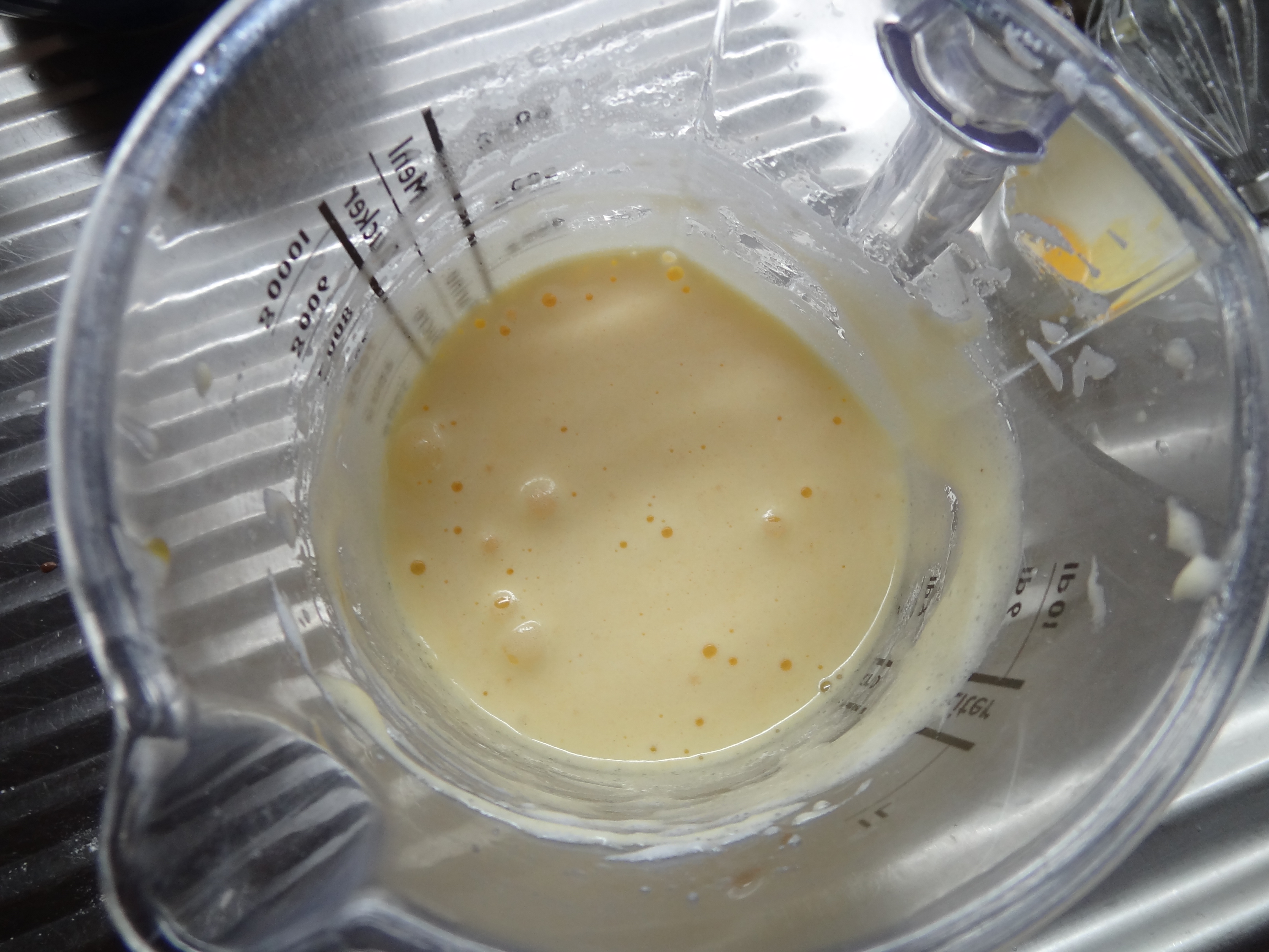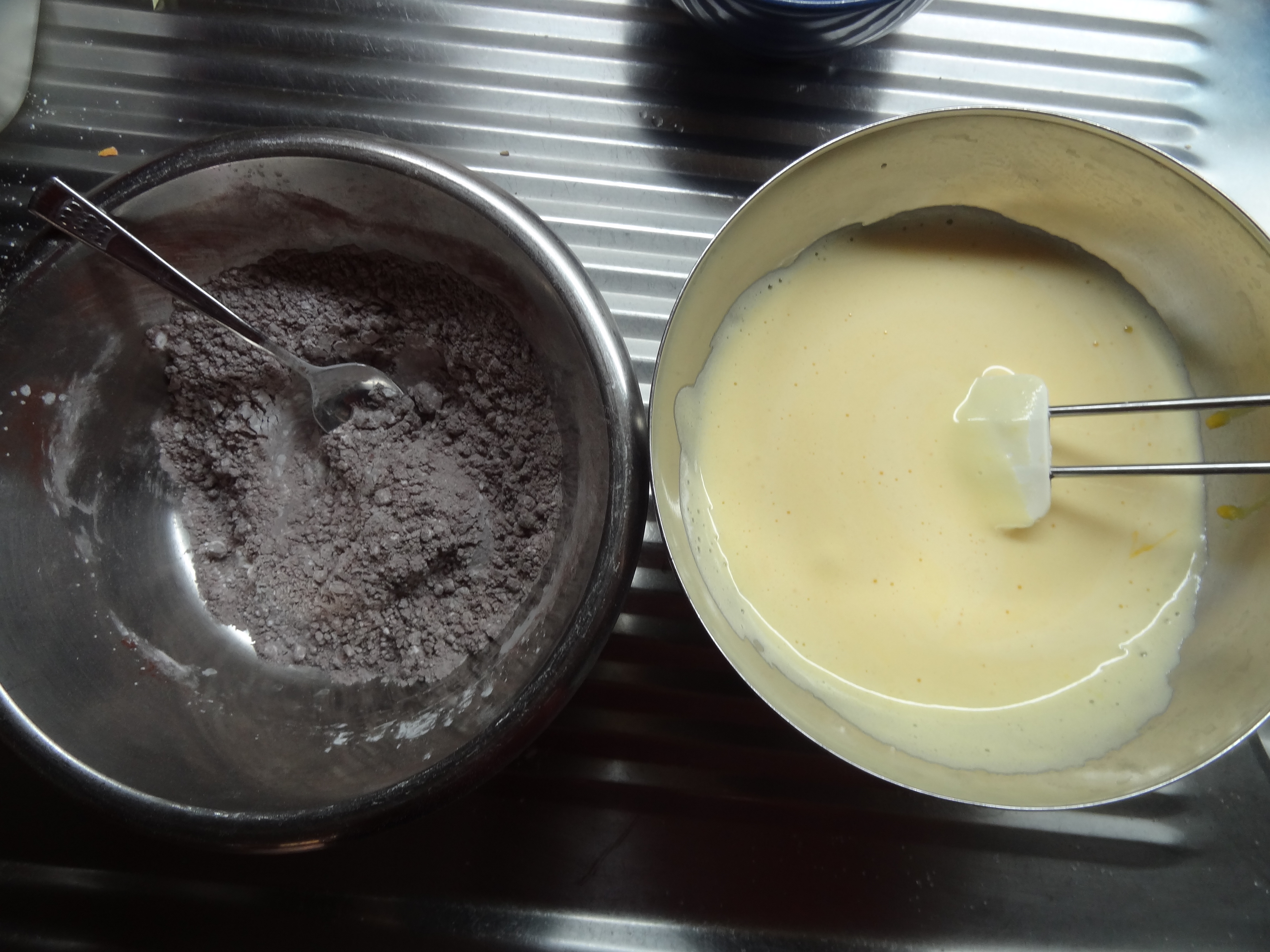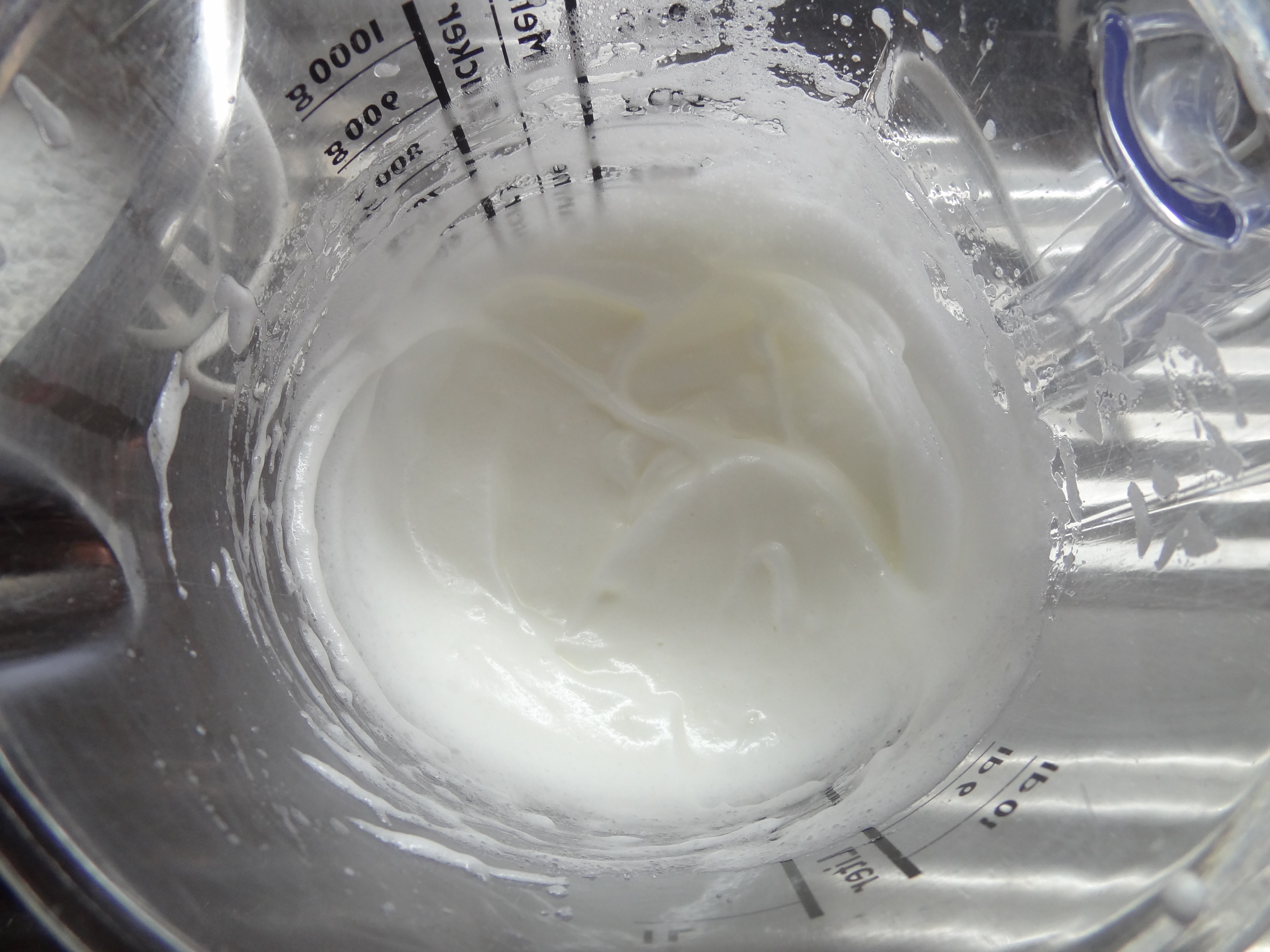 Als erstes die Eier trennen und das Eiweiss mit dem Salz steifschlagen. Sobald es steif ist, den Zucker nach und nach einrieseln lassen und kurz weiterrühren, sodass die Masse schön glänzt. Anschliessend die Eigelbe hinzufügen und verrühren. Die Masse dann eventuell in eine etwas weitere Schüssel geben, falls ihr wie ich einen Messbecher verwendet habt.