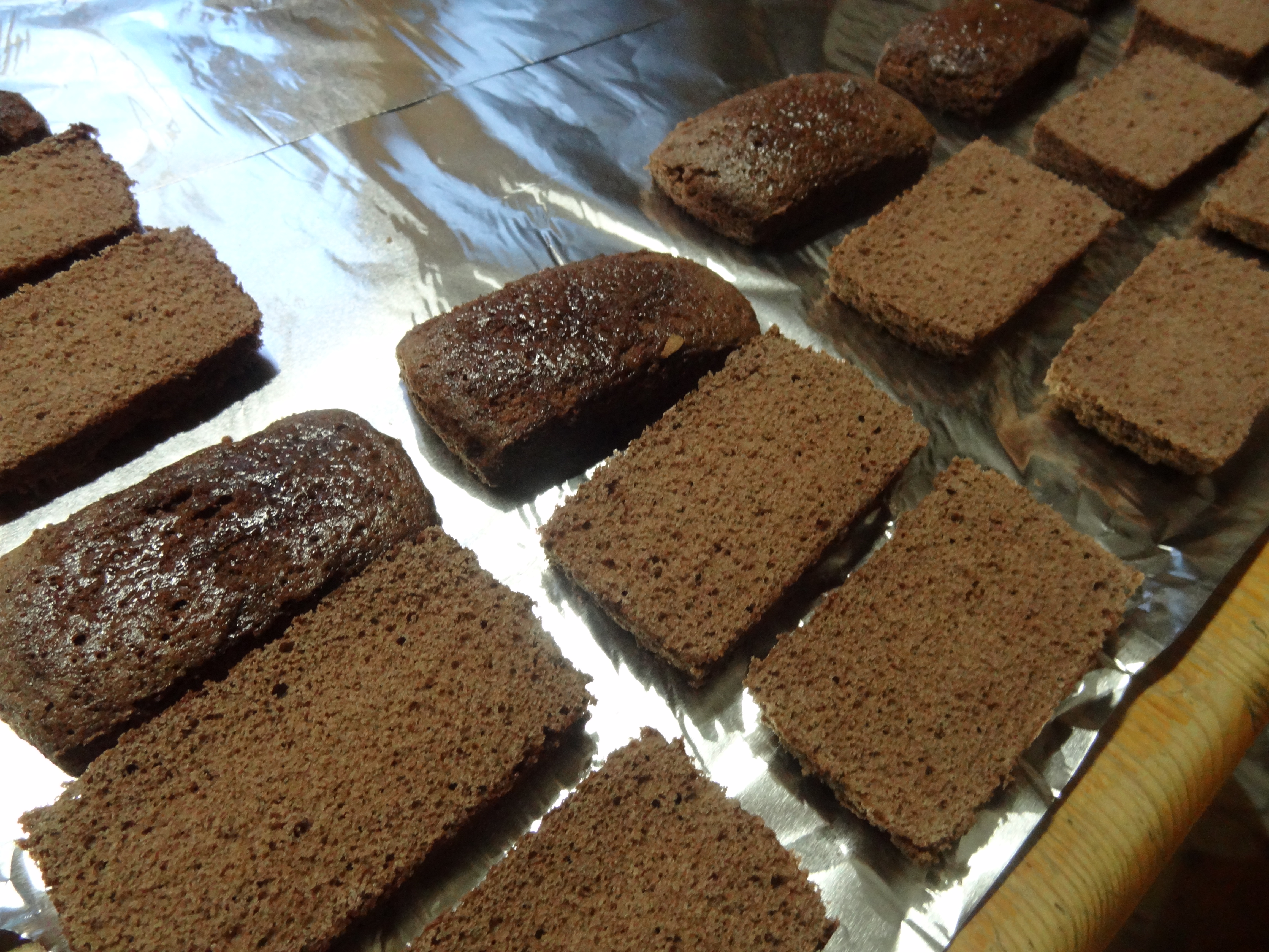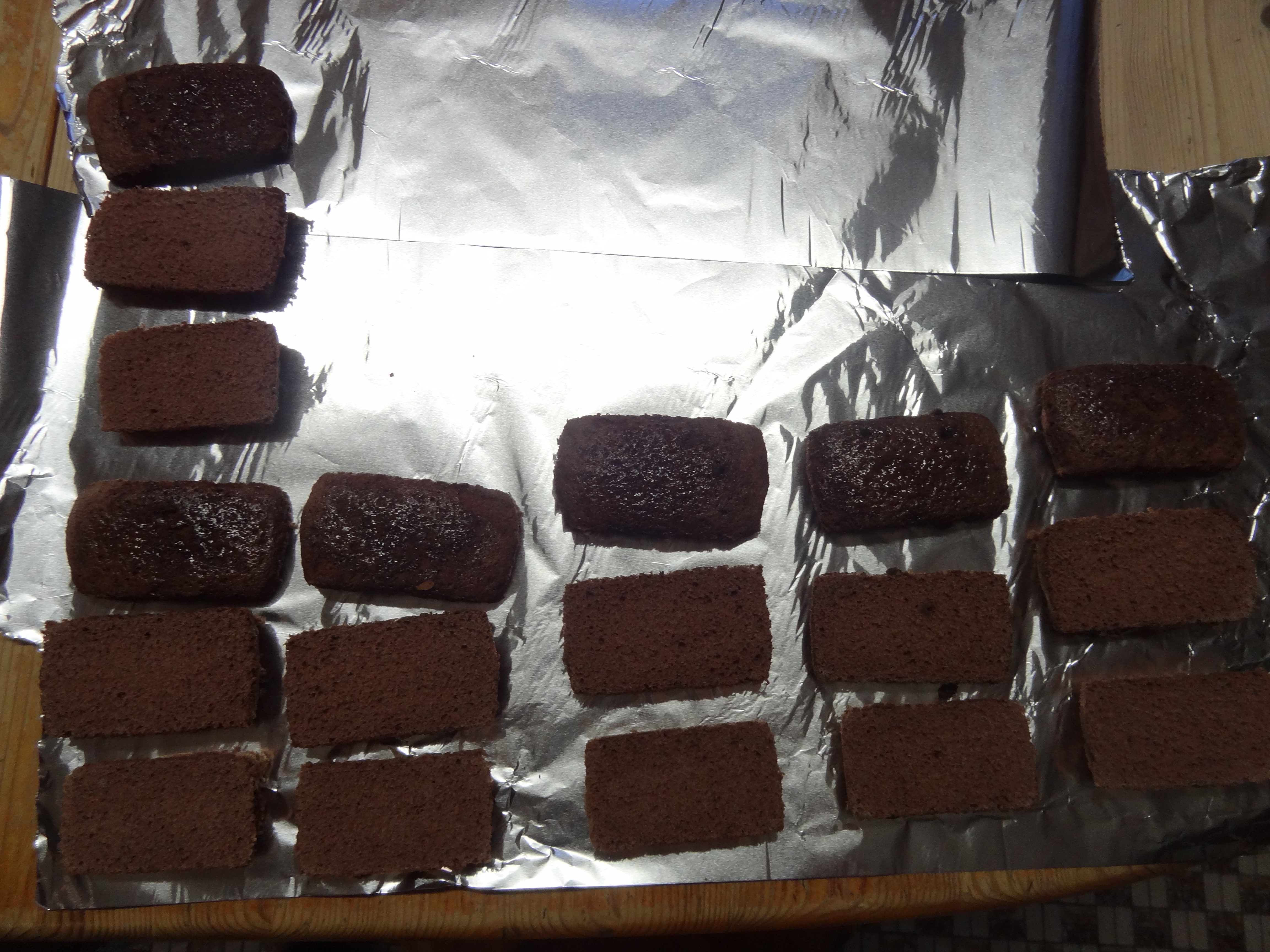 Das Mehl, Maizena, Kakaopulver und Backpulver vermischen und auf die Eimasse sieben. Das ganze dann vorsichtig mit einem Teigschaber unter die Masse ziehen, bis kein Mehl mehr zu sehen ist. Die Masse anschliessend auf die Förmchen verteilen und 20-30 Minuten backen. Am besten über Nacht komplett auskühlen und ruhen lassen, damit das zerteilen der Biskuits ohne Probleme gelingt.