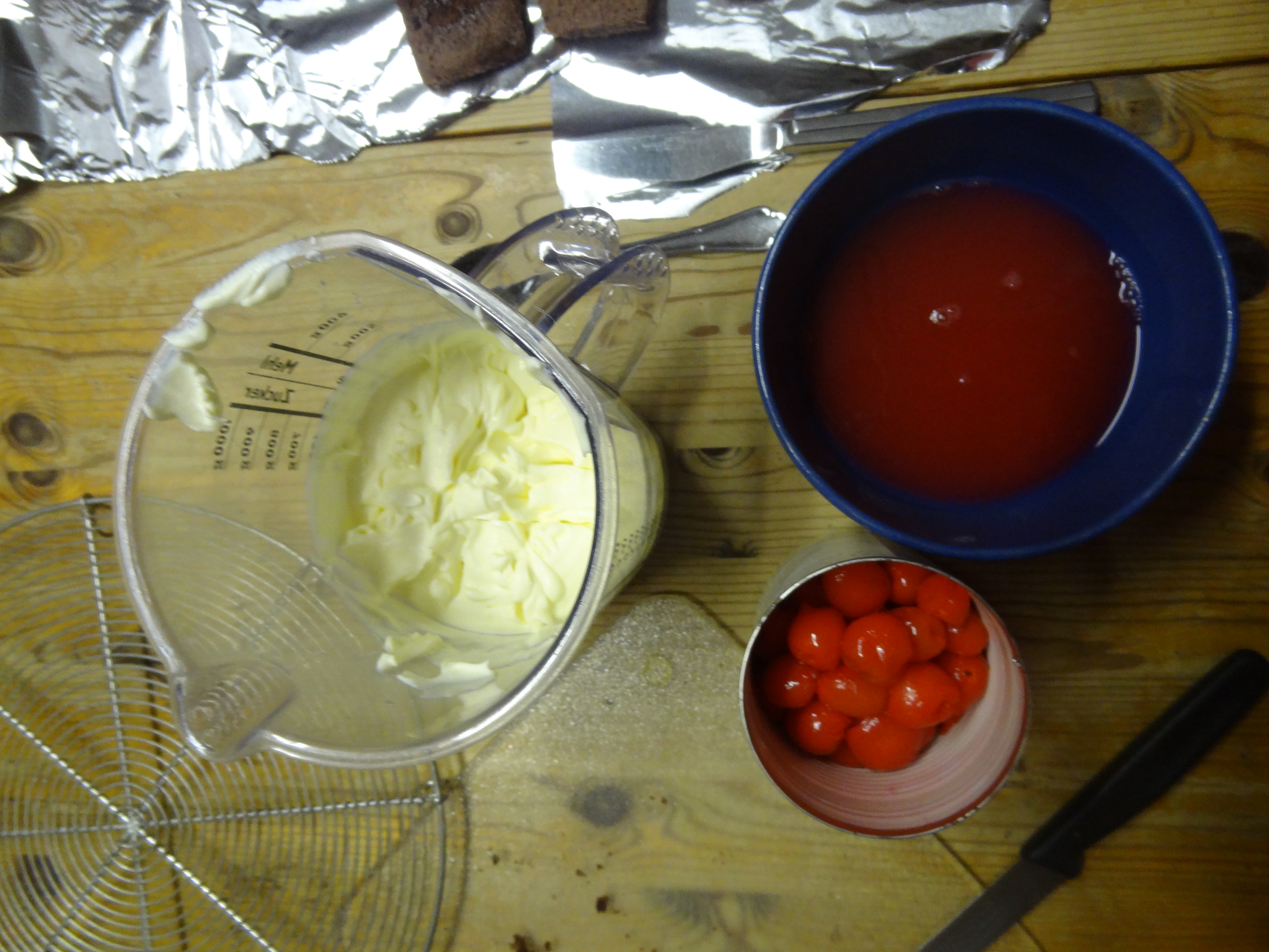 Den Rahm etwas schlagen, dann Rahmhalter, Puderzucker und Kirsch hinzufügen und weiterschlagen, bis die Masse steif und fest ist. Nach Belieben kann auch mehr oder weniger Zucker und Kirsch verwendet werden.Jetzt die Dose mit den Kirschen öffnen und den Saft in eine kleine Schüssel giessen.
