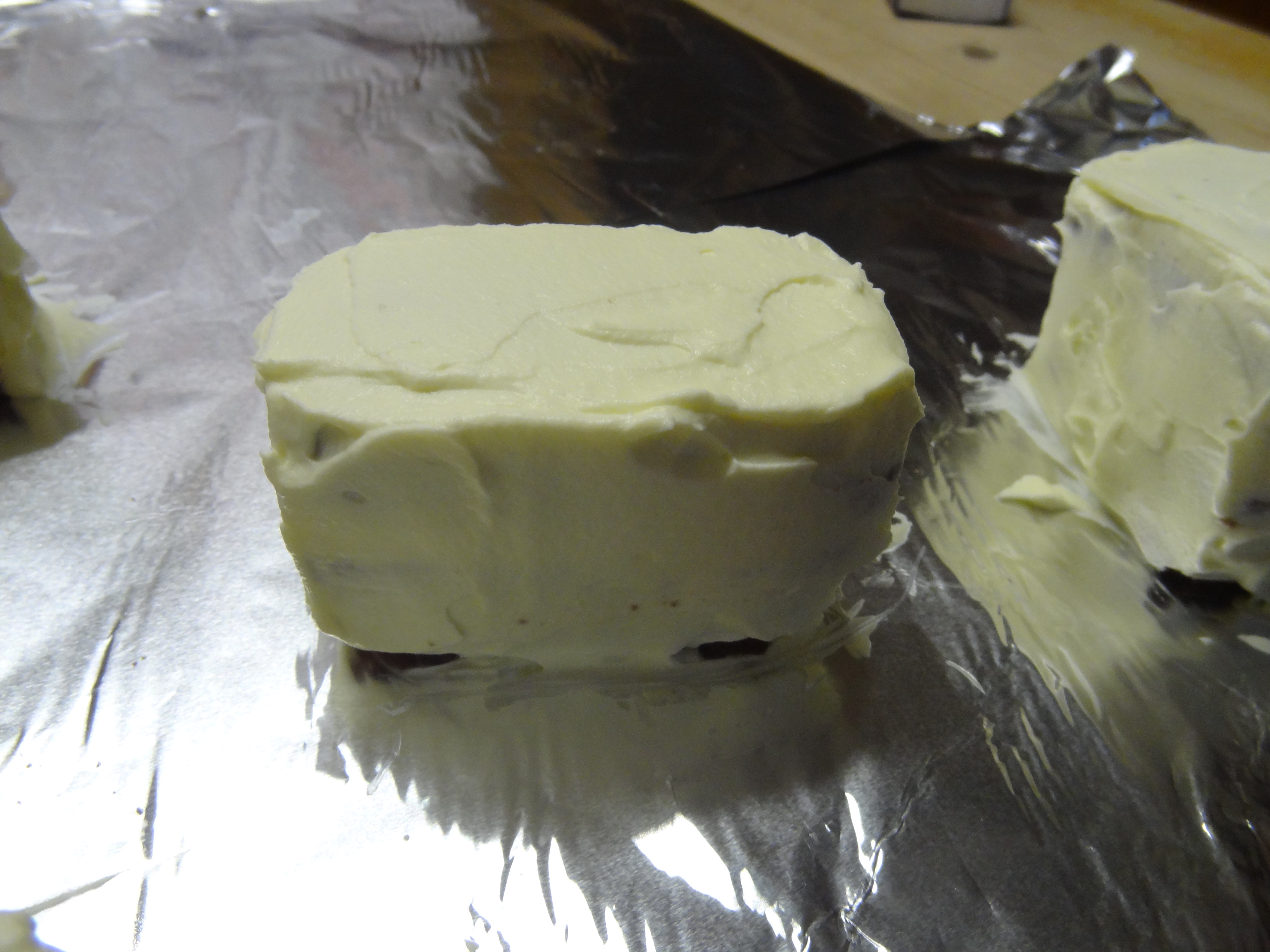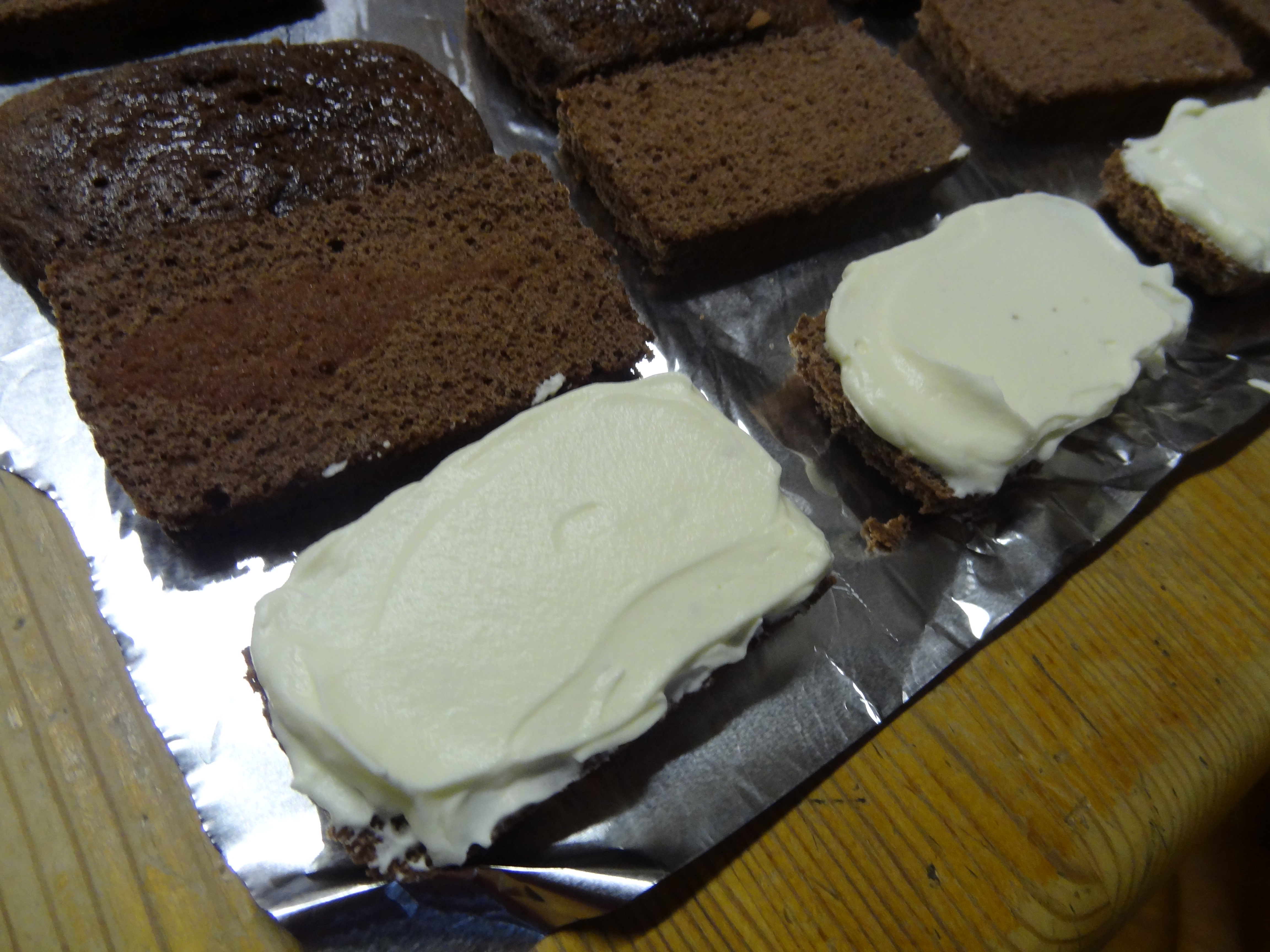 Am Folgetag jedes Biskuit aus den Förmchen lösen und zweimal waagrecht durchschneiden, sodass je drei gleich dicke Böden entstehen. Alle Biskuits auf eine grosse Alufolienfläche legen.