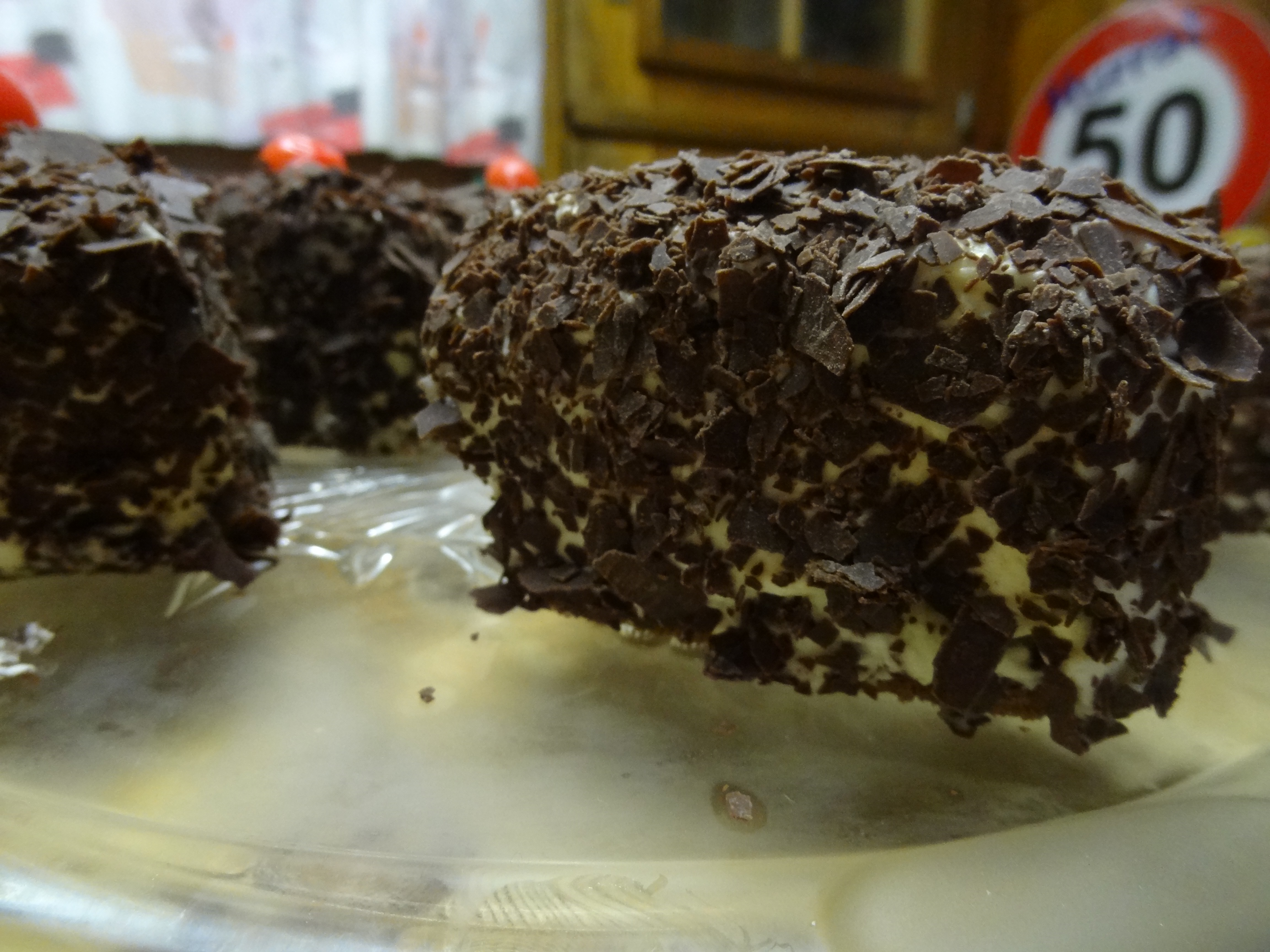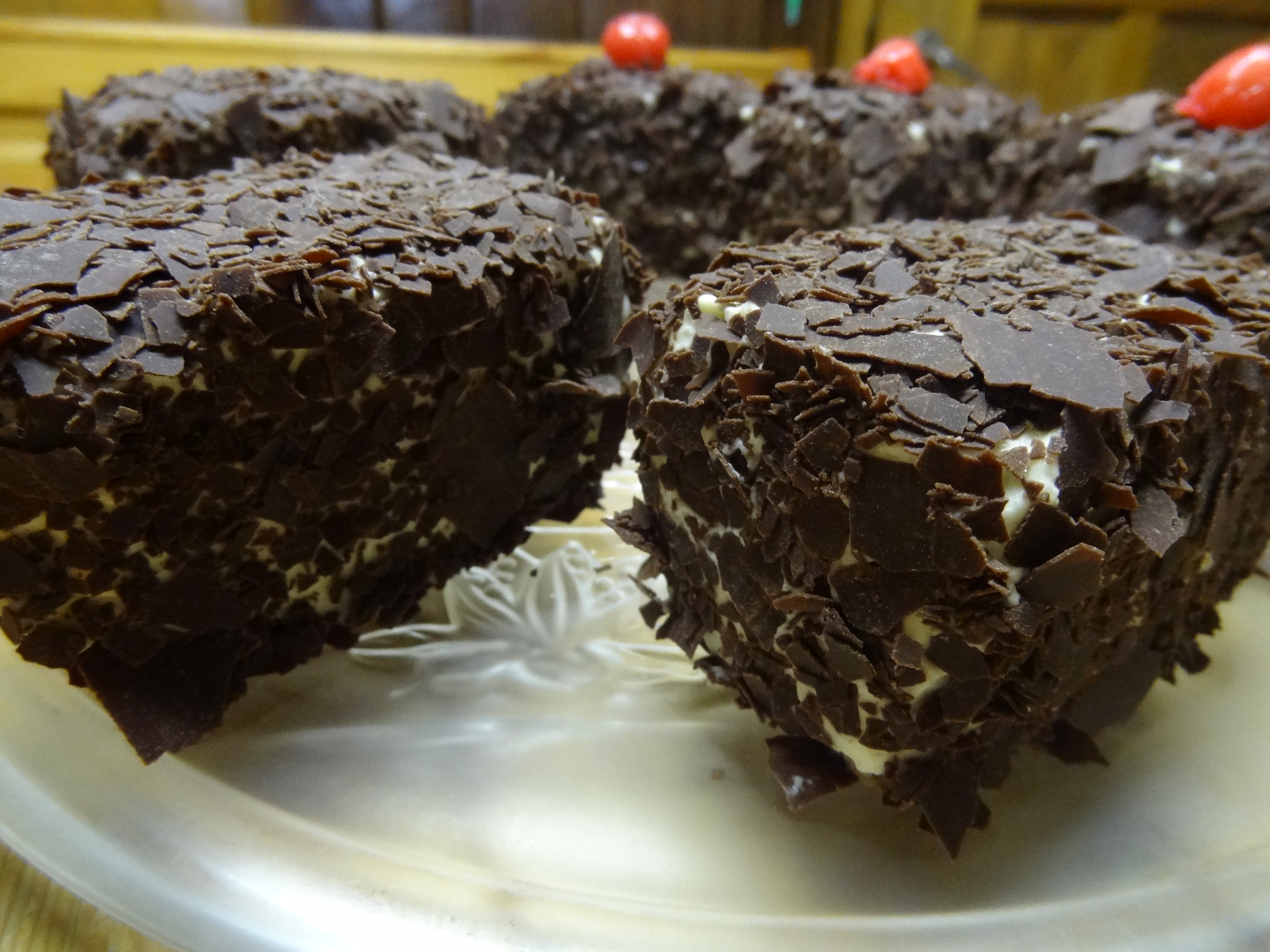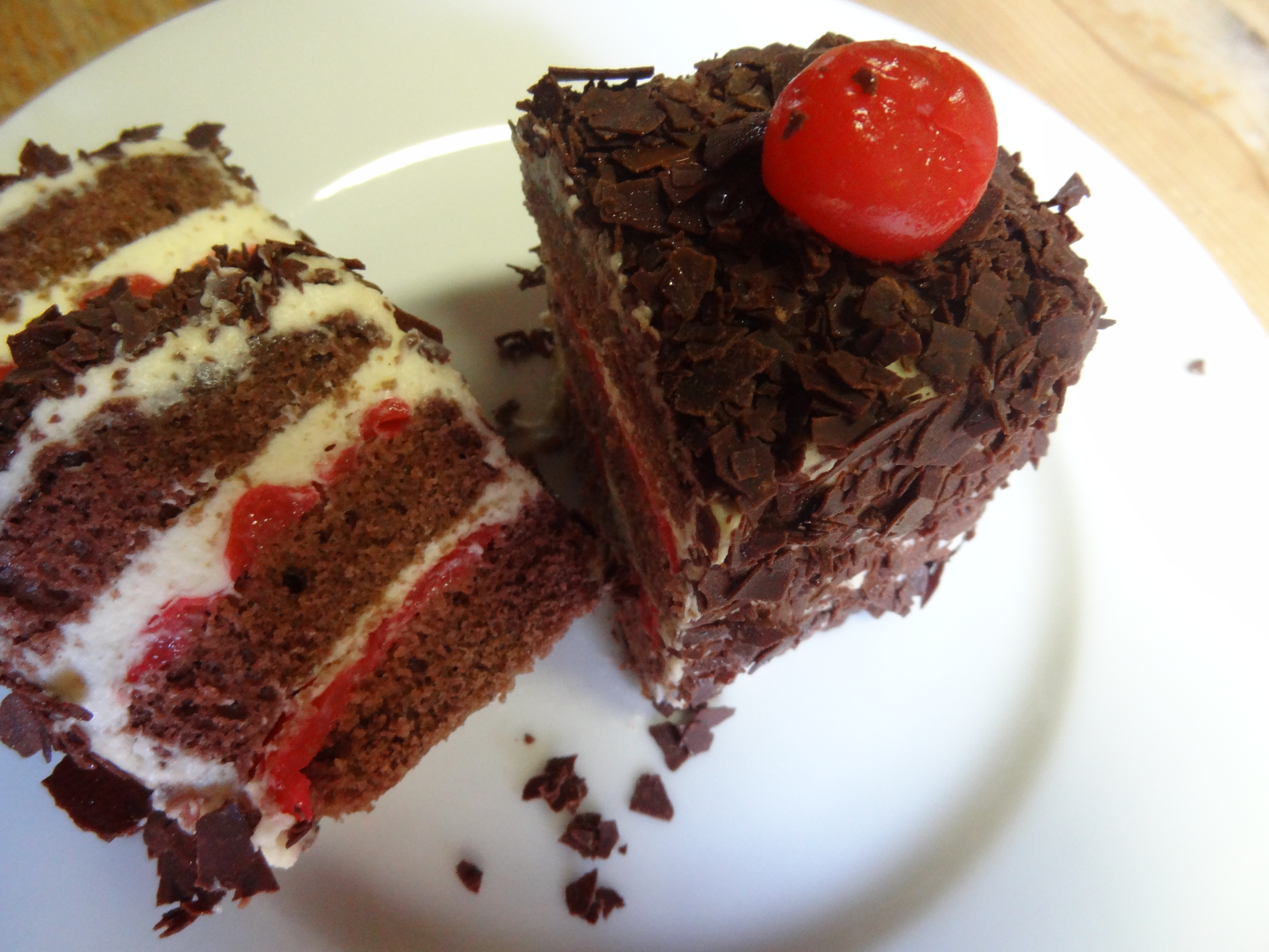 Für das Biskuit habe ich das Teigrezept der Schweinchen Matschparty Torte einfach halbiert und damit 6 Mini-Cakes gebacken. Am Folgetag habe ich sie ganz klassisch mit oder ohne Kirschen, geschlagenem Rahm und etwas Kirsch gefüllt, rundherum eingestrichen und mit Schokoladenspänen bedeckt. Die Fotos sind leider nicht wahnsinnig toll geworden. Süss sahen die Törtchen aber auf jeden Fall aus. Und das allerwichtigste: Ich konnte meinen Bruder obwohl er ja schon wusste was er bekommen würde, trotzdem noch überraschen und begeistern…Ziel erreicht!