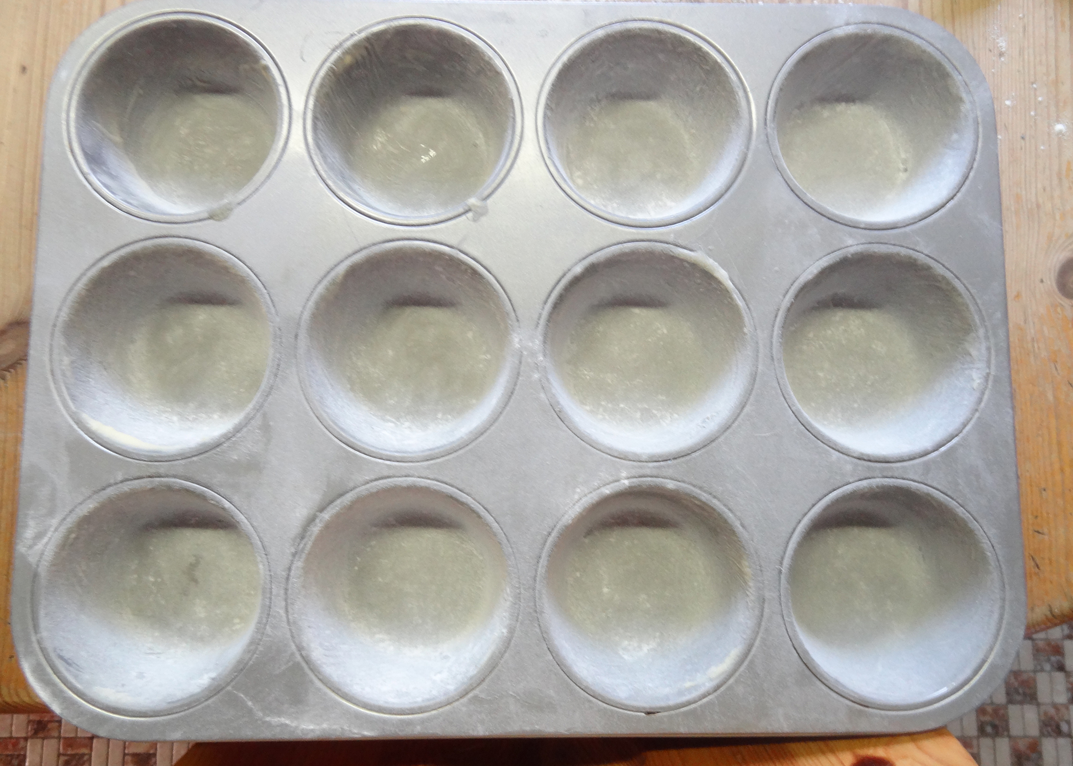 Den Backofen auf 175° vorheizen. Ein Muffinblech mit 12 Vertiefungen sehr gut einfetten und bemehlen.