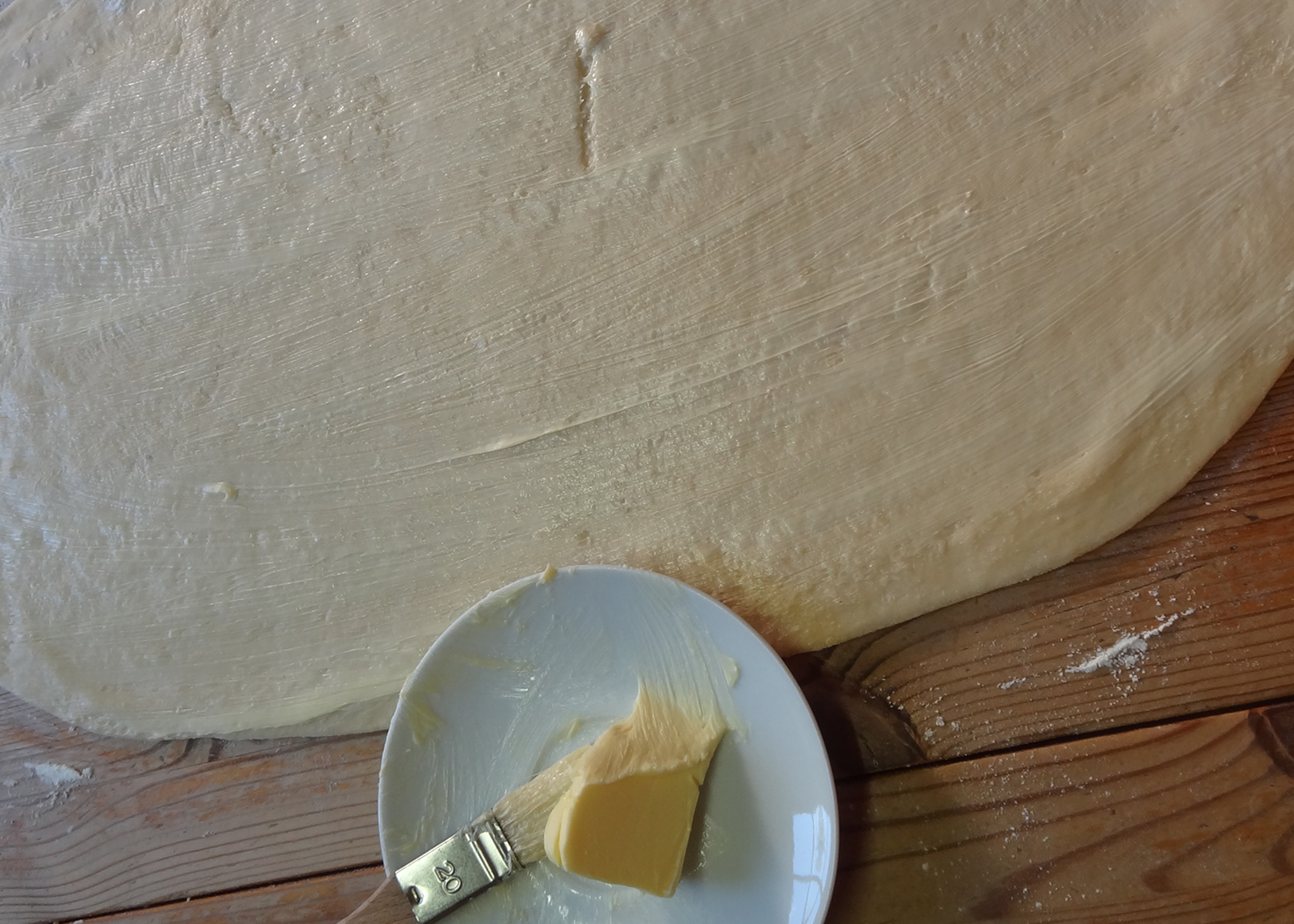 Den Teig von Hand auf einer bemehlten gut kneten, bis er geschmeidig ist und nicht mehr klebt. Um diesen nun zu verarbeiten, die Arbeitsfläche erneut etwas bemehlen und den Teig in ein 30x60cm grosses Rechteck rollen. Dann die weiche Butter darauf verstreichen. Anschliessend die vorbereitete Füllung auf dem kompletten Rechteck verteilen.