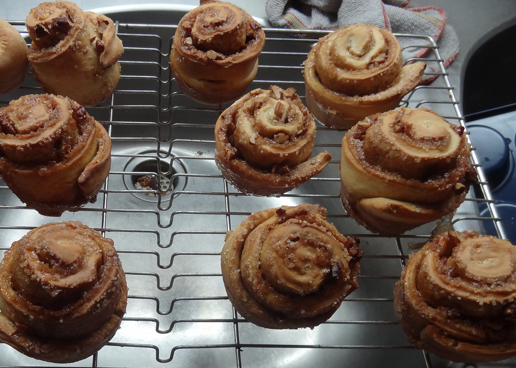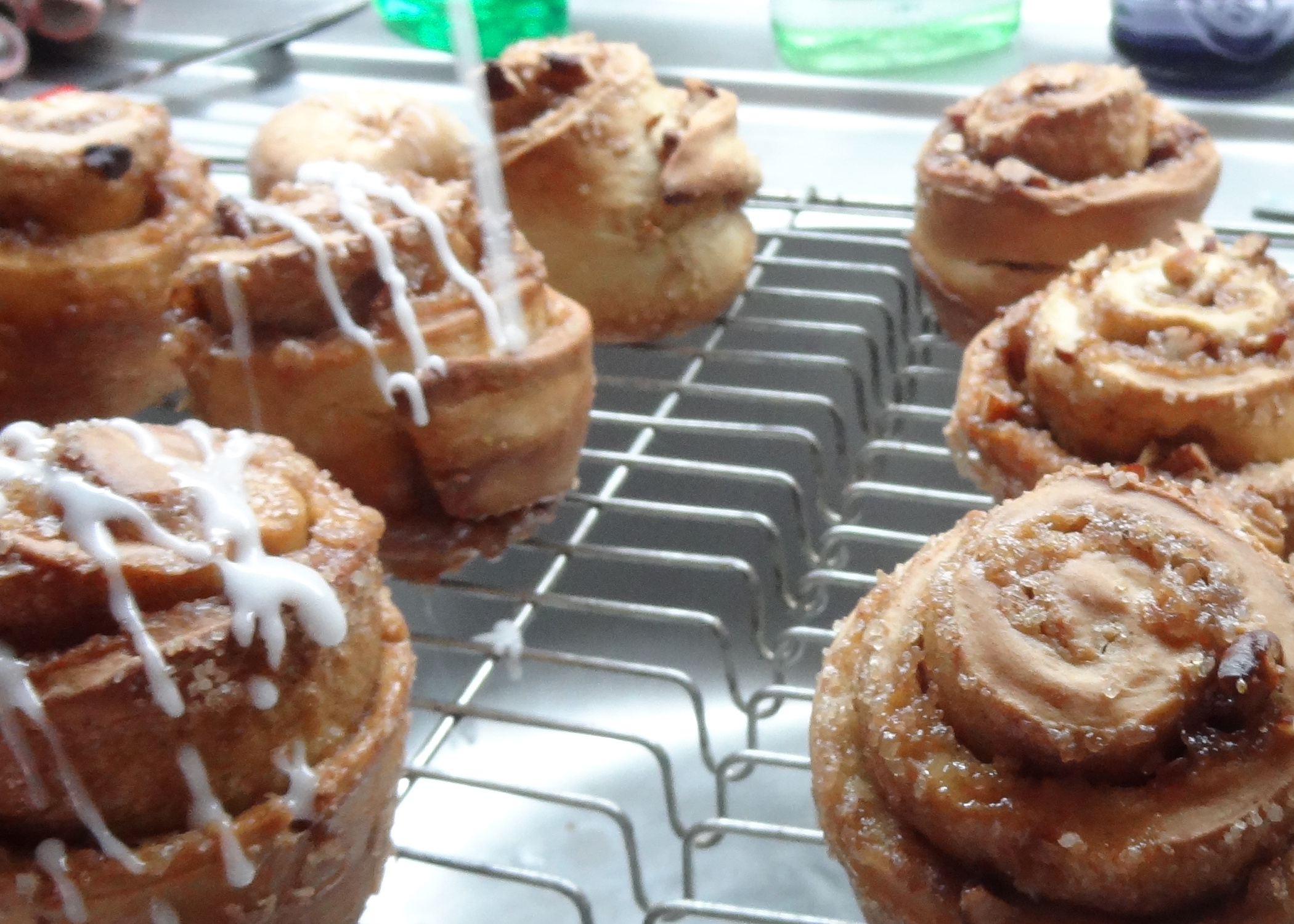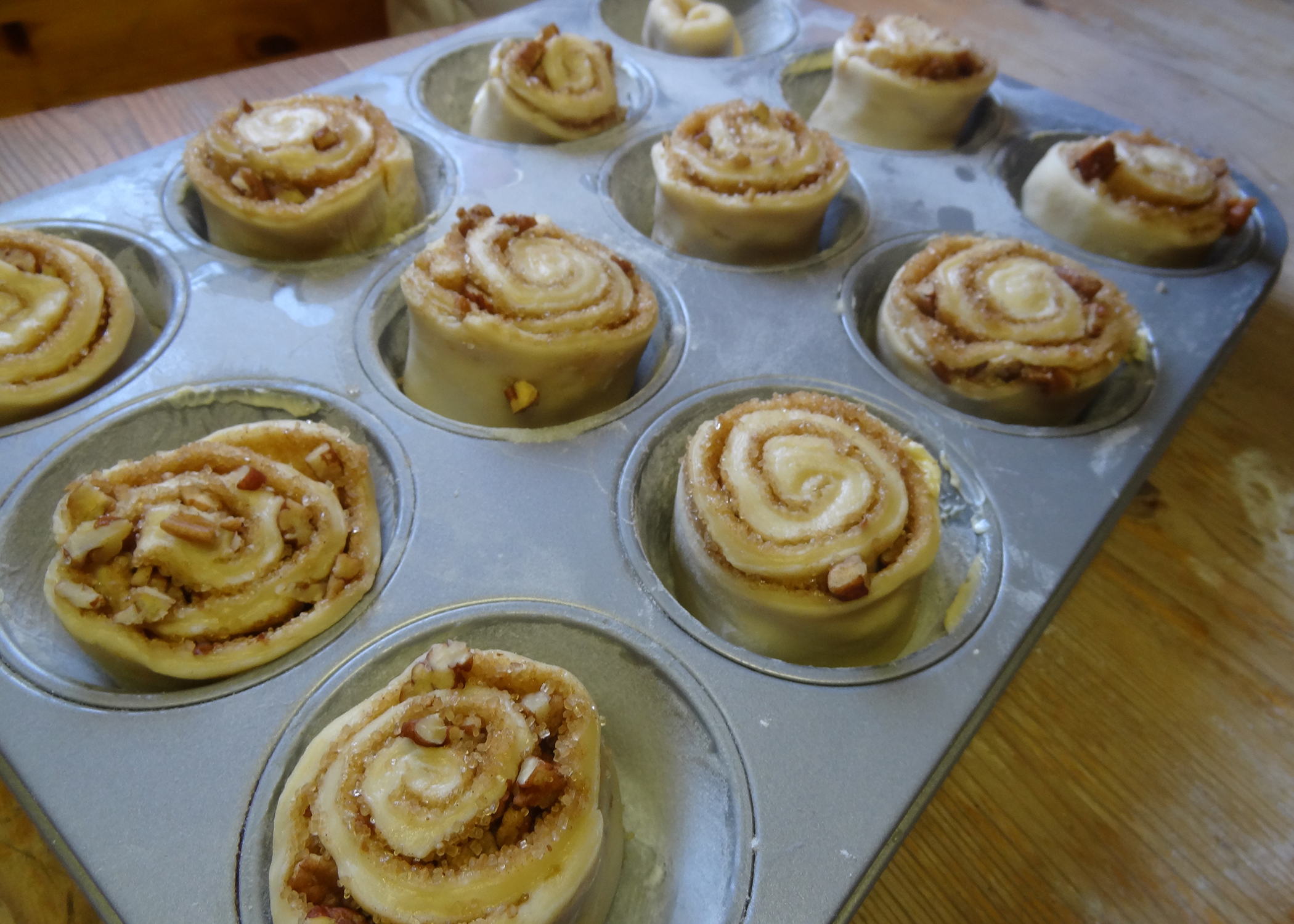 Mit dem Wallholz einige Male über die Füllung rollen. Anschliessend den Teig von der langen Seite aus fest aufrollen. Die Rolle dann in 12 gleich grosse Stücke schneiden und diese in die Vertiefungen des Muffinbleches legen. Die Rollen für ca. 16-18 Minuten im Ofen backen, und nach ca. 5min Auskühlzeit vorsichtig aus den Vertiefungen nehmen und auf ein Gitter stellen.