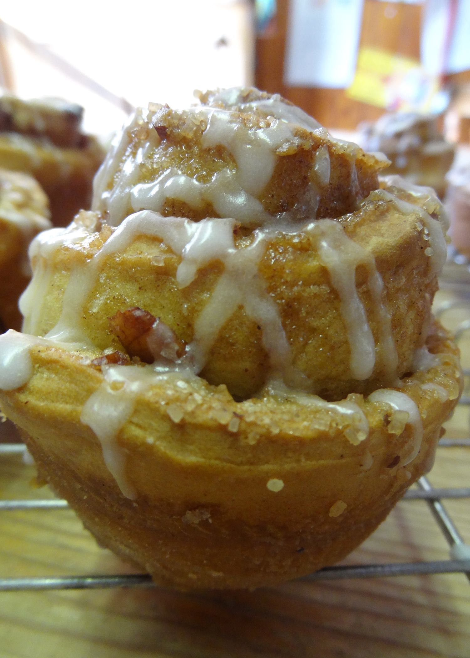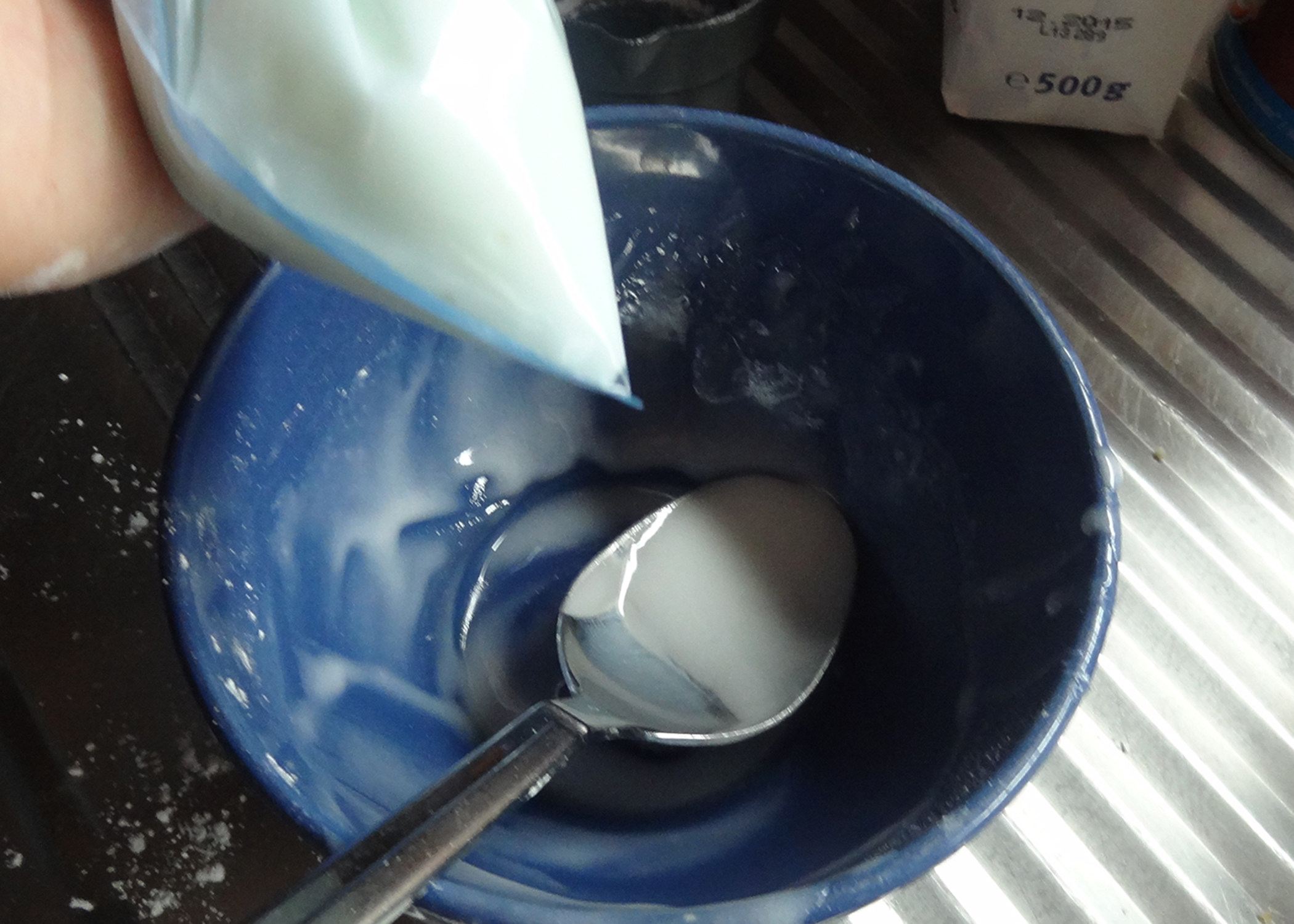 Für die Glasur Puderzucker und Milch gut verrühren. Denn Guss dann in einen Plastikbeutel füllen, eine kleine Ecke davon abschneiden und die noch warmen Rollen damit verzieren.