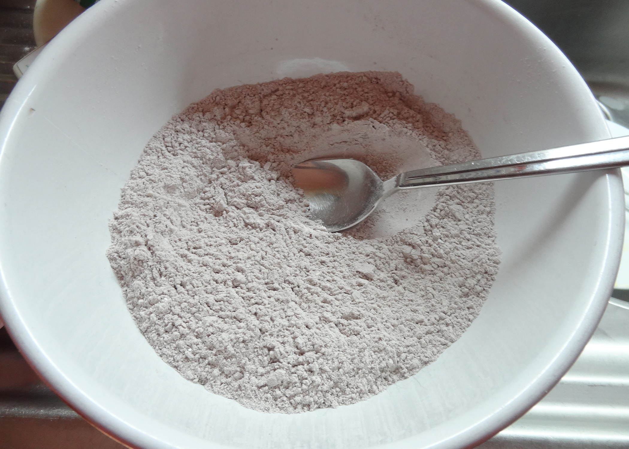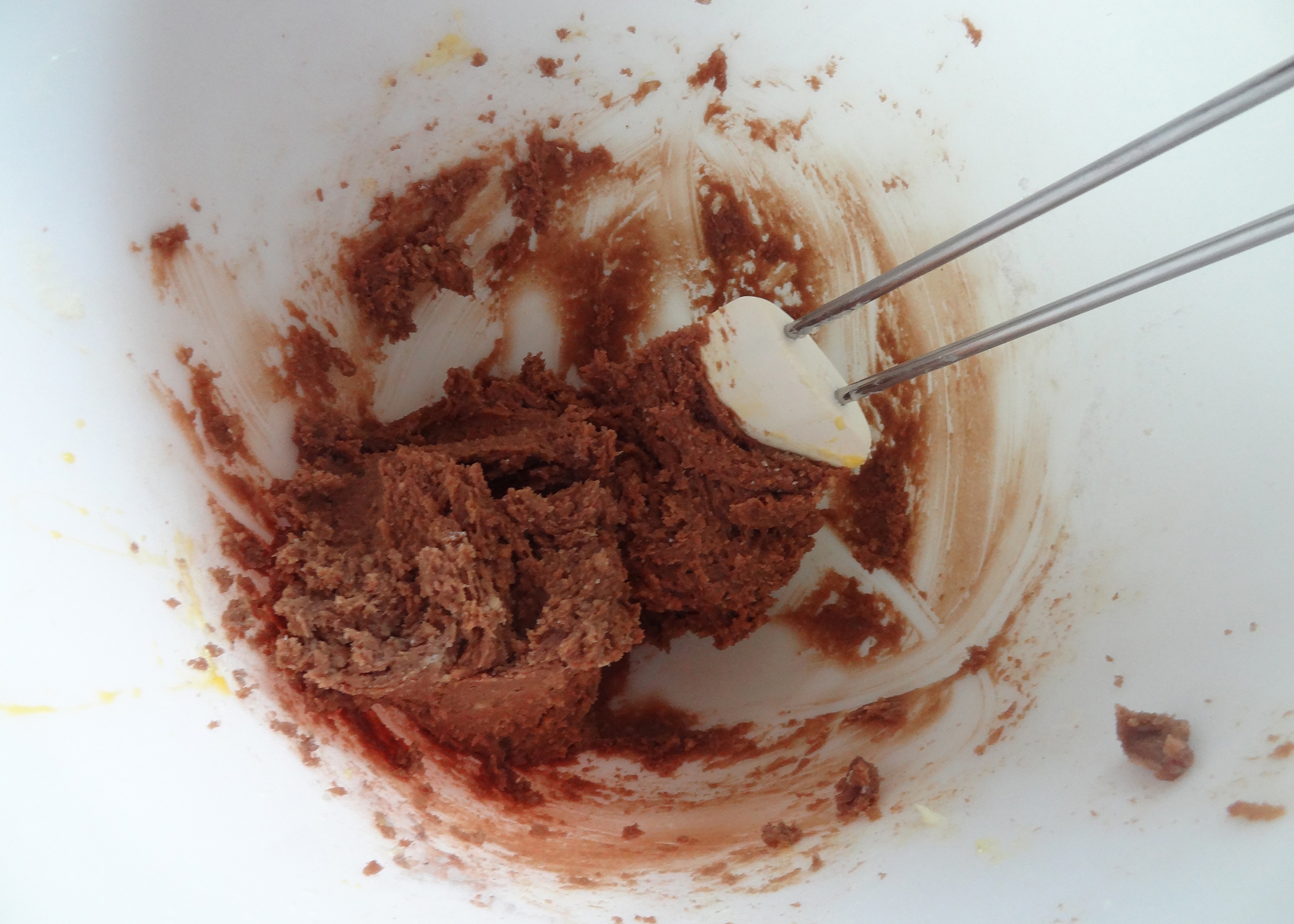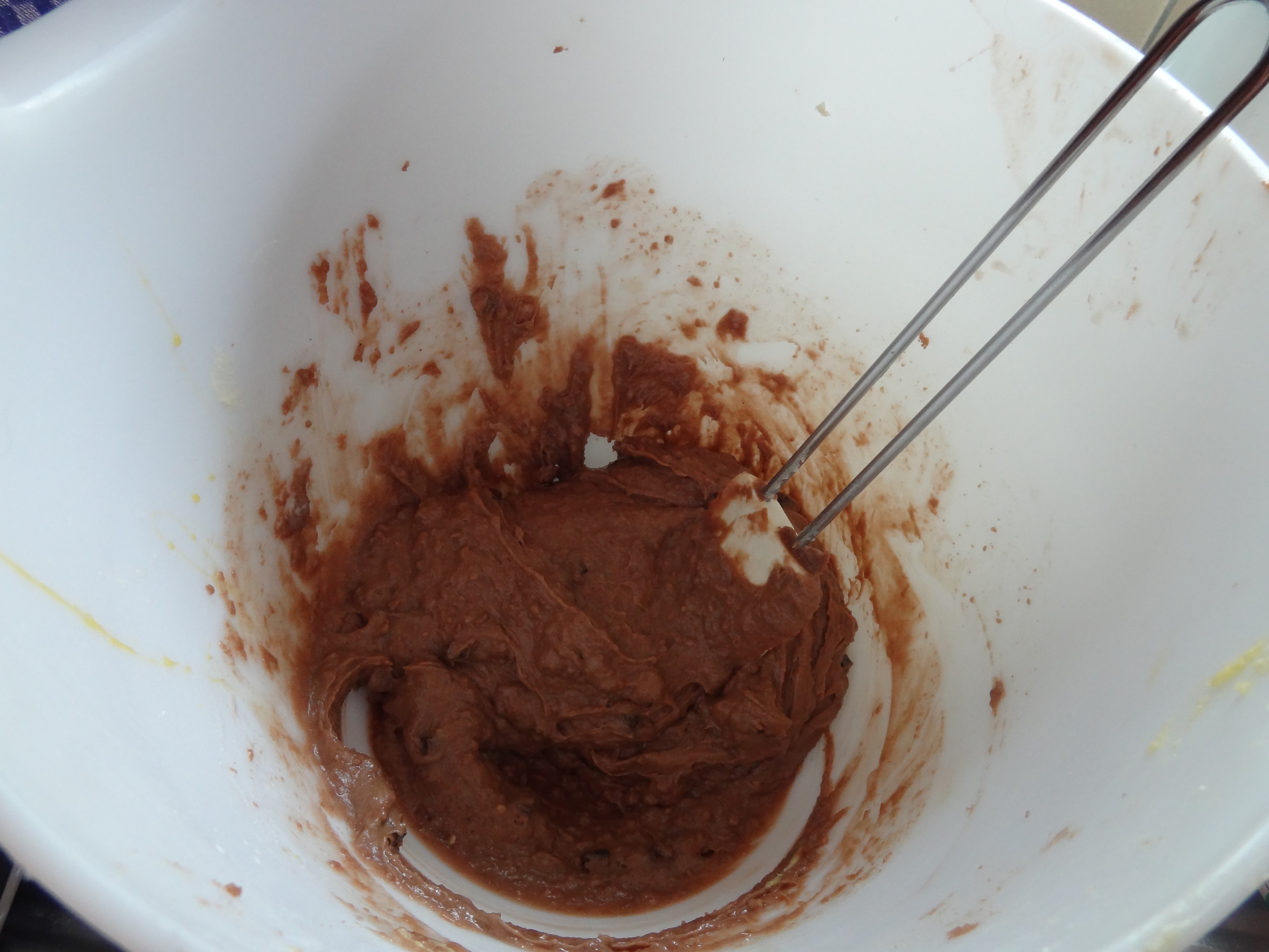 Als nächstes das Mehl, Kakaopulver, Salz und die gemahlenen Mandeln in einer Schüssel vermischen und gemeinsam mit der Milch unter die Buttermasse rühren. Dann die Schokoladenwürfel darunter mischen.