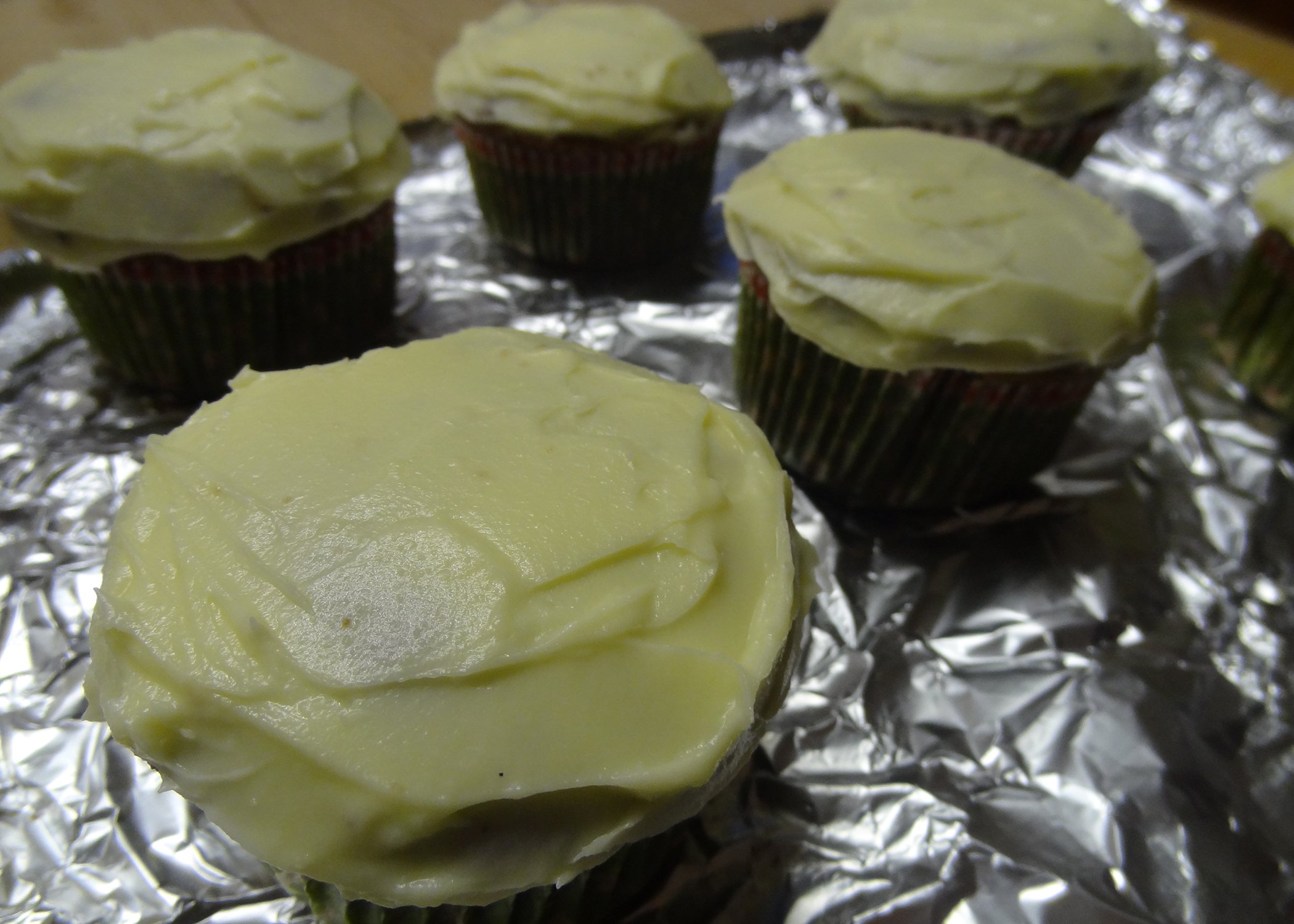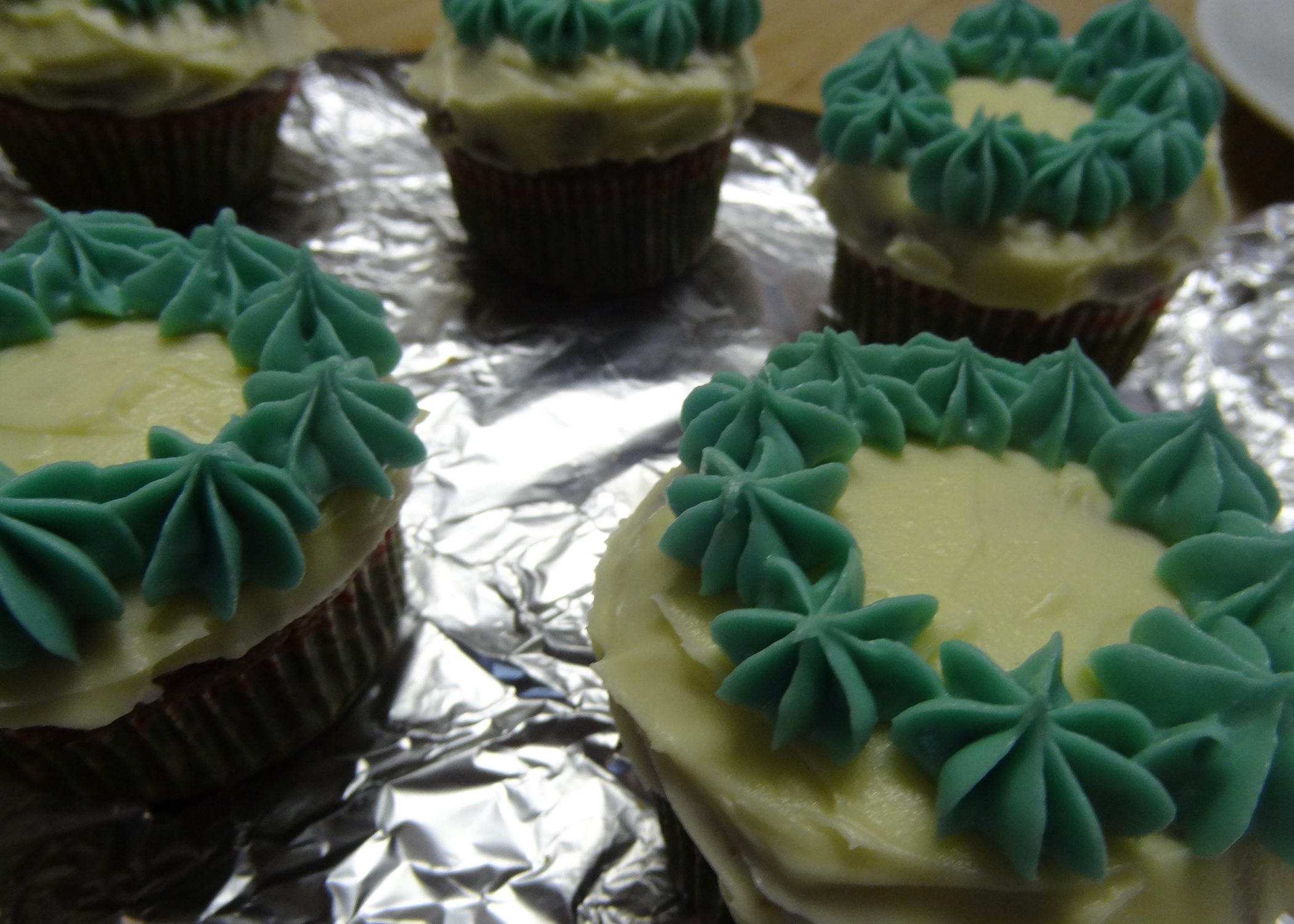 Als wir nach tollen Adventsgebäcken (nebst Guetzlis) suchten, stiessen wir auf ein paar tolle Cupcakes, welche mit einem Adventskranz verziert waren. Sofort machte ich mich daran, diese Idee selbst zu realisieren. Was ich dazu benötigte waren ein simples Teigrezept und ein Frosting, ausserdem noch etwas Lebensmittelfarbe und Dekomaterial. Wenn mich die Lebensmittelfarbe nicht komplett im Stich gelassen hätte, wäre das Resultat wahrscheinlich wirklich sehenswert geworden…