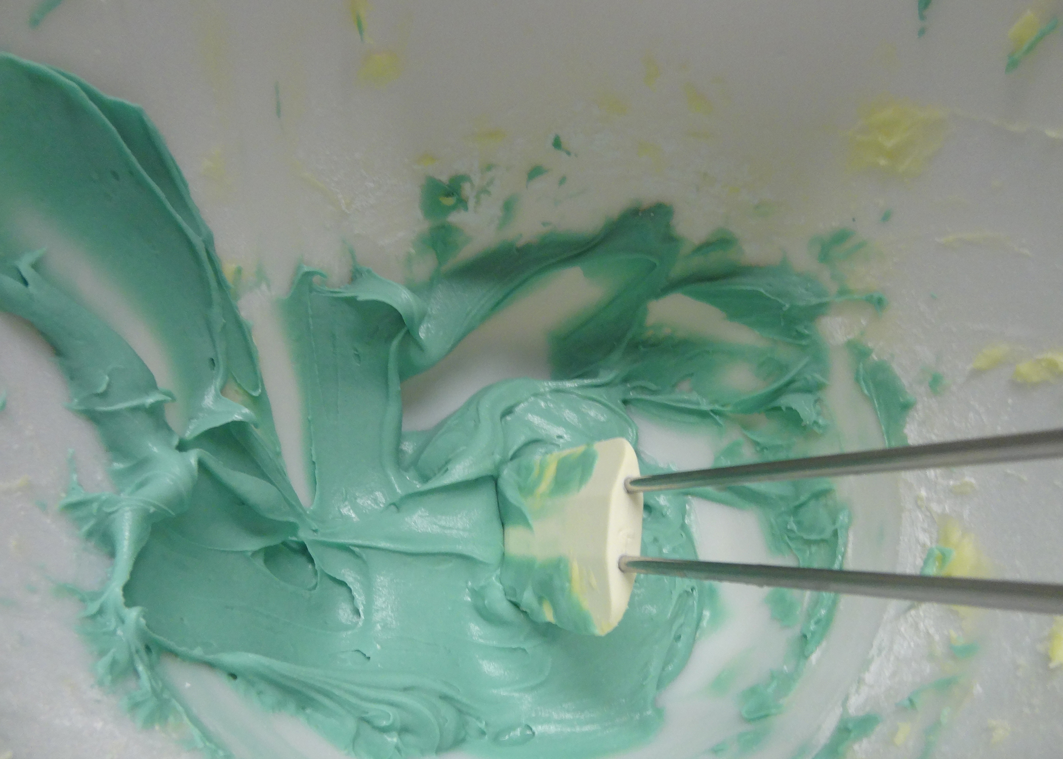 Nun grüne Lebensmittelfarbe unter das Frosting mischen. Ich habe flüssige Farbe verwendet und wie ihr sehen könnt war das Resultat nicht unbedingt berauschend. Ausserdem musste ich noch einiges an Puderzucker hinzufügen, weil das Frosting durch die flüssige Farbe and Festigkeit verlor. Falls ihr also irgendwo Pulverfarbe auftreiben könnt, braucht unbedingt diese.