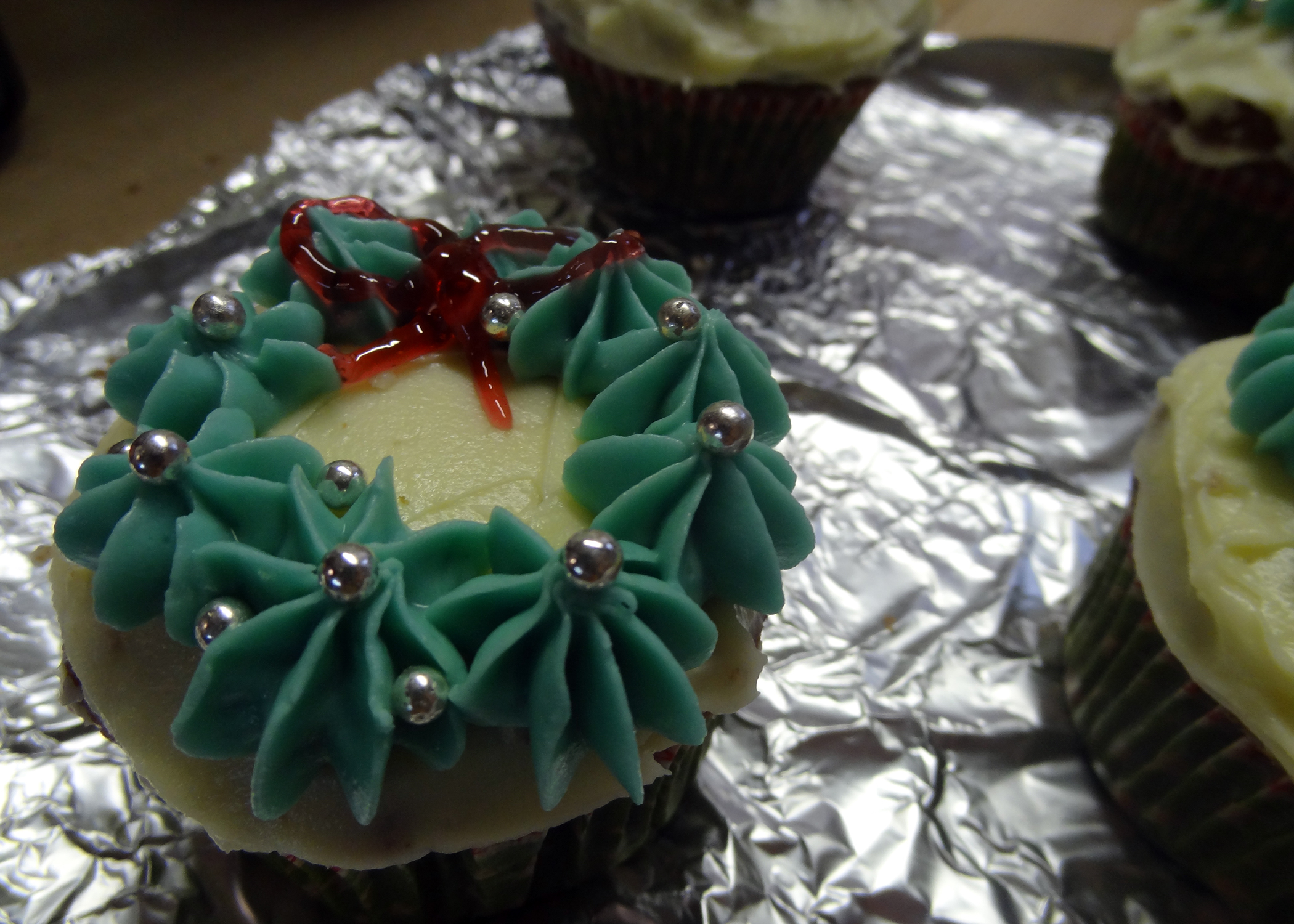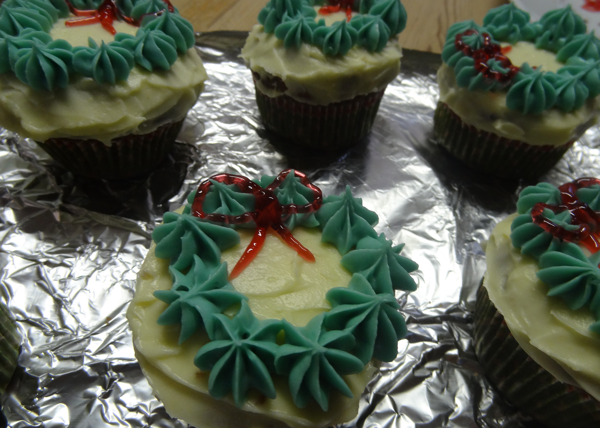 Den Adventskranz auf die Cakes zu spritzen ist nämlich überhaupt nicht schwierig und eine Schleife zu „zeichnen“ bekam ich nach ein paar mal üben auch noch hin. Leider ist der Adventskranz jedoch eher blau-grün statt dunkelgrün geworden. Ohne Tipp von meiner Seite, wurden die Cupcakes darum leider von niemandem als Adventskränze erkannt, über den Geschmack hat sich jedoch niemand beklagt, und schlussendlich ist das die Hauptsache.