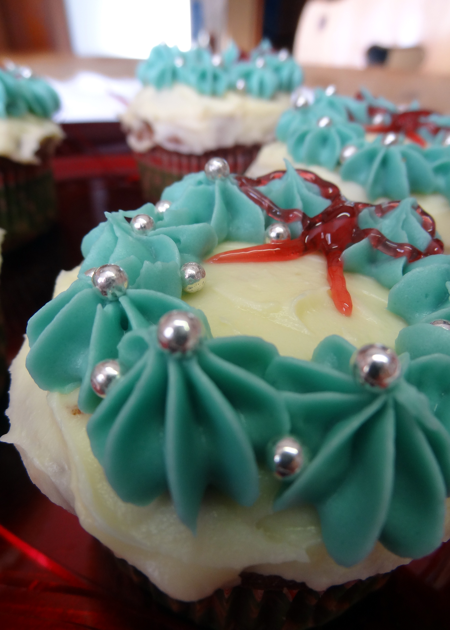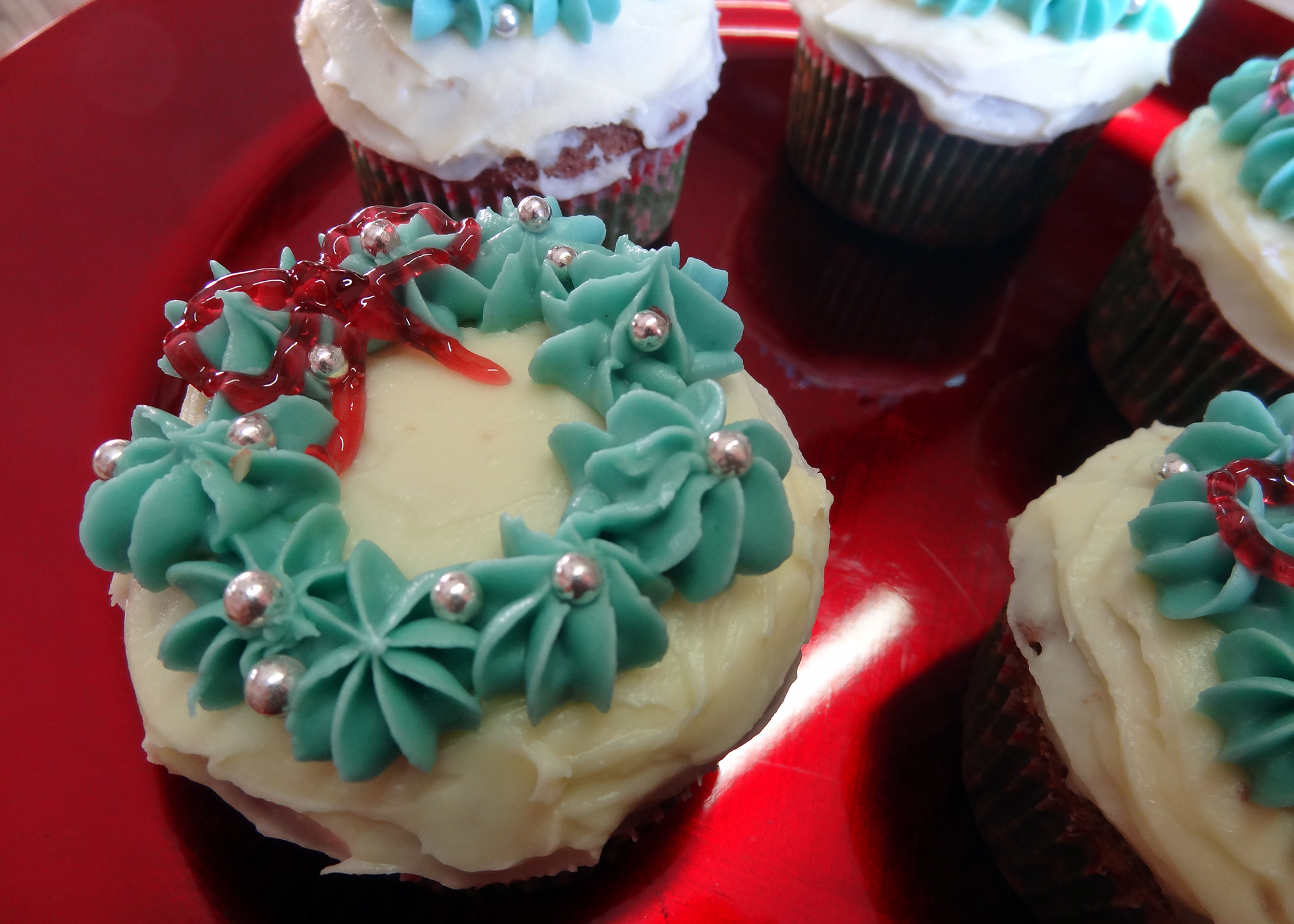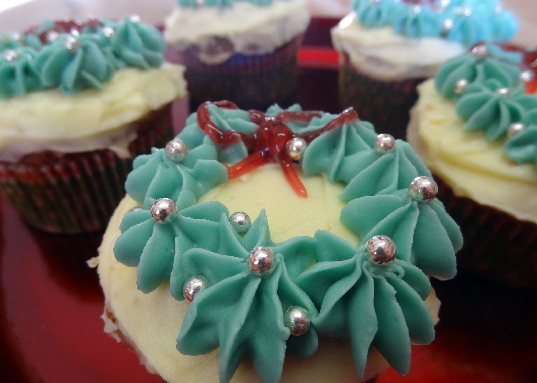 Das grüne Frosting anschliessend in einen Spritzsack mit Sterntülle füllen und auf jedes Cupcake einen Kranz aus kleinen „Tupfern“ spritzen. Mit der roten Dekofarbe anschliessend eine Schlaufe auf den „Kranz“ zeichnen und die Cupcakes nach belieben mit Zuckerperlen dekorieren.