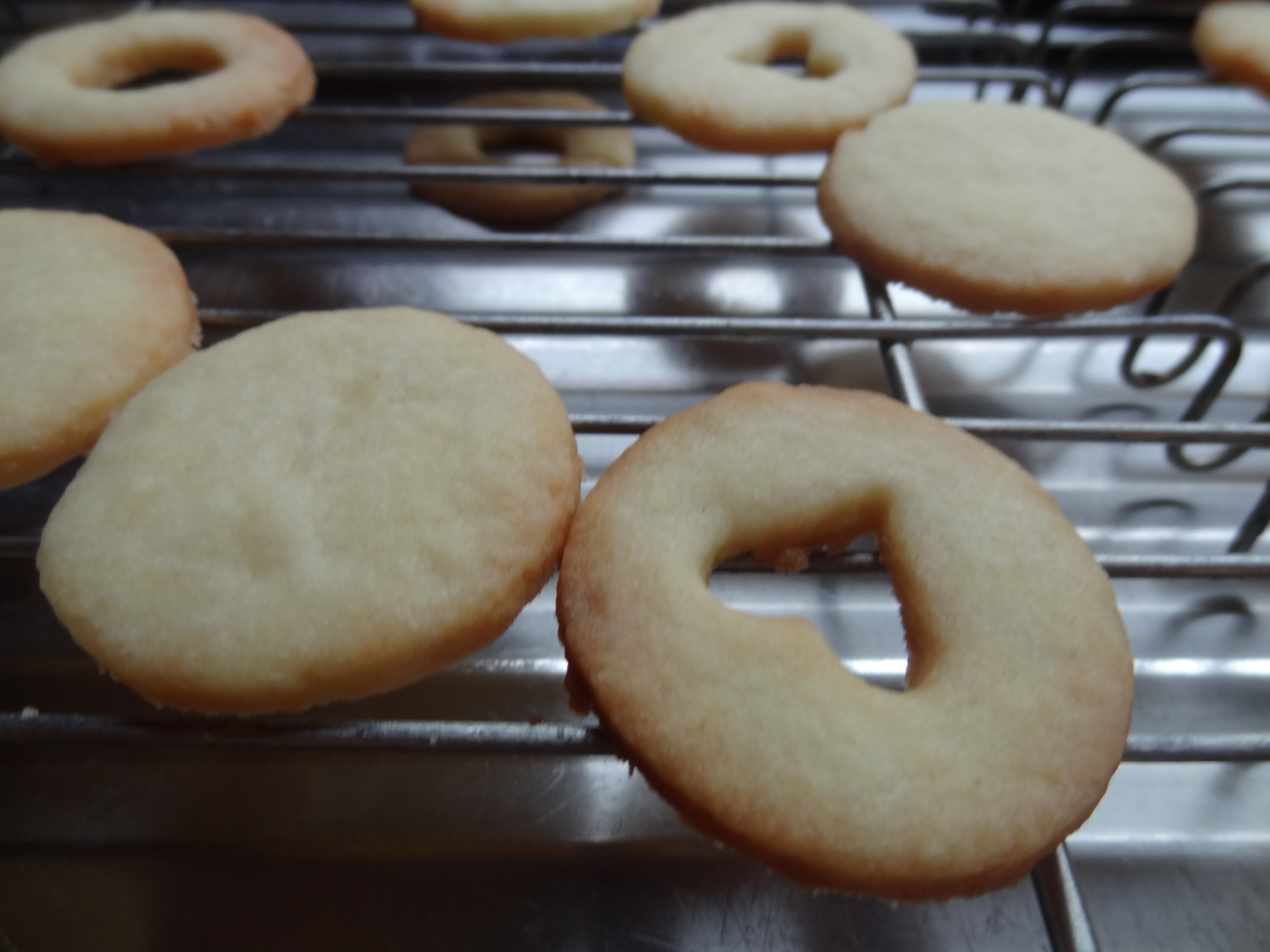 Danach den Teig portionsweise auf Mehl 3mm dick auswallen. Dann kann mit dem Ausstechen begonnen werden. Nicht vergessen: die Hälfte der Plätzchen dienen als Boden und sollten kein Loch in der Mitte haben und die andere Hälfte mit Loch dient als Deckel.