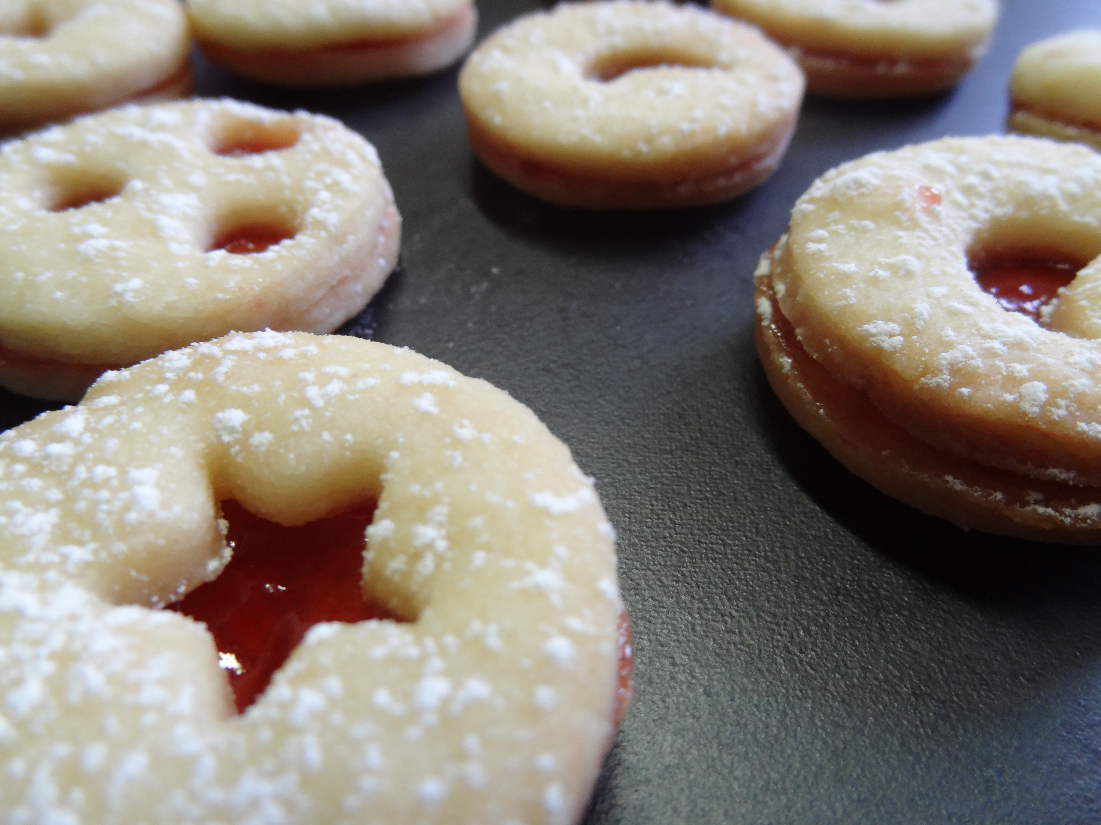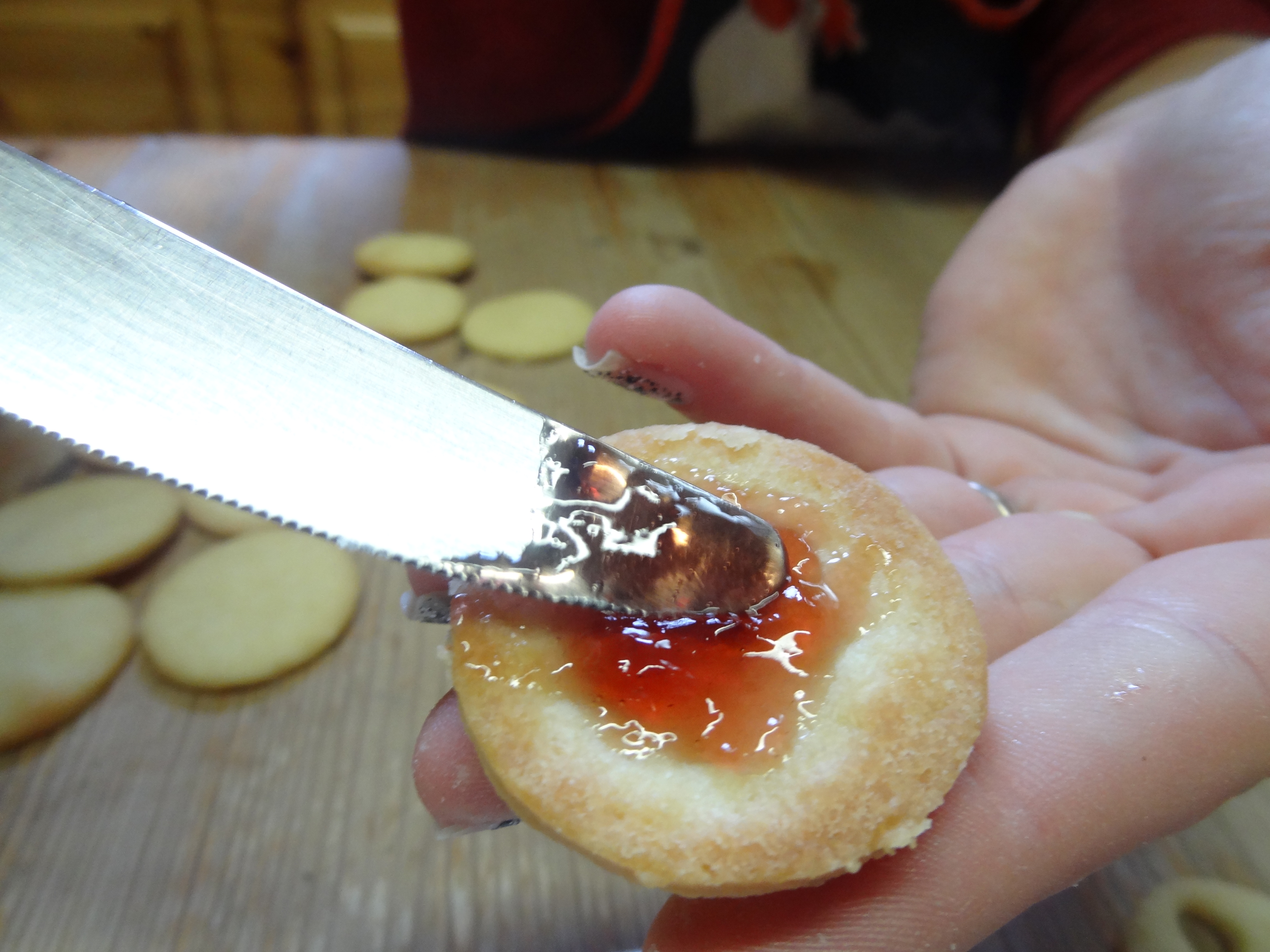 Nach dem Backen die Deckel und Boden auf einem Gitter auskühlen lassen. Bevor sie gefüllt werden, das Beerengelee in der Mikrowelle oder in einer Pfanne erwärmen und anschliessend auf die Böden verteilen.