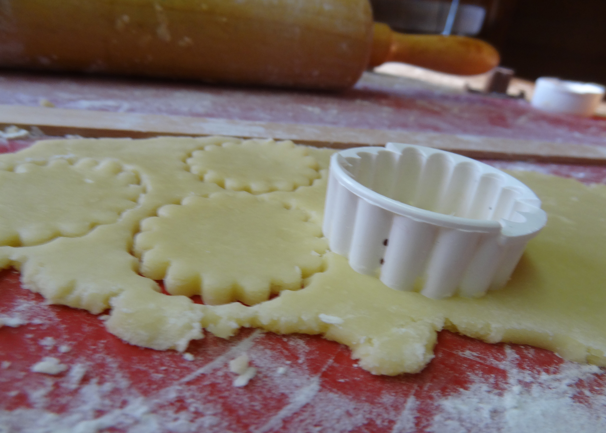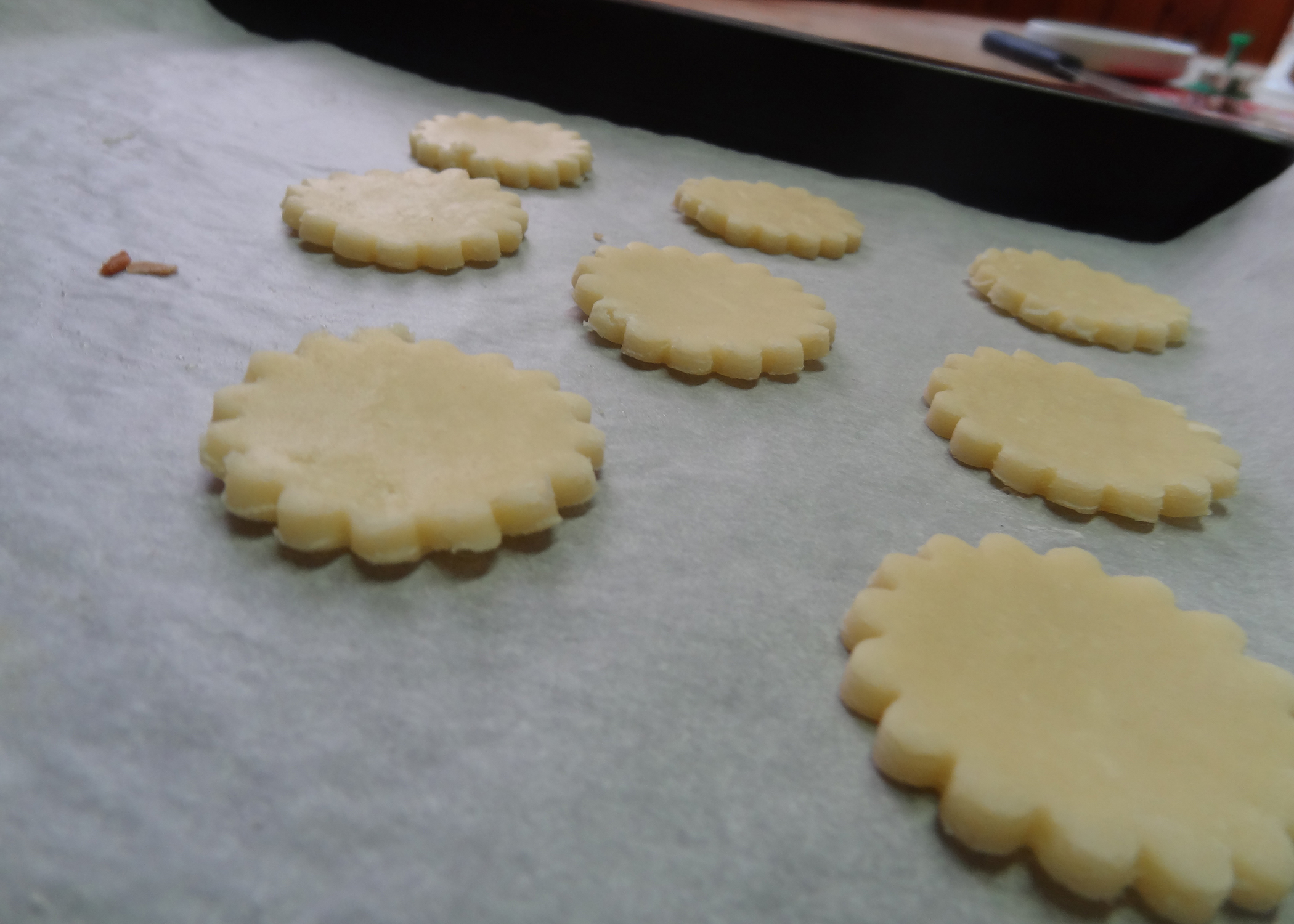 Für die Verarbeitung den Backofen auf 180°C Umluft vorheizen und den Teig portionenweise 3mm dick auf einer gut bemehlten Arbeitsfläche auswallen und Rondellen von ca. ø3cm ausstechen. Diese auf ein mit Backpapier ausgelegtes Blech legen Da wir es ein bisschen interessanter fanden, haben wir etwas spezielle Rondellen Ausstecher benützt, sodass die Guetzli nicht wie blosse Kreise aussehen. Jedes Blech zuerst mind. 20min kühl stellen und im Anschluss 5-6min backen. Alle Rondellen auf einem Gitter auskühlen lassen.