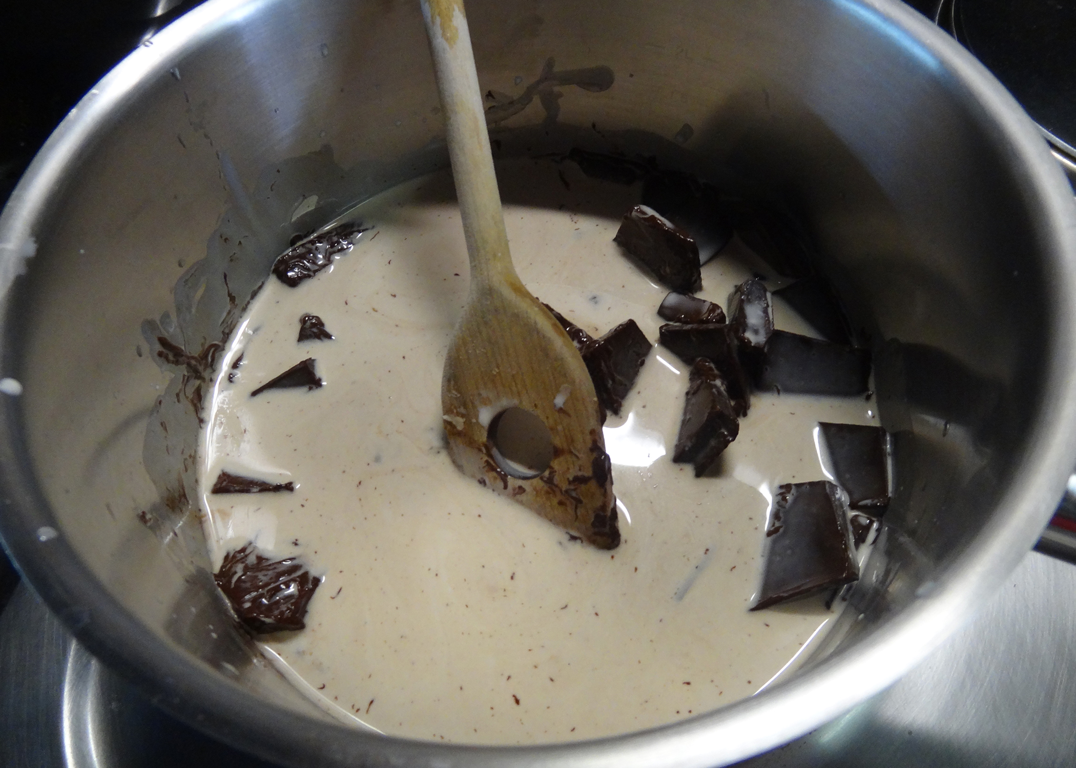 Für die Füllung alle Zutaten in eine kleine Pfanne geben und bei mittlerer Stufe solange erhitzen, bis die Schokolade komplett geschmolzen ist. Die Masse in eine kleine Schüssel giessen und kühl stellen. Am besten während des Auskühlprozesses die Füllung immer wieder etwas umrühren. Die Masse sollte fest, aber noch formbar werden. Dieser Prozess dauert je nachdem ca. 45min, habt aber jedoch immer ein wachsames Auge auf die Füllung, denn wenn sie zu hart ist, müsst ihr sie wieder schmelzen und alles beginnt wieder von vorne…