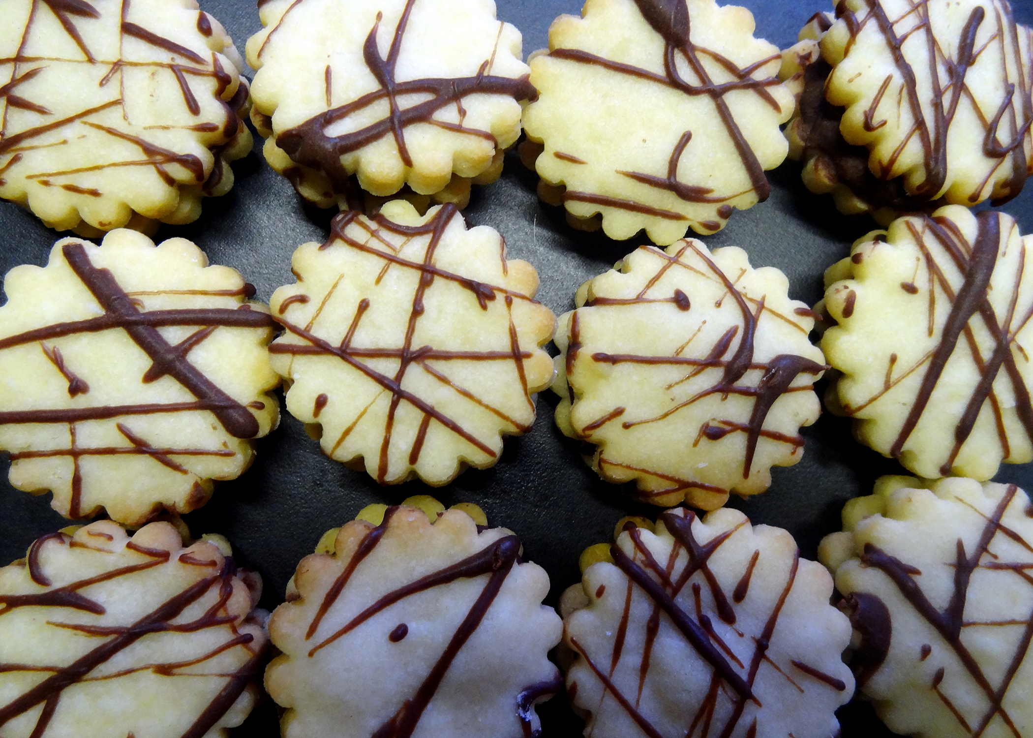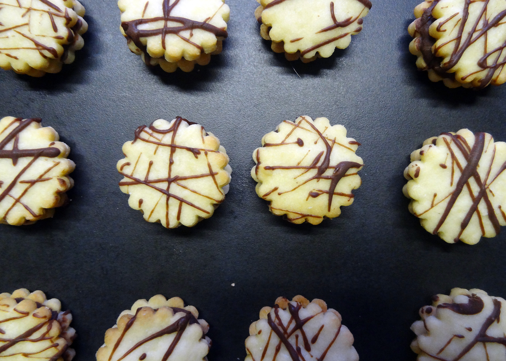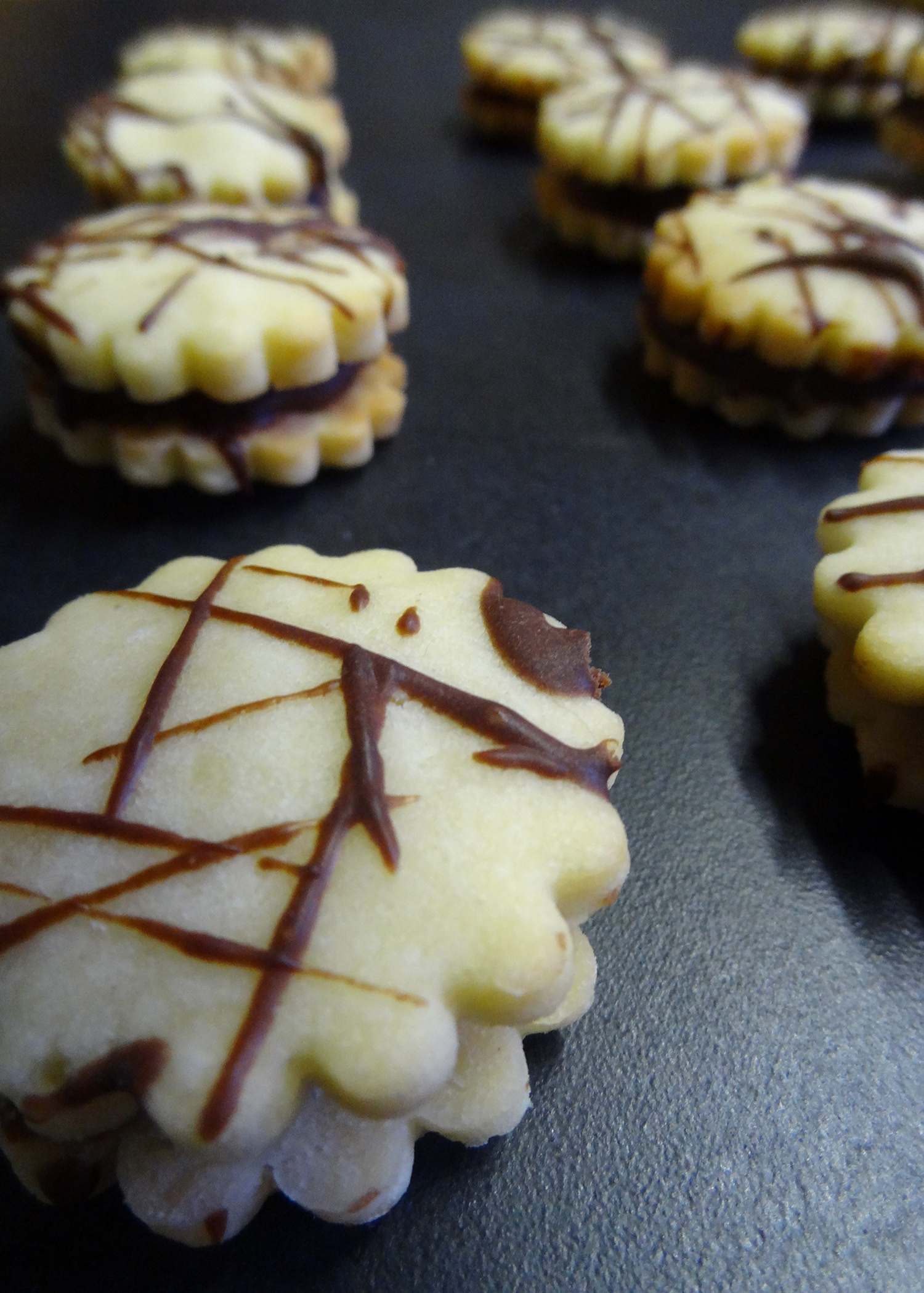 Nun immer auf eine Rondelle ein Teelöffel Füllung geben, ein weitere Rondelle als Deckel daraufsetzen und etwas zusammendrücken. Dies für sämtliche Rondellen wiederholen. Am Schluss sollte noch etwas Füllung für die Dekoration übrig bleiben: Die übrig gebliebene Masse kurz in der Mikrowelle schmelzen. Dann einen Teelöffel kurz in die Schokomasse tauchen und anschliessend diesen Löffel schnell quer über die Konfekte hinweg bewegen, sodass feine Streifen auf den Deckeln landen. (siehe Bild)