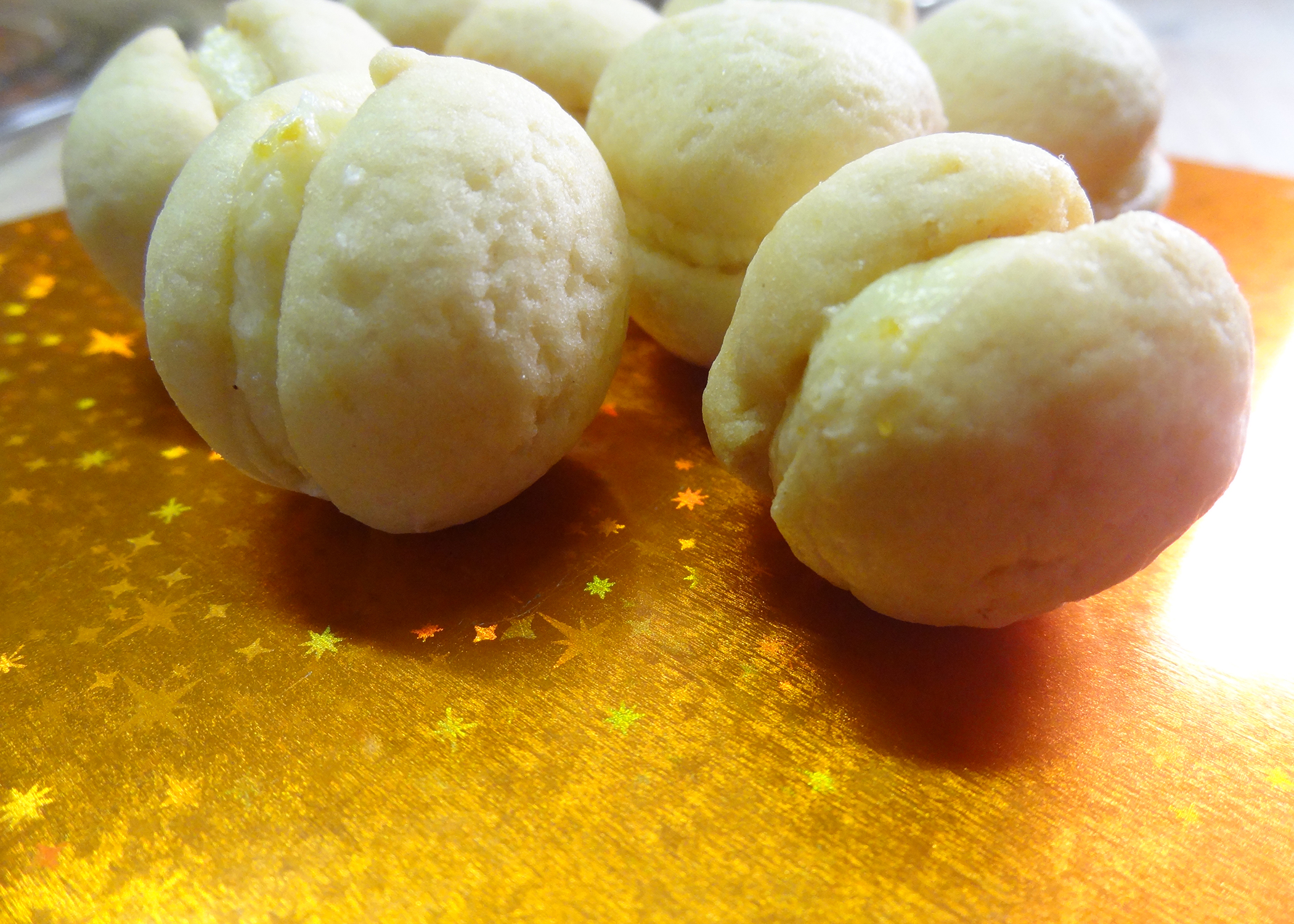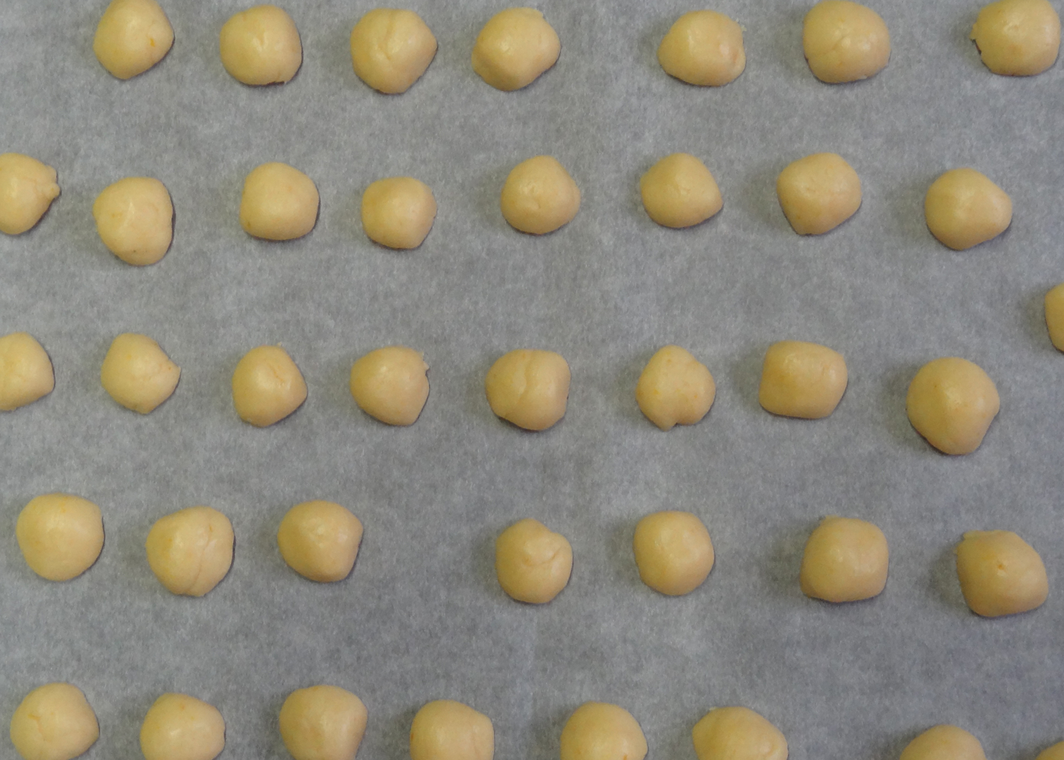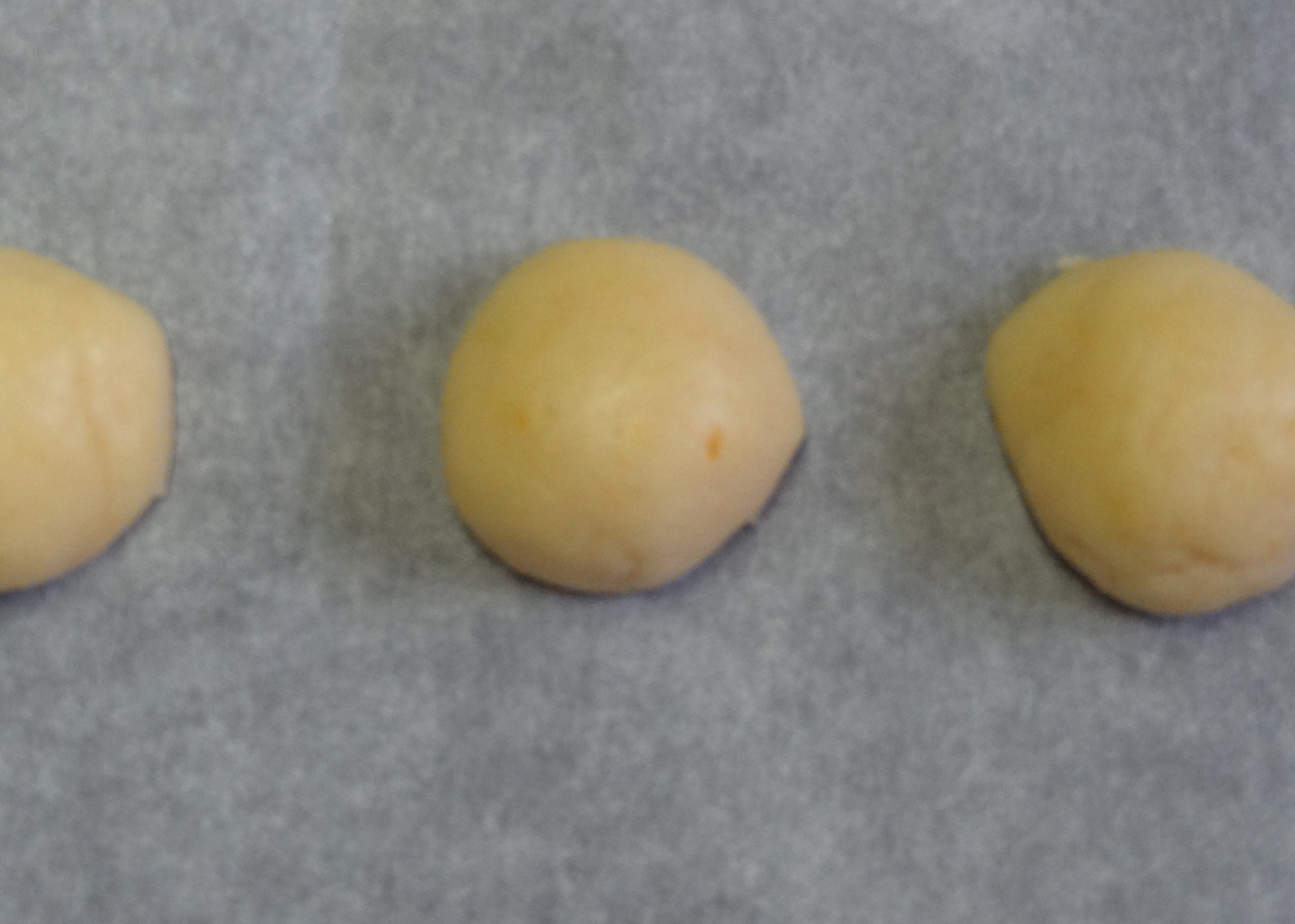Aus dem Teig dann kleine Kugeln formen (max 2cmø), halbieren, und mit der Schnittflache nach unten auf ein mit Backpapier belegtes Blech setzen. Die Halbkugeln während ca. 15min backen und auf einem Gitter auskühlen lassen.