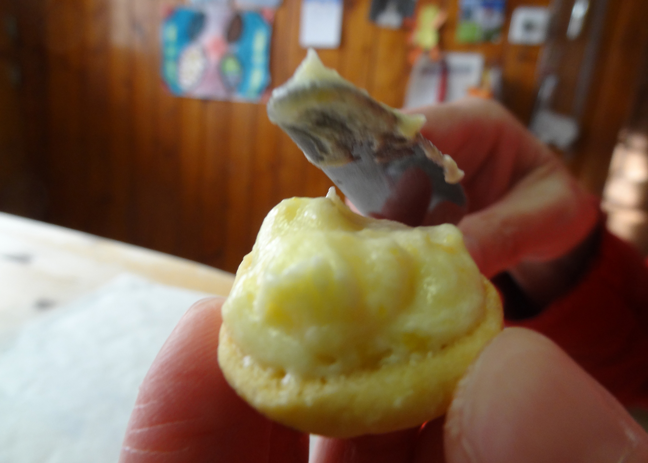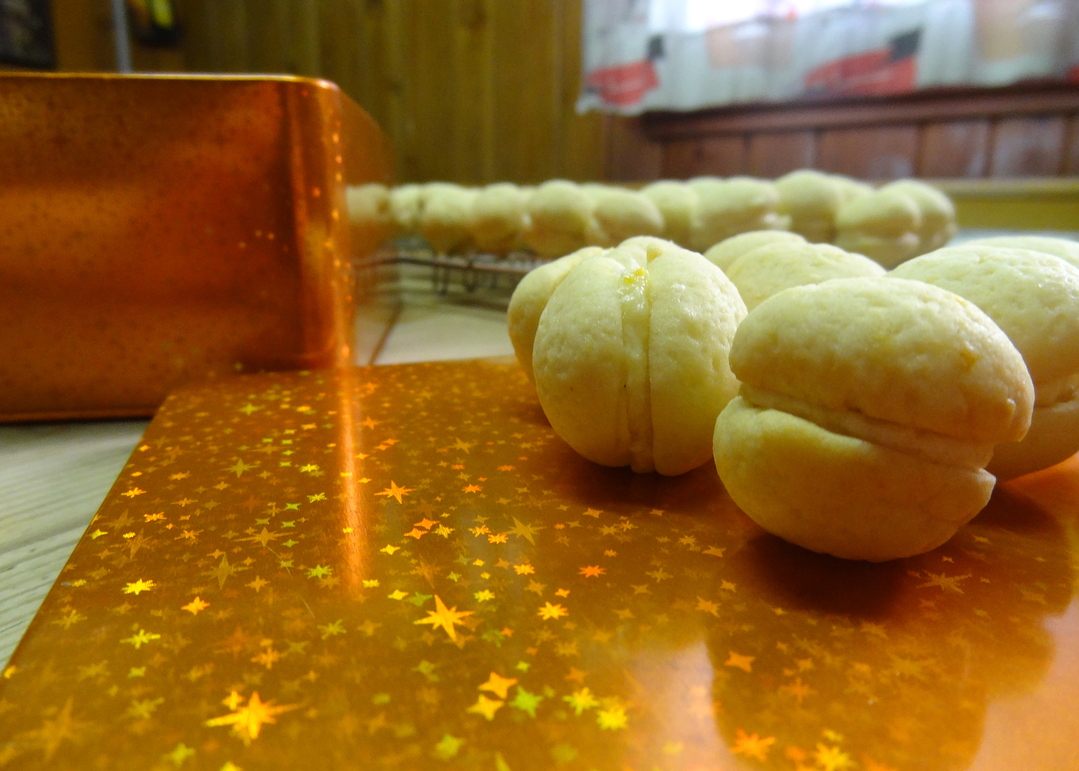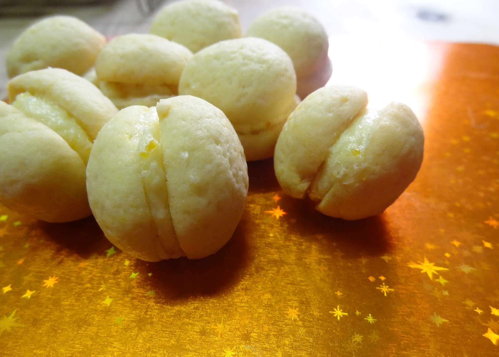 Aus dem Teig dann kleine Kugeln formen (max 2cmø), halbieren, und mit der Schnittflache nach unten auf ein mit Backpapier belegtes Blech setzen. Die Halbkugeln während ca. 15min backen und auf einem Gitter auskühlen lassen.