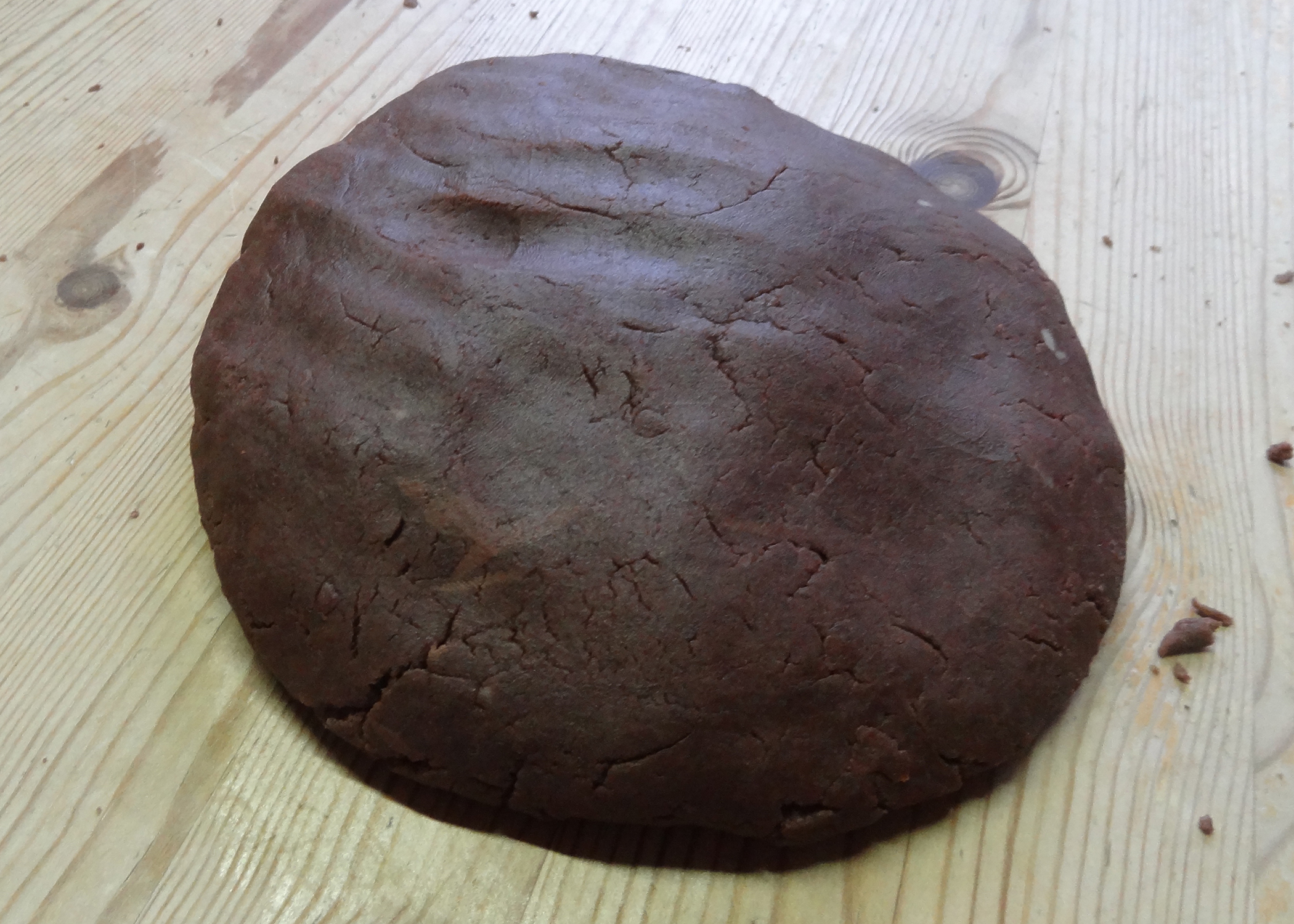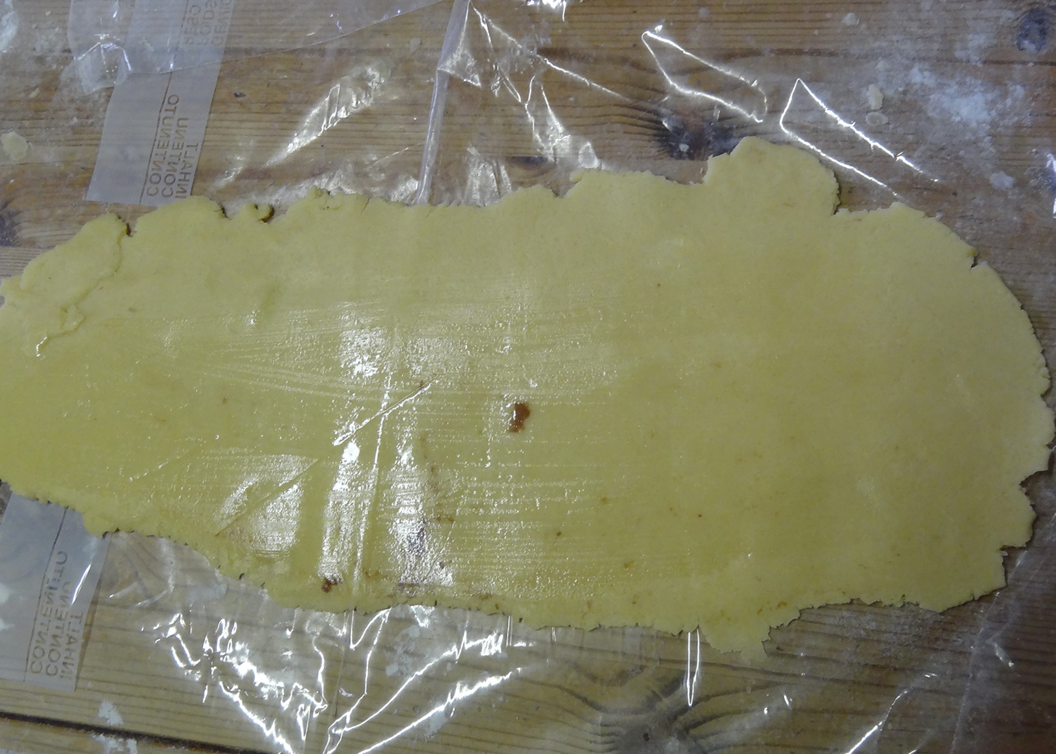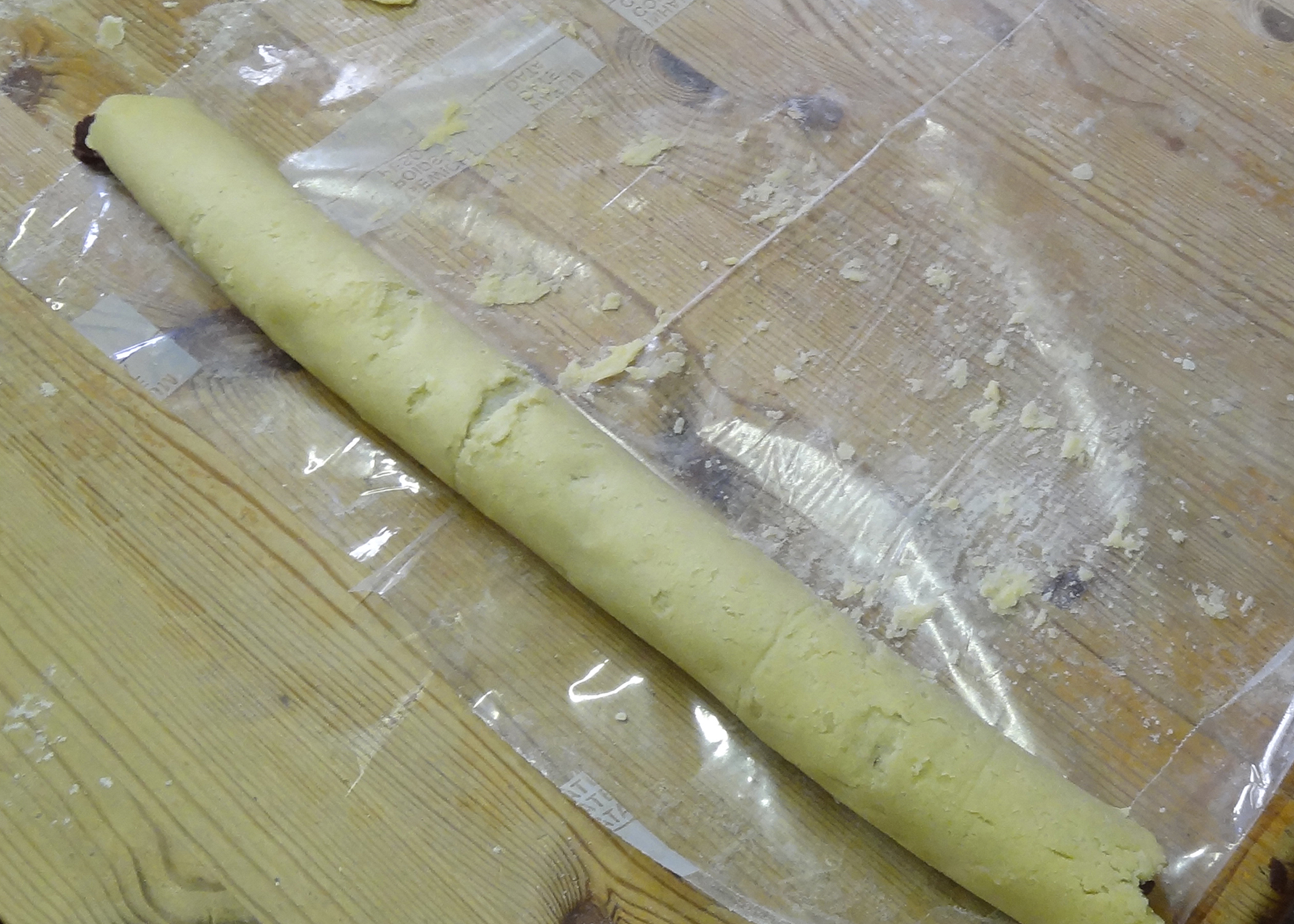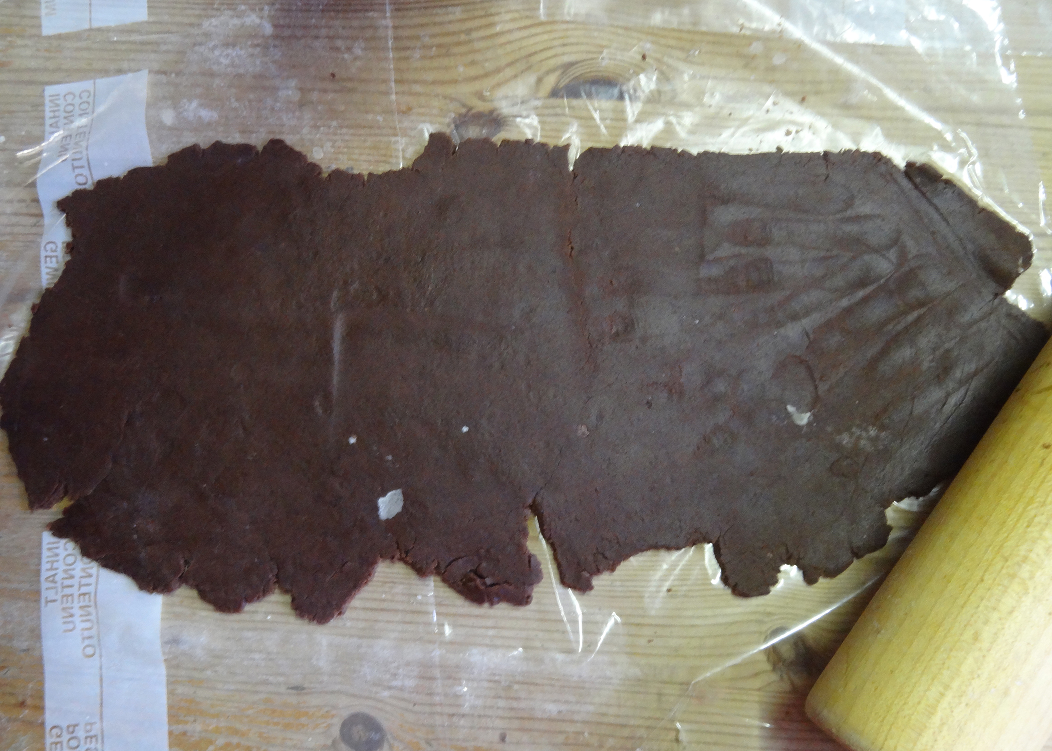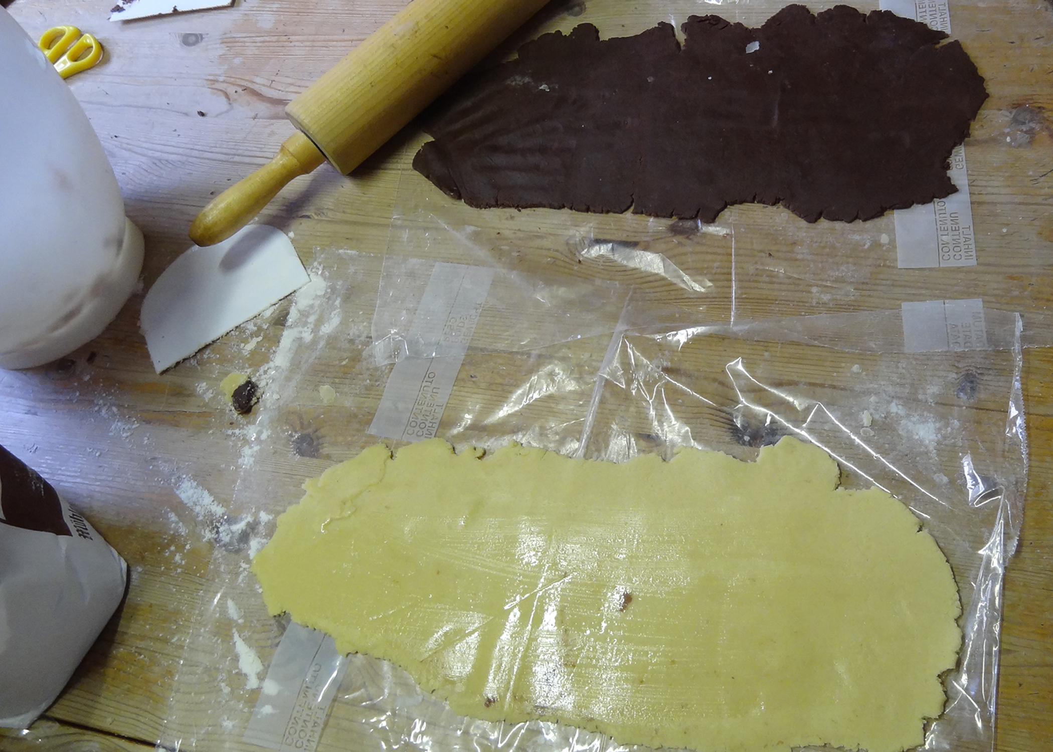 Um die Schnecken zu formen zuerst beide Teige halbieren. Dann je eine Hälfte zu zwei gleich grossen, 2mm dicken Rechtecken auswallen. Am besten klappt dies, wenn ihr den Teig jeweils zwischen zwei aufgeschnittenen Gefrierbeuteln auswallt. (Desto länger das Rechteck, desto geringer der Durchmesser der Sablés und desto grösser die Anzahl Stücke). Die helle Teigplatte dann mit Wasser bestreichen und die dunkle Teigplatte vorsichtig darauflegen. Wenn ihr den Teig auf einem Plastikbeutel ausgewallt habt, könnt ihr ihn sozusagen mit Hilfe des Plastikbeutels auf die helle Teigplatte „stürzen“. Jetzt die aufeinandergelegten Teigplatten von der langen Seite her vorsichtig aufrollen. Dies ist etwas mühsam und benötigt Feingefühl, da der Teig ziemlich mürb und brüchig ist. Diese Prozedur für die beiden anderen Teighälften wiederholen. Die fertigen Rollen gut in Folie einwickeln für mindestens 30min kühlstellen oder kurz in den Tiefkühler legen.