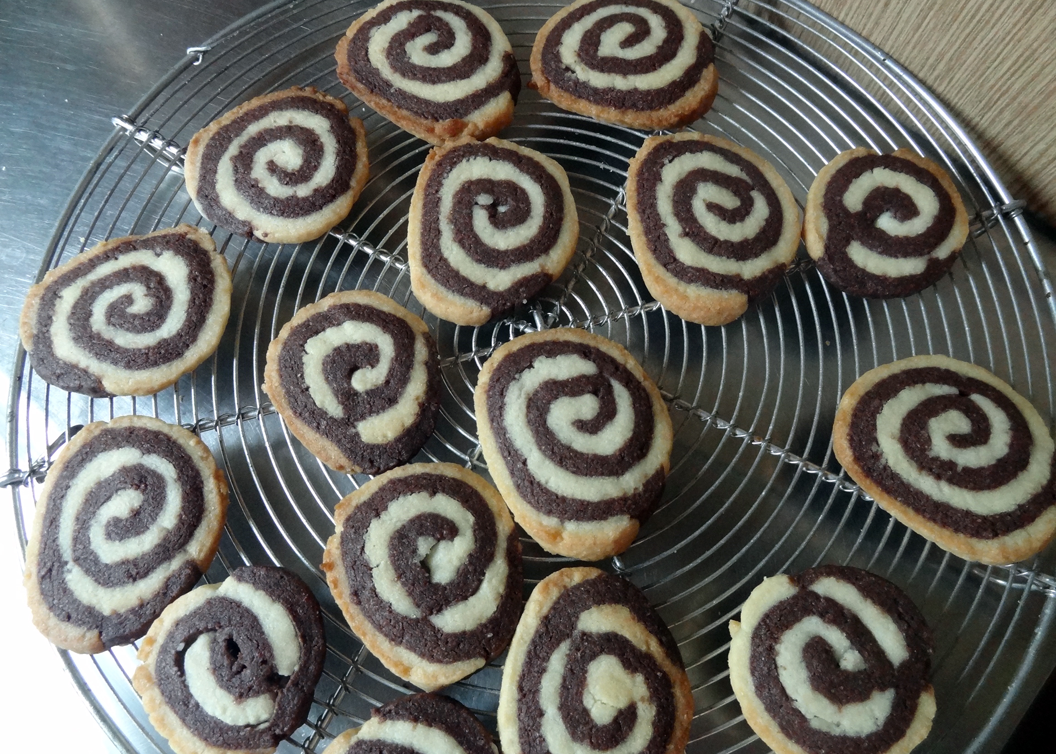 Einerseits habe ich den Teig etwas zu wenig dünn ausgewallt, dadurch sind meine Schnecken ziemlich gross geworden… Ausserdem ist der Teig sehr mürb und darum nicht ganz einfach aufzurollen. Mit etwas Geduld hat es schlussendlich doch noch geklappt. Aus den Teigresten habe ich ein paar Marmor-Sablés gemacht, welche mir mindestens so gut oder sogar noch besser gefallen haben, als die Schnecken.
