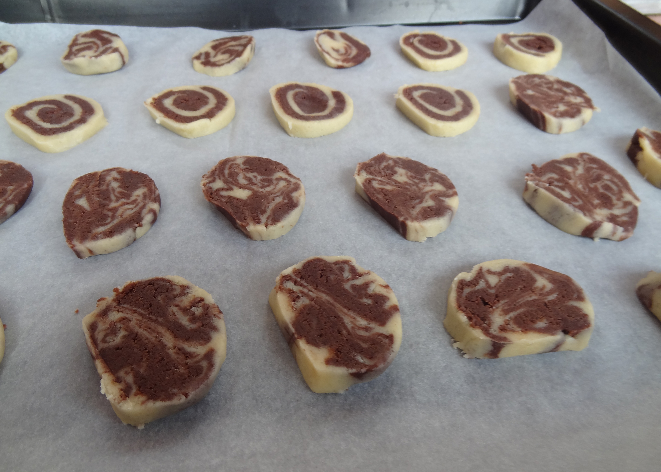 Den Backofen auf 180°C Umluft vorheizen und mehrere Bleche mit Backpapier auslegen. Die gekühlten Rollen in ca. 5mm dicke Scheiben schneiden. Dabei nicht zu sehr auf die Rollen drücken, da sie sich leicht verformen. Die Scheiben auf das vorbereitete Blech legen. Nicht verwendbare Teigresten verkneten, wiederum eine Rolle formen und auch diese in Scheiben schneiden. So entstehen Marmor-Sablés. Ein volles Blech sofort für 10min backen (Backzeit kann nach Grösse der Plätzchen und nach Anzahl auf dem Blech variieren) und die Sablés auf einem Gitter auskühlen lassen. Jedes volle Blech, welches nicht sofort in den Ofen kommt, unbedingt bis zum Backen kühl stellen.