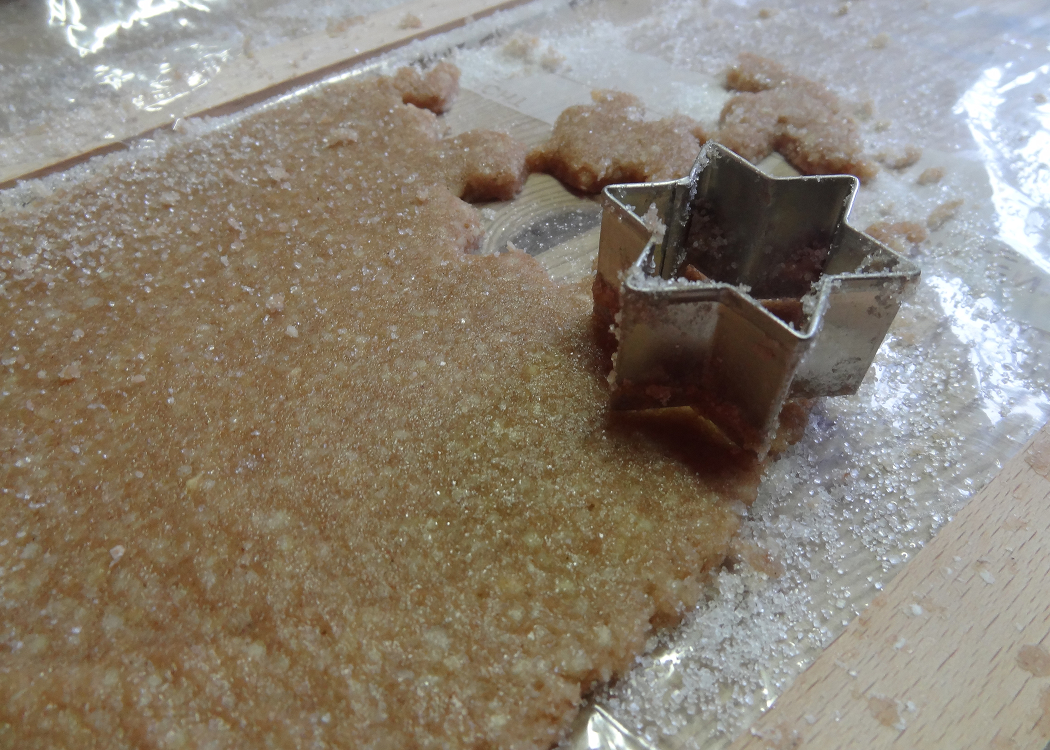 Für die Verarbeitung zwei Gefrierbeutel auseinander schneiden und mehrere Bleche mit Backpapier auslegen. Den Teig nun portionenweise zwischen den Gefrierbeuteln 5-7mm dick auswallen. Wenn er an den Gefrierbeuteln klebt, diese vorher mit etwas Zucker bestreuen. Aus dem Teig beliebig grosse Sterne ausstechen und auf die vorbereiteten Bleche legen. Jeden Stern mit der beiseite gestellten Eiweissmasse bestreichen. Am besten mit einem Pinsel etwas Glasur auf den jeweiligen Stern geben und diese mit einem Zahnstocher oder einer Stricknadel in alle Ecken ziehen. Die fertig ausgestochenen und glasierten Sterne für 6 Stunden oder am Besten über Nacht kühl stellen damit sie trocknen können.