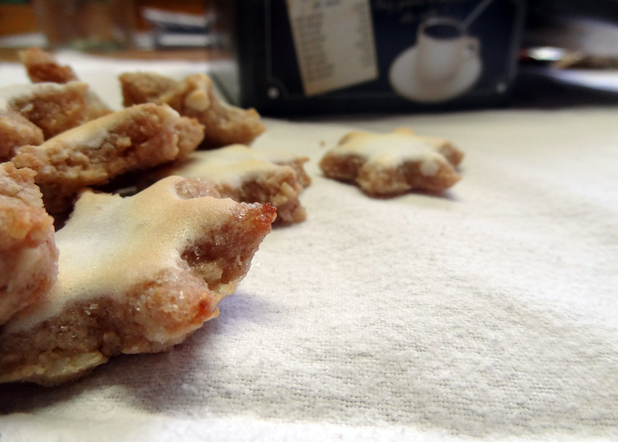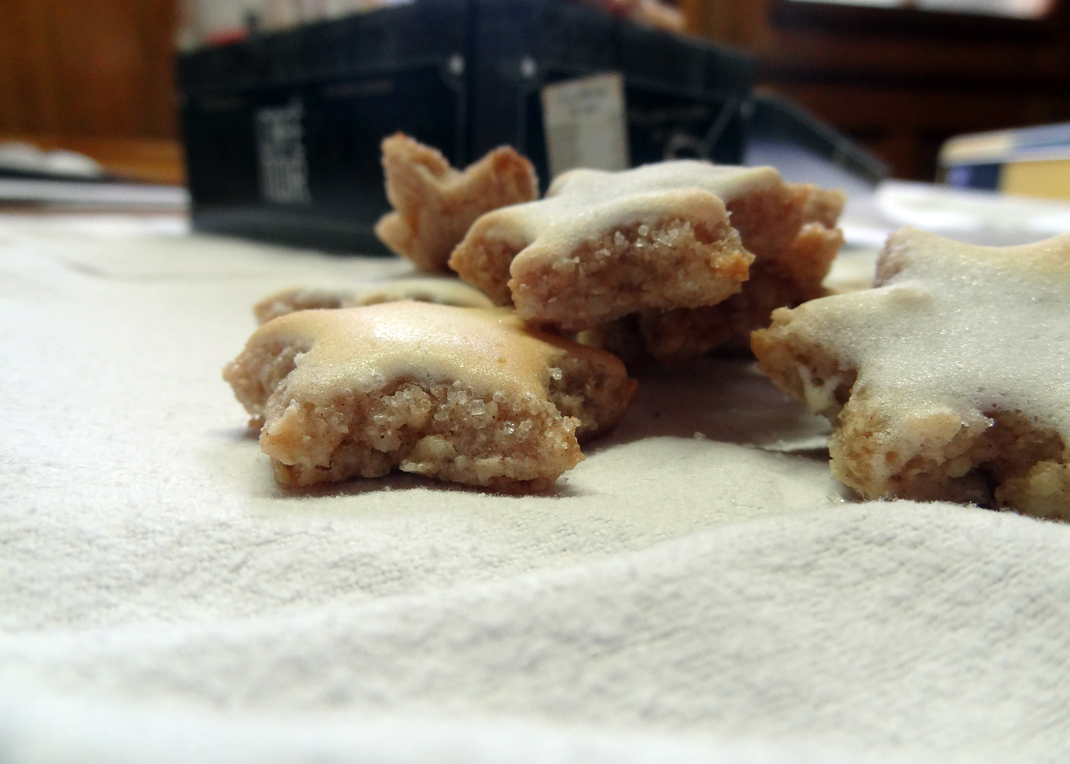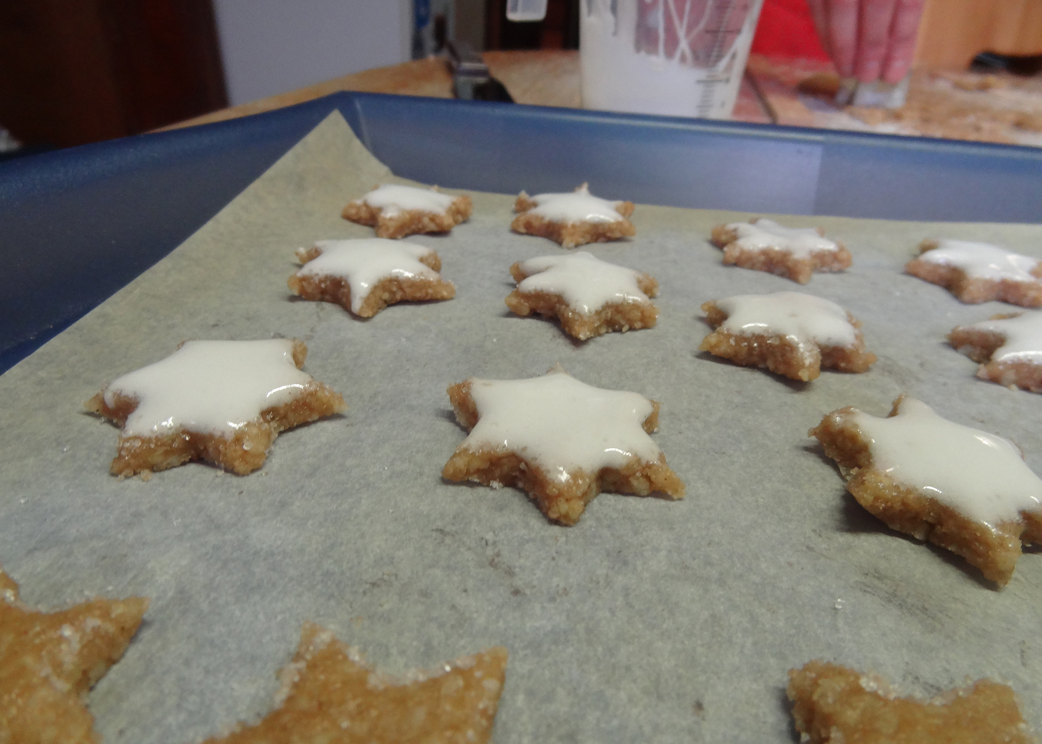 Die meisten von euch haben sich bestimmt schon mal an diesem Guetzli versucht, deshalb werde ich gar nicht mehr soviel dazusagen.Dies hier ist das klassische Rezept aus dem Betty Bossi Guetzlibuech. Ich habe die Zimsterne bis jetzt immer nach der Variante „mit Glasur gebacken“ gemacht. Eigentlich würde ich es jedoch schöner finden, wenn die Glasur ganz weiss wäre und nicht etwas dunkel, wie es bei dieser Methode der Fall ist. Nächstes Jahr werde ich mich bestimmt an die zweite Variante mit der Puderzuckerglasur wagen. Und bis dahin macht mich diese Variante auch vollkomen glücklich