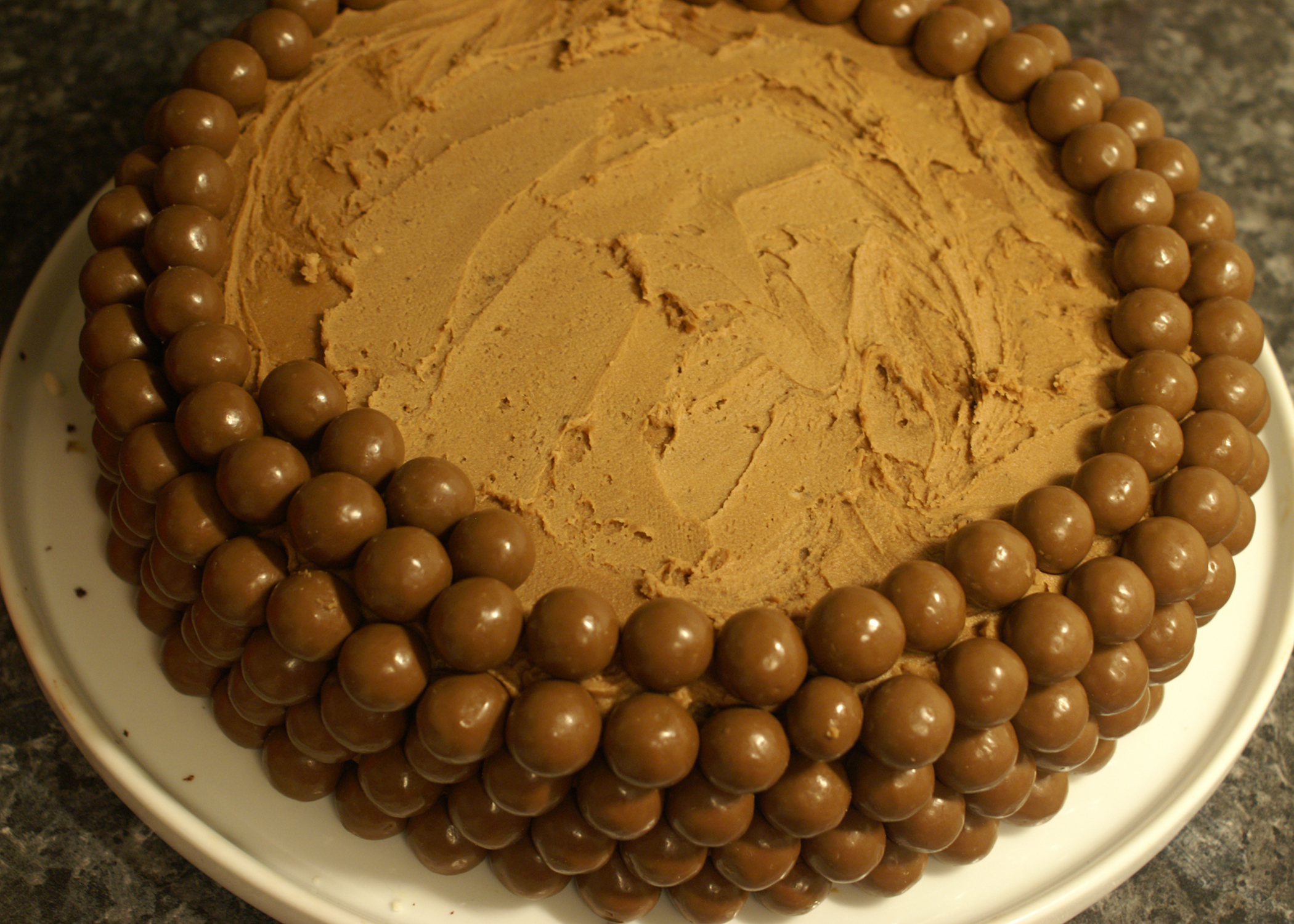 Nun fehlt nur noch die Hauptzutat: die Maltesers. Mit diesen muss der Kuchen nun überdeckt werden. Am besten beginnt man unten und legt eine Reihe von Maltesers um den Kuchen Danach immer weiter stapeln bis die ganze Torte unter Maltesers versteckt ist.