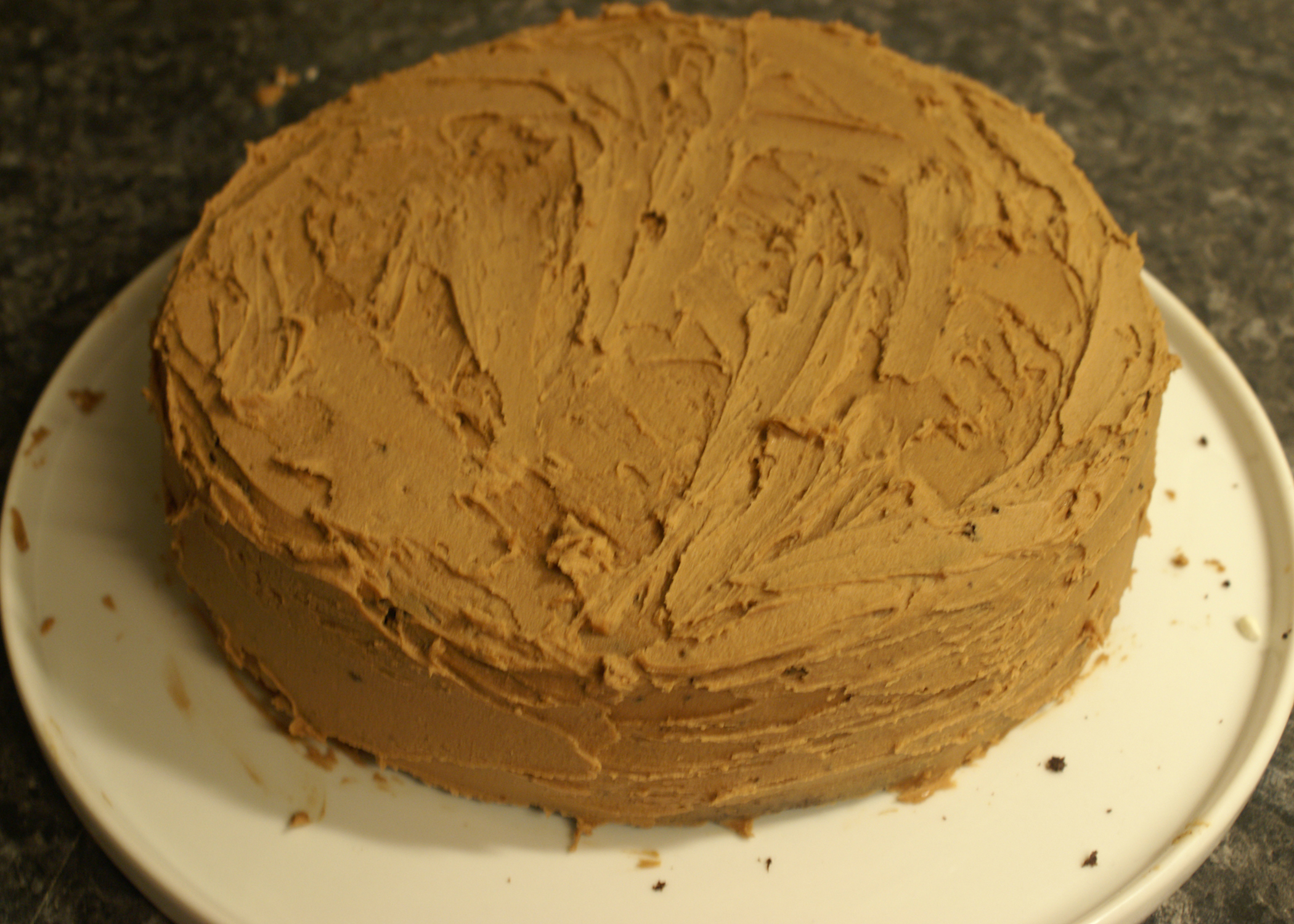 Fürs Zusammensetzen ein Biskuit auf eine Tortenplatte geben und mit etwas Frosting bestreichen. Danach das nächste Biskuit darauflegen und wieder bestreichen und zum Schluss noch den Deckel darauf setzen. Jetzt kann der ganze Kuchen mit dem Frosting überdeckt werden.