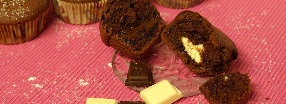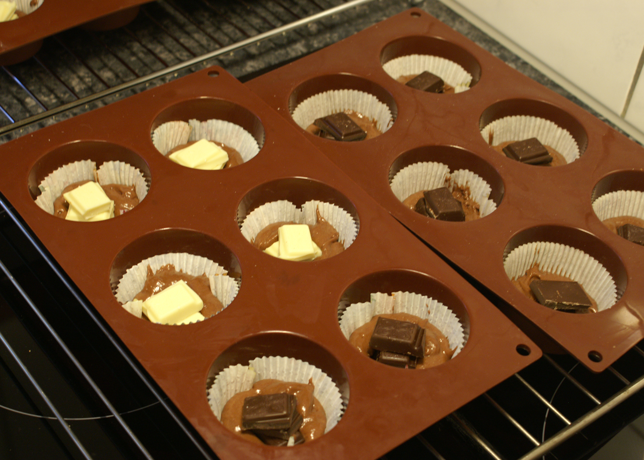 Die Förmchen zu 1/3 mit dem Teig füllen und die Schokolade in Stückchen brechen. Die Schokoladenstücke auf den Teig legen. Anschliessend den restlichen Teig darauf verteilen und für 20-25 Minuten backen bis bei der Stäbchenprobe nichts mehr kleben bleibt.