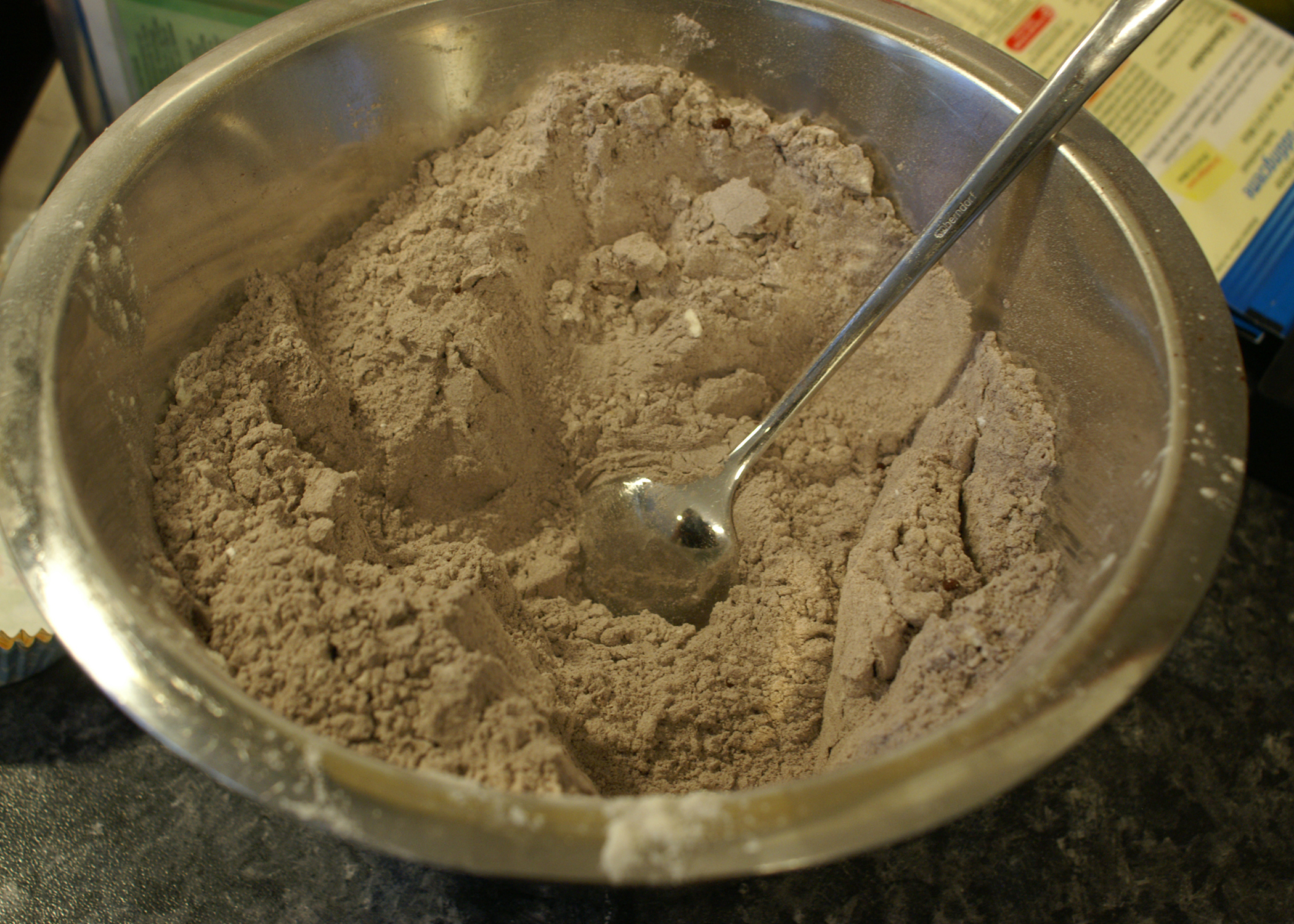 Wie immer zuerst den Backofen auf 180°C Umluft vorheizen und Papierförmchen in das Muffinblech geben. Das Mehl mit dem Kakaopulver, dem Backpulver und dem Natron mischen.