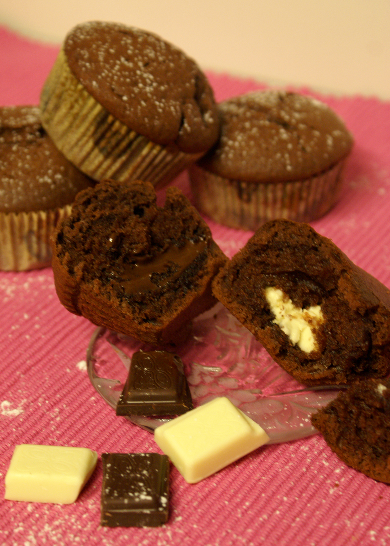 Mir ist natürlich klar, dass nicht alle weisse Schokolade mögen. Deshalb habe ich die gleichen Muffins auch mit dunklem Kern gebacken. Es soll sich schliesslich ein jeder an den Muffins erfreuen können, egal welcher Schokoladentyp er ist.