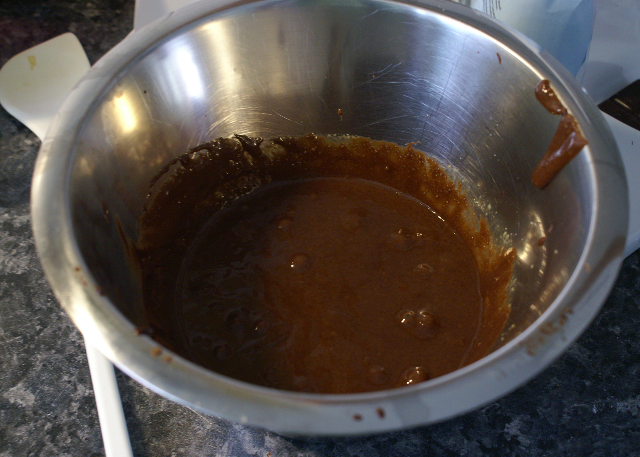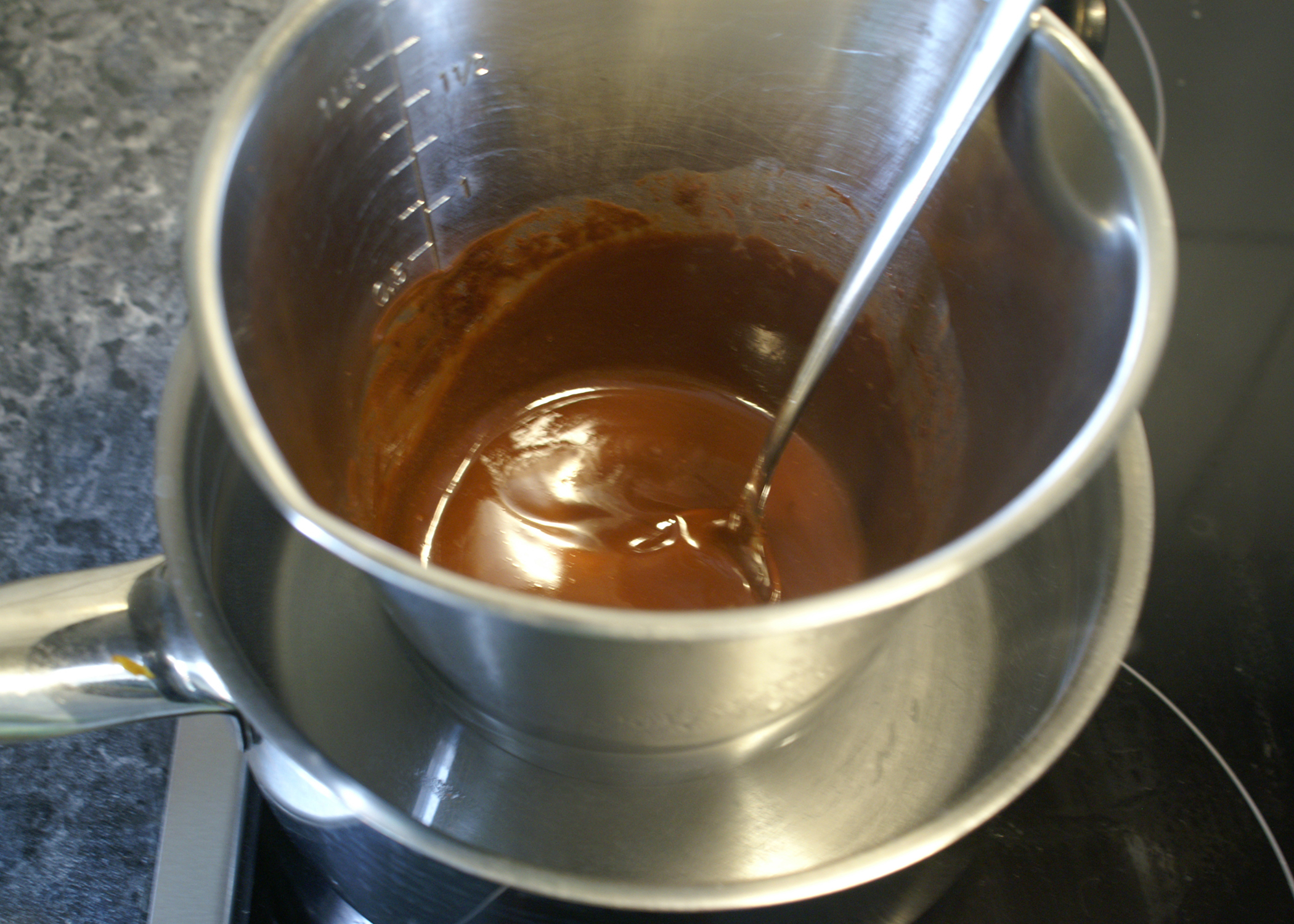 Die Kuvertüre zusammen mit der Butter in einem Wasserbad schmelzen und anschliessend etwas auskühlen lassen.