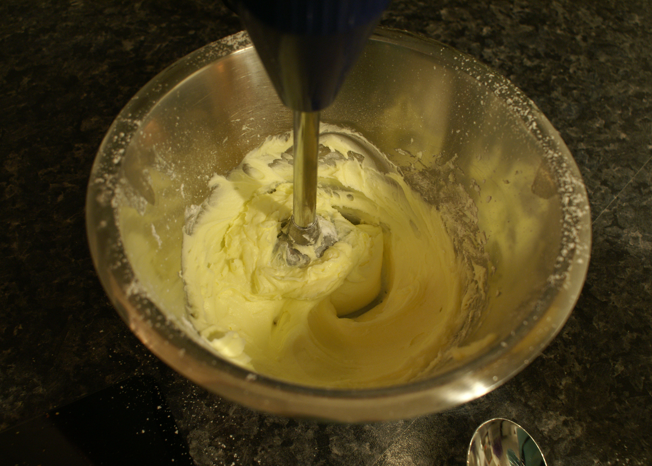 Die Butter in eine andere Schüssel geben und rühren bis sich Spitzchen bilden. Dann mit dem Puderzucker vermischen und schlussendlich noch die geschmolzene Schokolade beifügen. Die Masse ist zu diesem Zeitpunkt ziemlich warm und daher zu flüssig. Deshalb sollte man sie in den Kühlschrank stellen bis sie gut formbar ist.