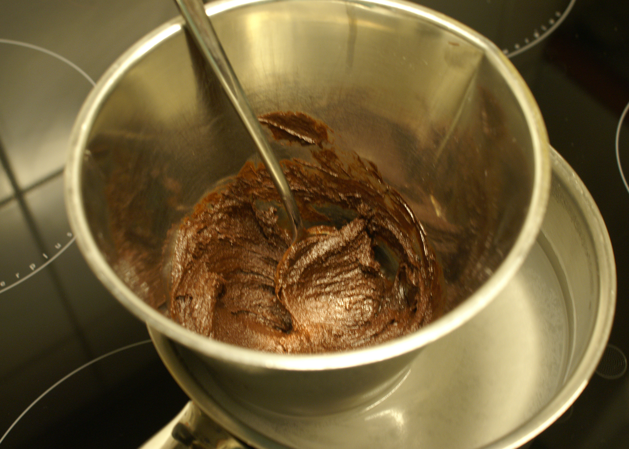 Die Butter muss bei der Verwendung unbedingt weich sein. Daher sollte man sie schon früh genug aus dem Kühlschrank nehmen und bei Zimmertemperatur stehen lassen. Inzwischen die Schokolade mit dem Wasser in einem Wasserbad schmelzen und danach etwas auskühlen lassen. Anschliessend das Rum-Aroma dazugeben.