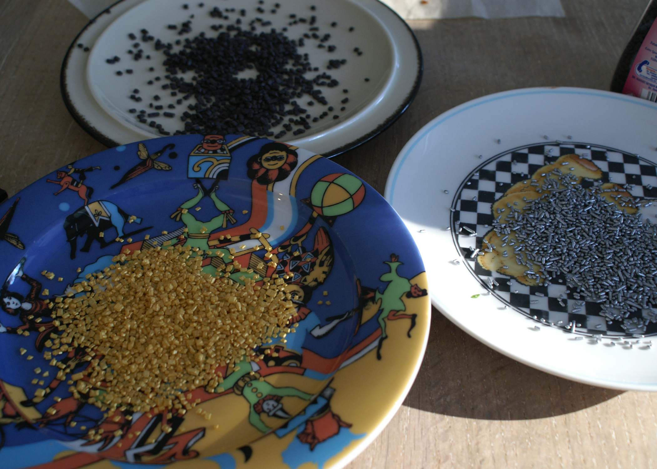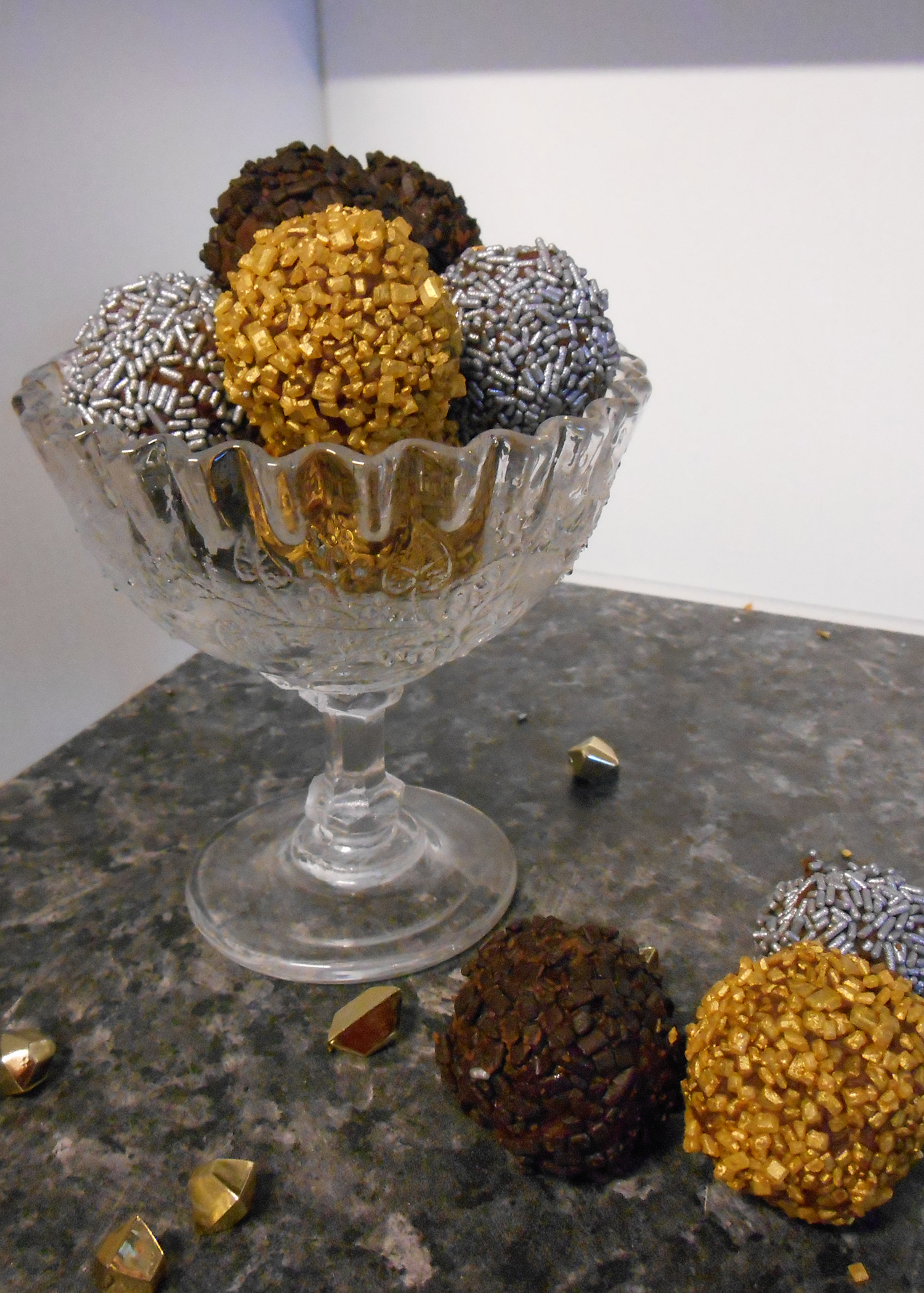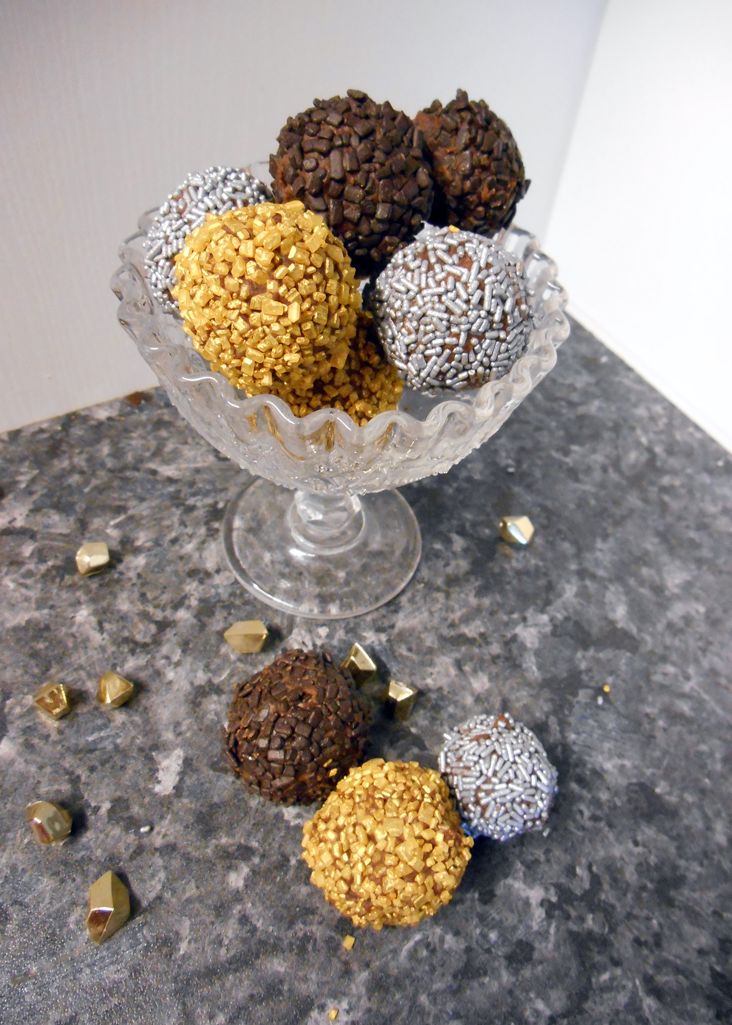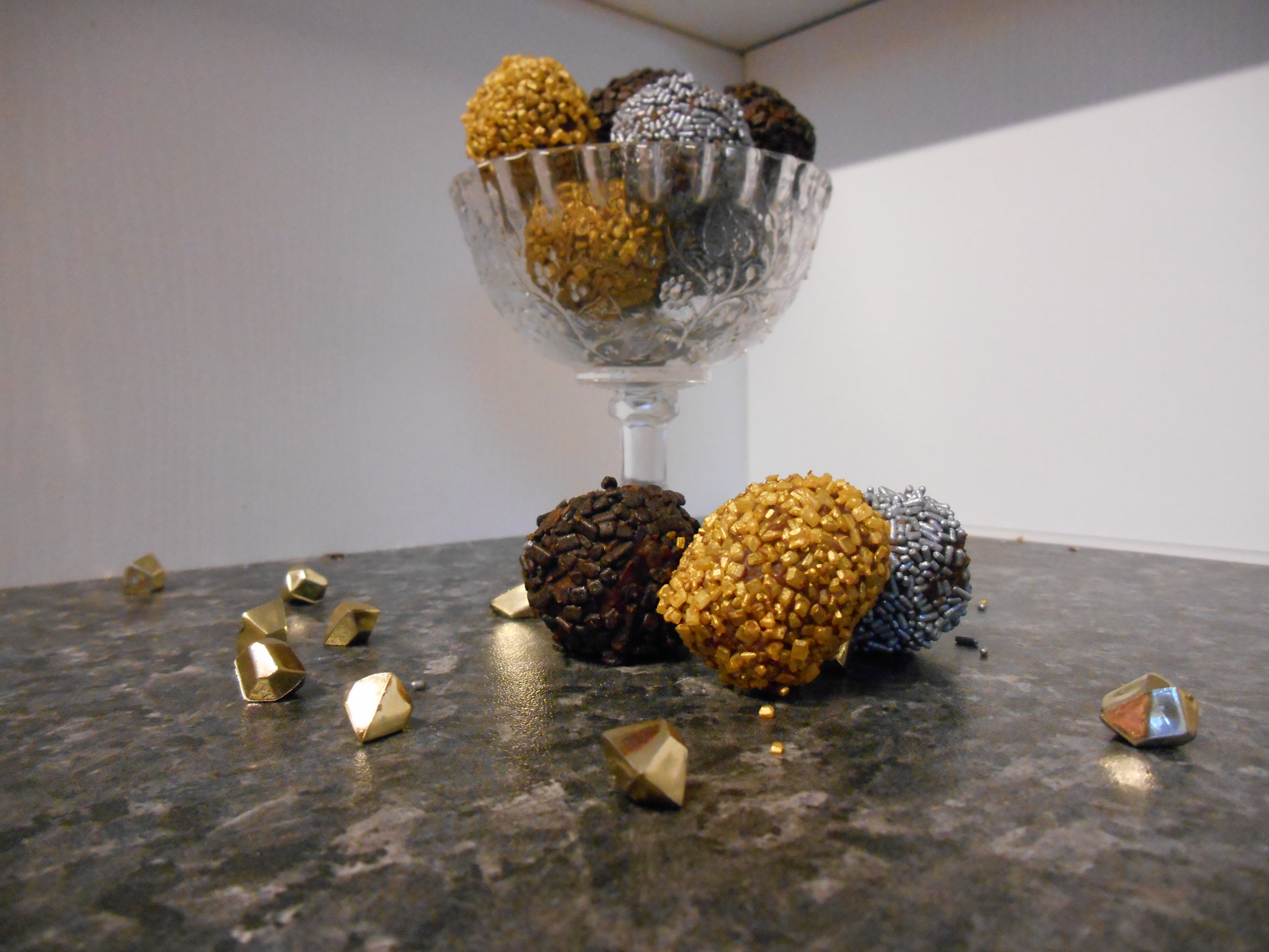 Den gewünschten Zuckerstreusel kann man nun bereits in flache Teller geben. Wenn die Schokoladenmasse die geeignete Konsistenz hat, muss man daraus nur noch Kugeln formen und im Streusel „wälzen“. Die fertigen Trüffeln auf ein Teller geben und bis zur Verwendung kühl aufbewahren.