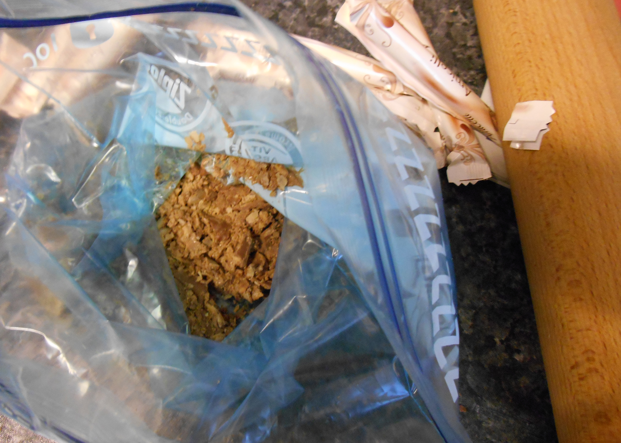Nun die Mehlmischung dazusieben und unterheben. Jetzt kommen die Amicelli zur Verwendung. Diese aus dem Tiefkühlfach nehmen, in einen Gefrierbeutel geben und dann zerhacken.