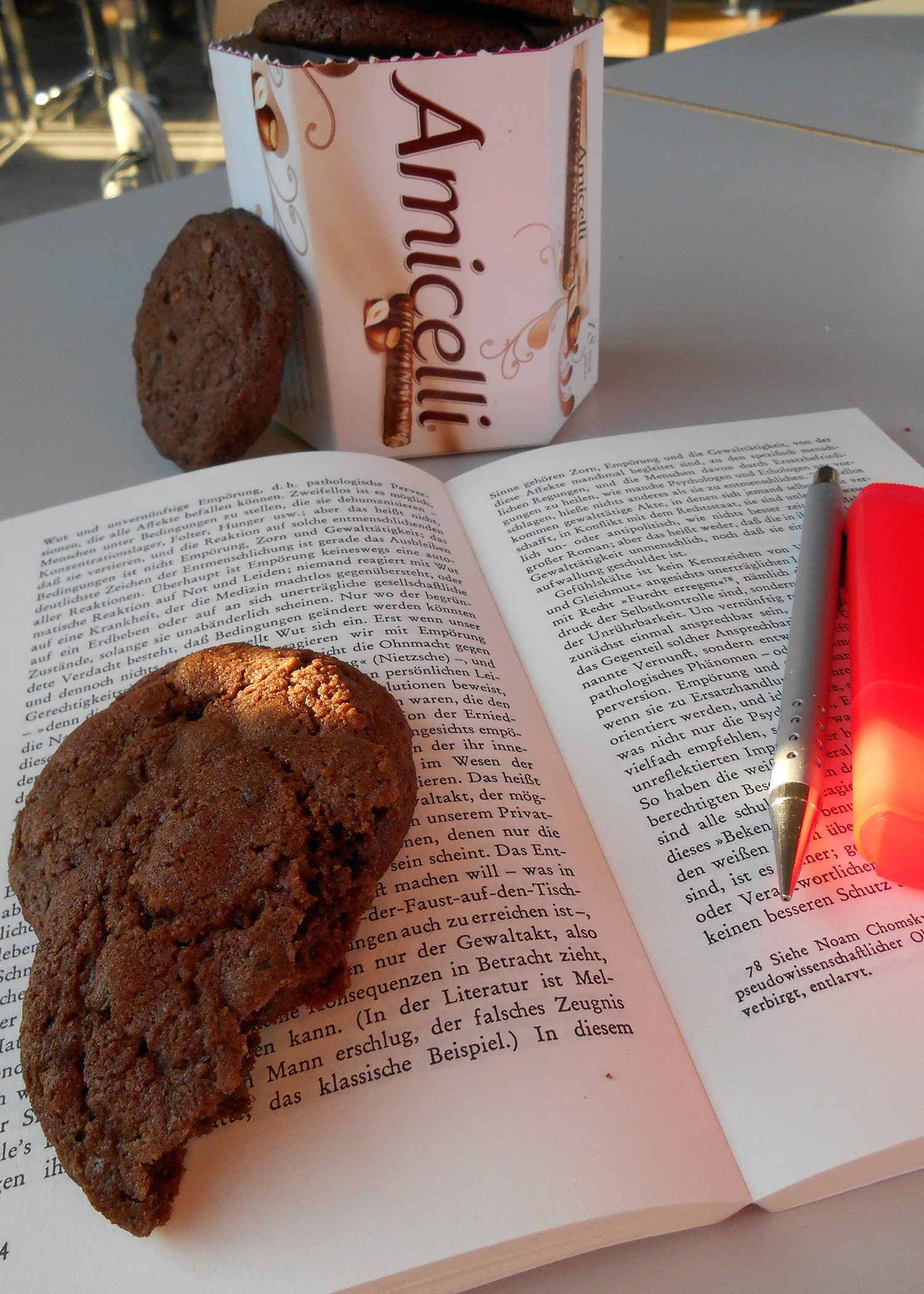 Das Rezept ist eine Eigenkreation, die wirklich gut gelungen ist. Sie konnten das Nachsitzen etwas angenehmer gestalten und auch meine Lehrerin bekam ein Cookie ab. Die Hälfte des Nachsitzen verbrachte ich übrigens damit, die Cookies möglichst gut und schön zu fotografieren. Meine Freunde halfen dabei kräftig mit, die Amicelli Cookies in ein gutes Licht zu rücken. Die Zeit verging daher ziemlich schnell und wir hatten trotzdem noch unseren Spass.