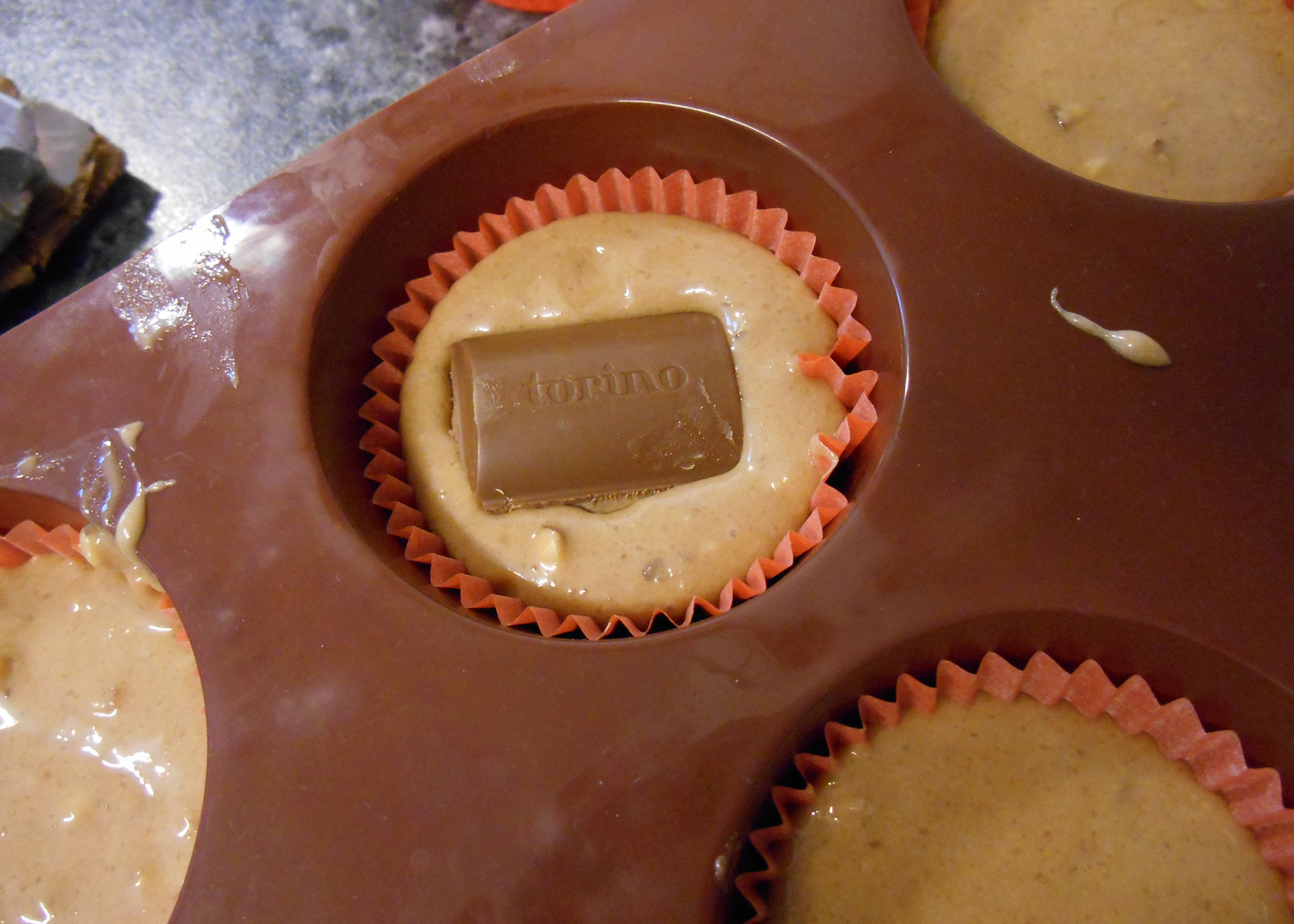 Man sollte sie nicht bis ganz oben füllen, denn in jedes Muffin wird jetzt noch ein Häuschen Torinoschokolade gesteckt. Diese dann mit dem Teig gut verdecken, so dass man sie nicht mehr sehen kann. Die Muffins für 25 Minuten backen und anschliessend auf einem Gitter vollständig auskühlen lassen.