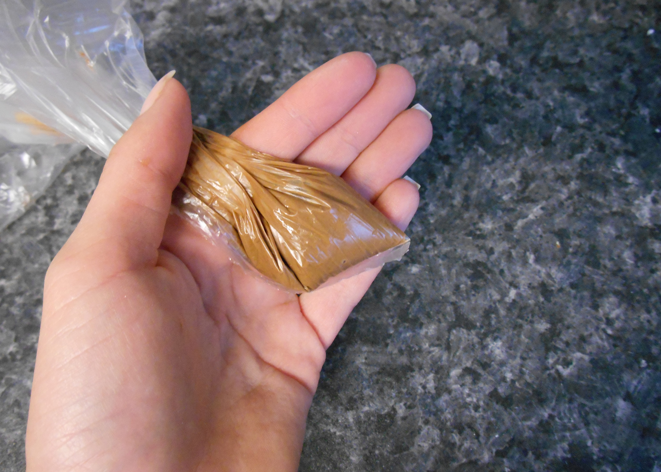 Für das Tüpfchen auf dem i oder besser gesagt für die Schokolade auf dem Frosting, muss man in einem Wasserbad die 5 Häuschen Schokolade schmelzen. Diese etwa 5 Minuten auskühlen lassen und dann in ein Plastiksäckchen geben. Alle Schokolade in einen Ecken streichen und jetzt etwas von diesem Ecken abschneiden, der als Öffnung dienen soll. Die Schokolade nun in Streifen über das Frosting kreisen lassen. Danach trocknen lassen.