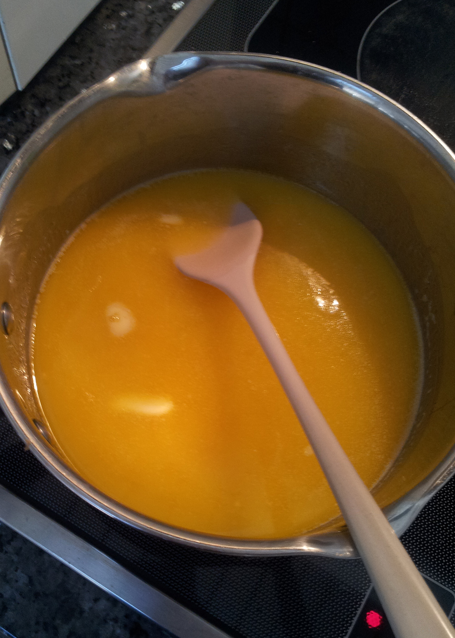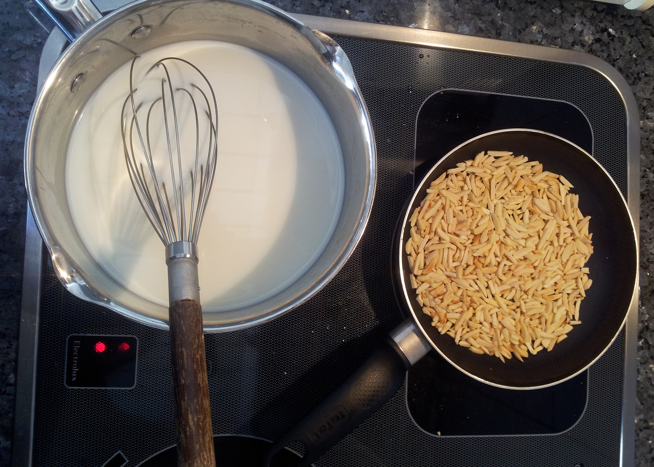 Als erstes muss der Pudding für die Puddingschicht vorbereitet werden. Dazu 6dl Milch aufkochen. Während ich die Milch aufkochte habe ich ausserdem auch schon die Mandelsplitter für die Streusel in einer Bratpfanne ohne Fett angeröstet. Falls euch das jedoch zu viel Stress bereitet, röstet die Mandeln bevor ihr mit dem Pudding anfängt, weil sie für die Weiterverarbeitung vollständig ausgekühlt sein müssen. (Zum auskühlen auf einem mit Backpapier belegtes Blech verteilen) Das Puddingpulver mit 1.5dl Milch in einem separaten Behälter verrühren und anschliessend unter die kochende Milch rühren. Weiterrühren und mindestens eine Minute köcheln lassen. Dann in eine weite Schüssel giessen, diese in ein kaltes Wasserbad stellen und den Pudding währen des Auskühlens immer wieder umrühren.