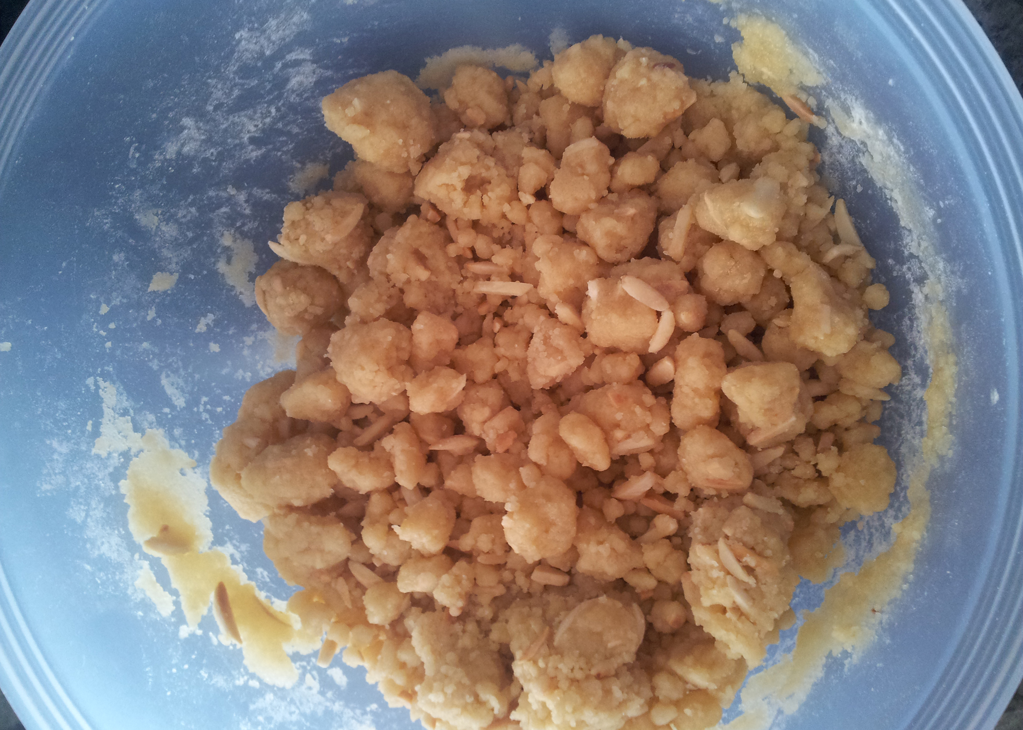 Während der Pudding auskühlt nun die Streusel zubereiten. Dazu die Butter bei schwacher Hitze in einem Topf schmelzen. Währenddessen das Mehl mit den ausgekühlten Mandelsplittern, Zucker, Vanillezucker und Salz in einer grossen Schüssel vermischen. Dann die geschmolzene Butter dazugiessen und mit dem Mixer gut durchrühren, sodass grobe Streusel entstehen. Zum Schluss noch weitere 5EL Mehl dazugeben und mit den Händen locker vermischen.
