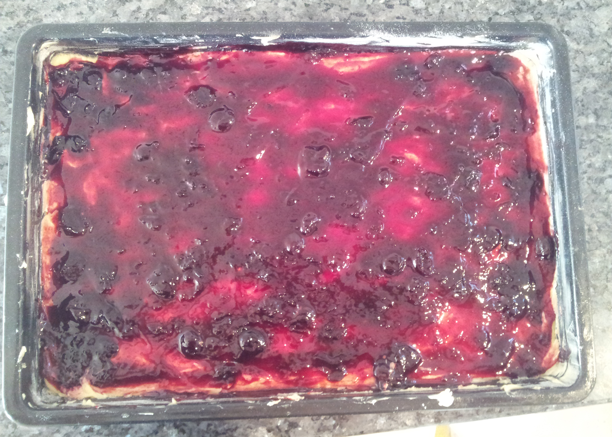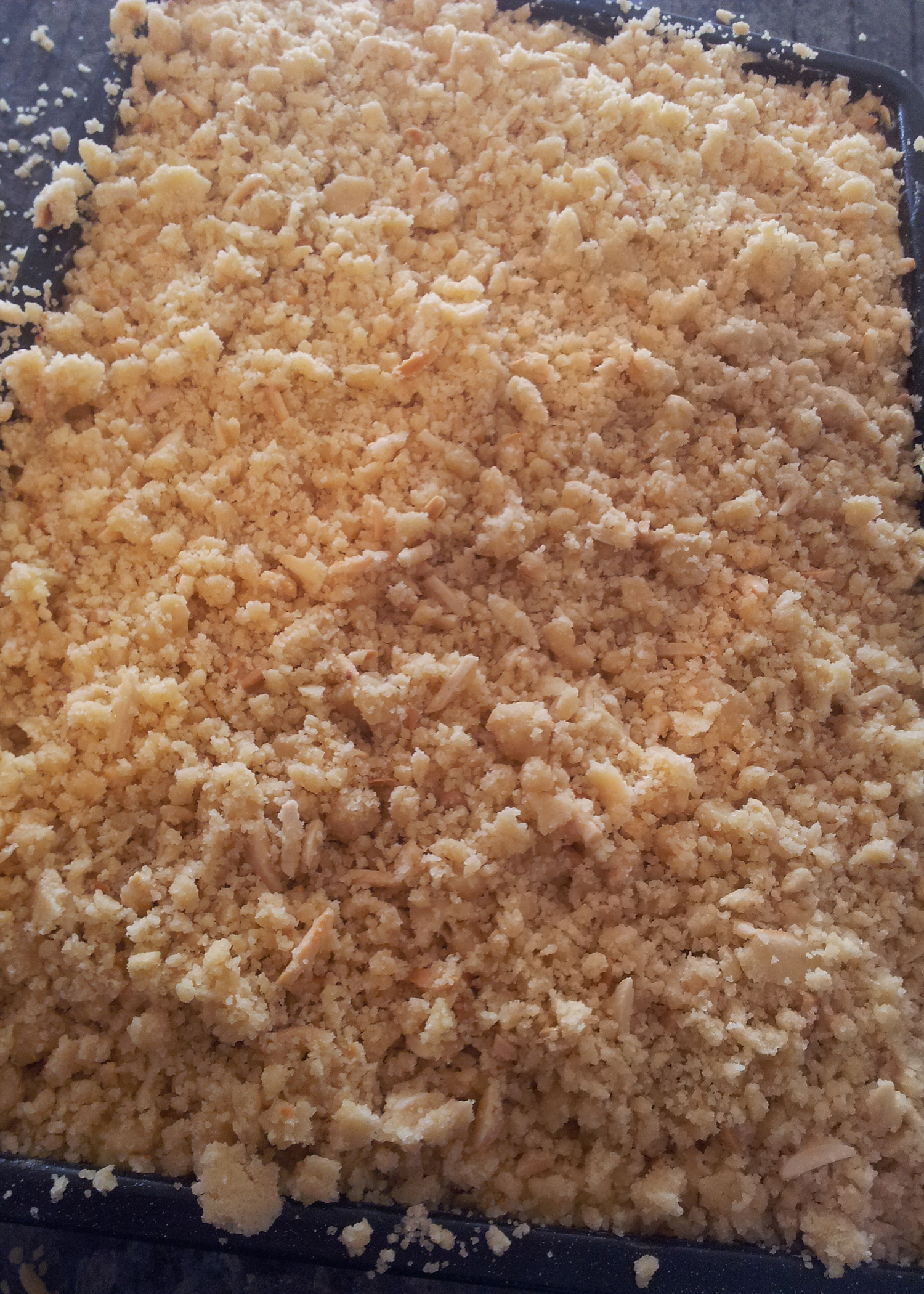 Um die Puddingschicht fertigzustellen zuerst die Eier mit der Crème Fraîche verrühren. Anschliessend den ausgekühlten Pudding unterrühren. Die fertige Masse auf der Konfitüreschicht verteilen. Zum Schluss die Streusel auf die Puddingschicht streuen. (Ja, es ist eine sehr grosse Menge an Streuseln und die Form wird sehr voll werden – genau so soll es sein! :), achtet darum darauf dass eure Form mindestens 3.5cm tief ist, damit es keine Überschwemmungen gibt )