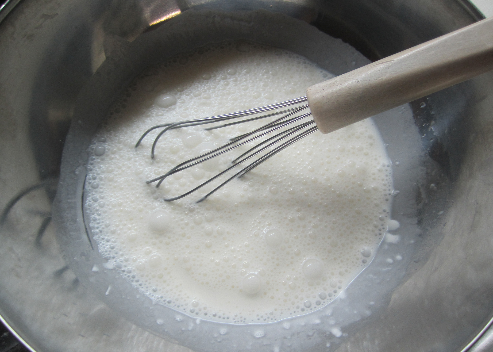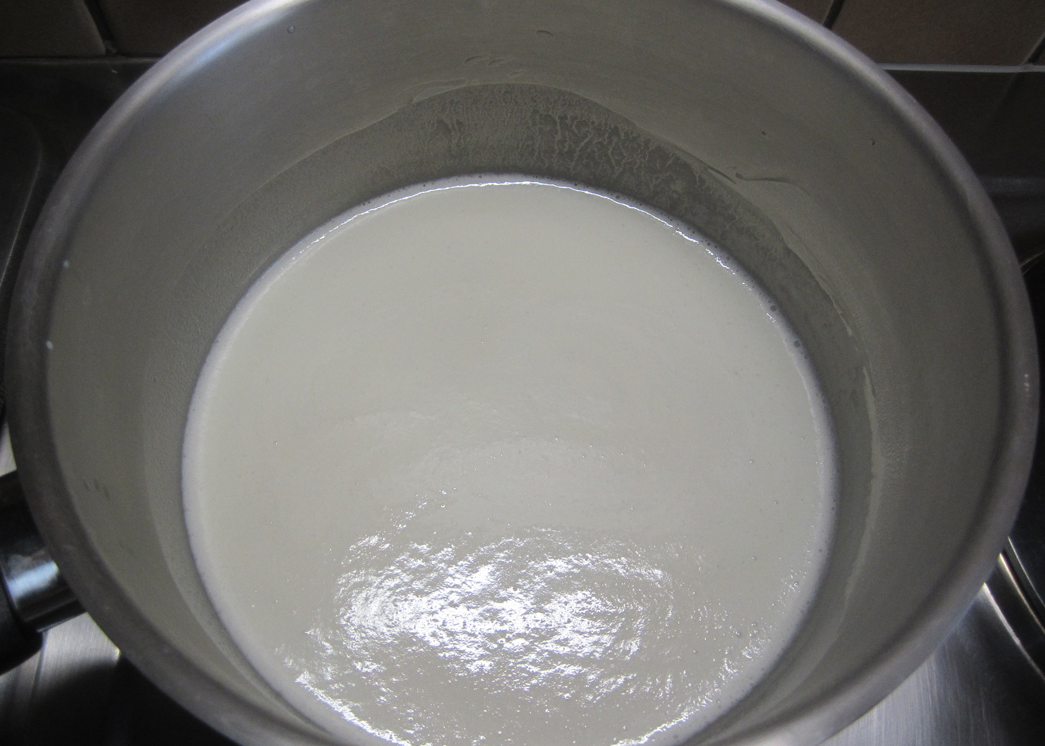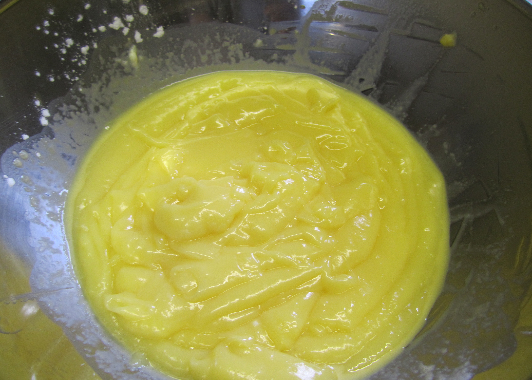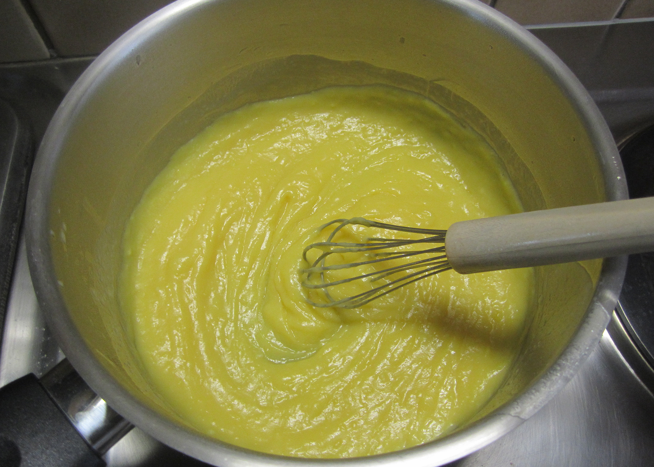 Als nächstes die zwei Eigelbe und das ganze Ei zur Rahm/Maizena-Mischung geben und gut verrühren. Etwa ein Drittel der heissen Moscato-Mischung zur Eimischung geben und dabei stehts umrühren. (Wenn nicht gerührt wird, besteht die Gefahr das die Eier „gekocht“ werden, dass ihr also plötzlich Rührei in eurer Mischung habt). Jetzt die restliche Moscato Mischung wieder aufkochen, die Eimischung dazugiessen und rühren bis die Mischung dicklich wird. Die Pfanne dann wieder vom Herd ziehen und die Butter darunterrühren, bis diese komplett geschmolzen ist.