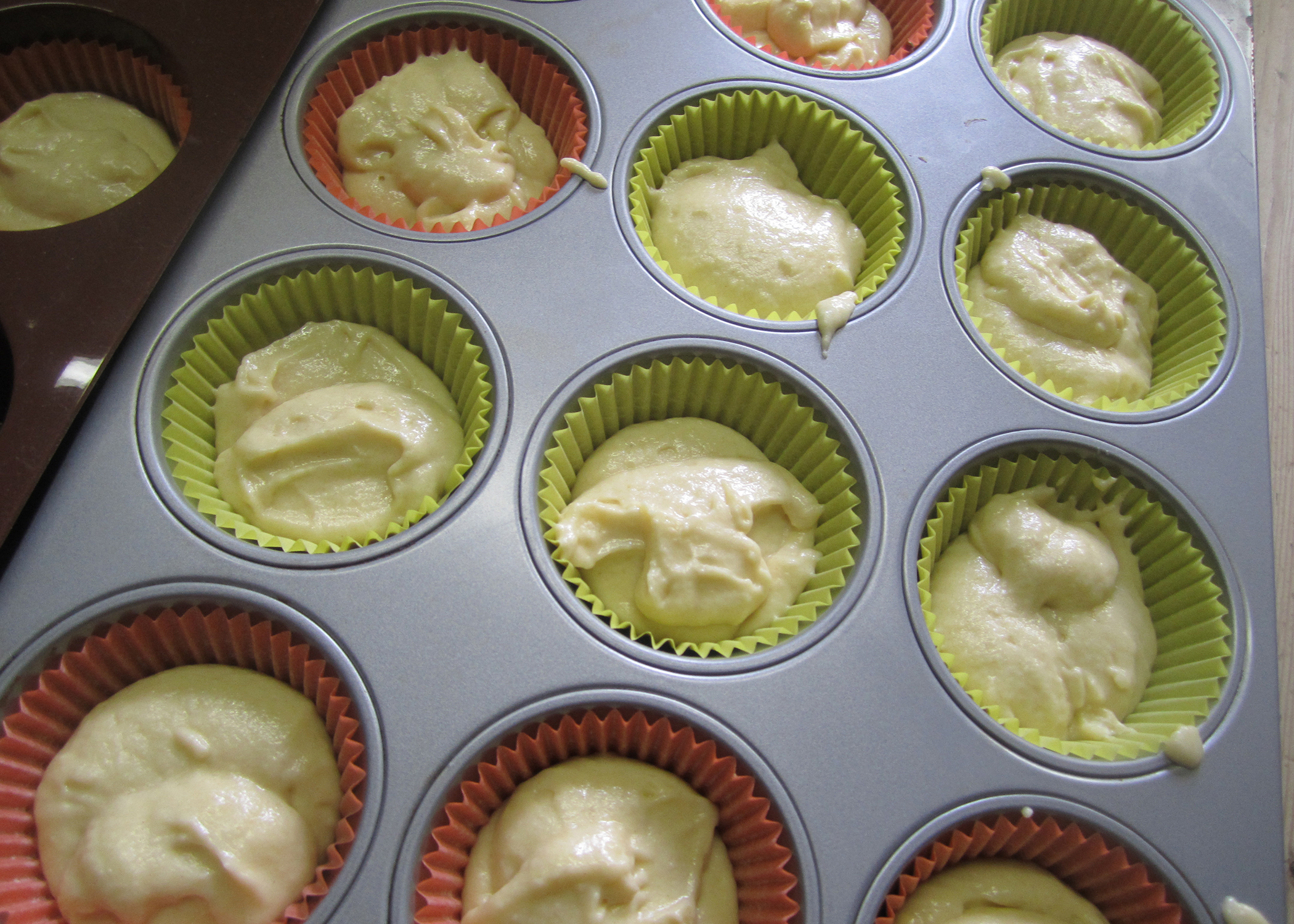 Die Cakes am besten am Vortag zubereiten. Dazu 2 Muffinbleche mit insgesamt 15 Papierförmchen auslegen und den Backofen auf 175°C vorheizen.