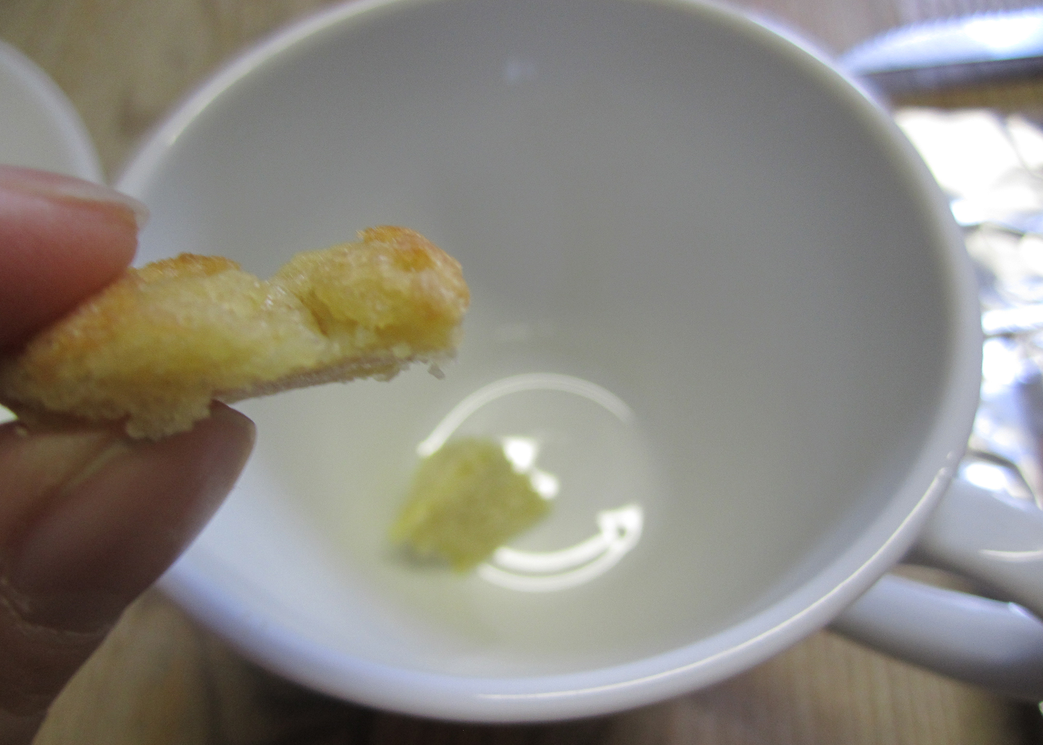 Vom ausgeschnittenen Teil die „Spitze“ abschneiden und den flachen Teil als Deckel behalten. (Siehe Bild)