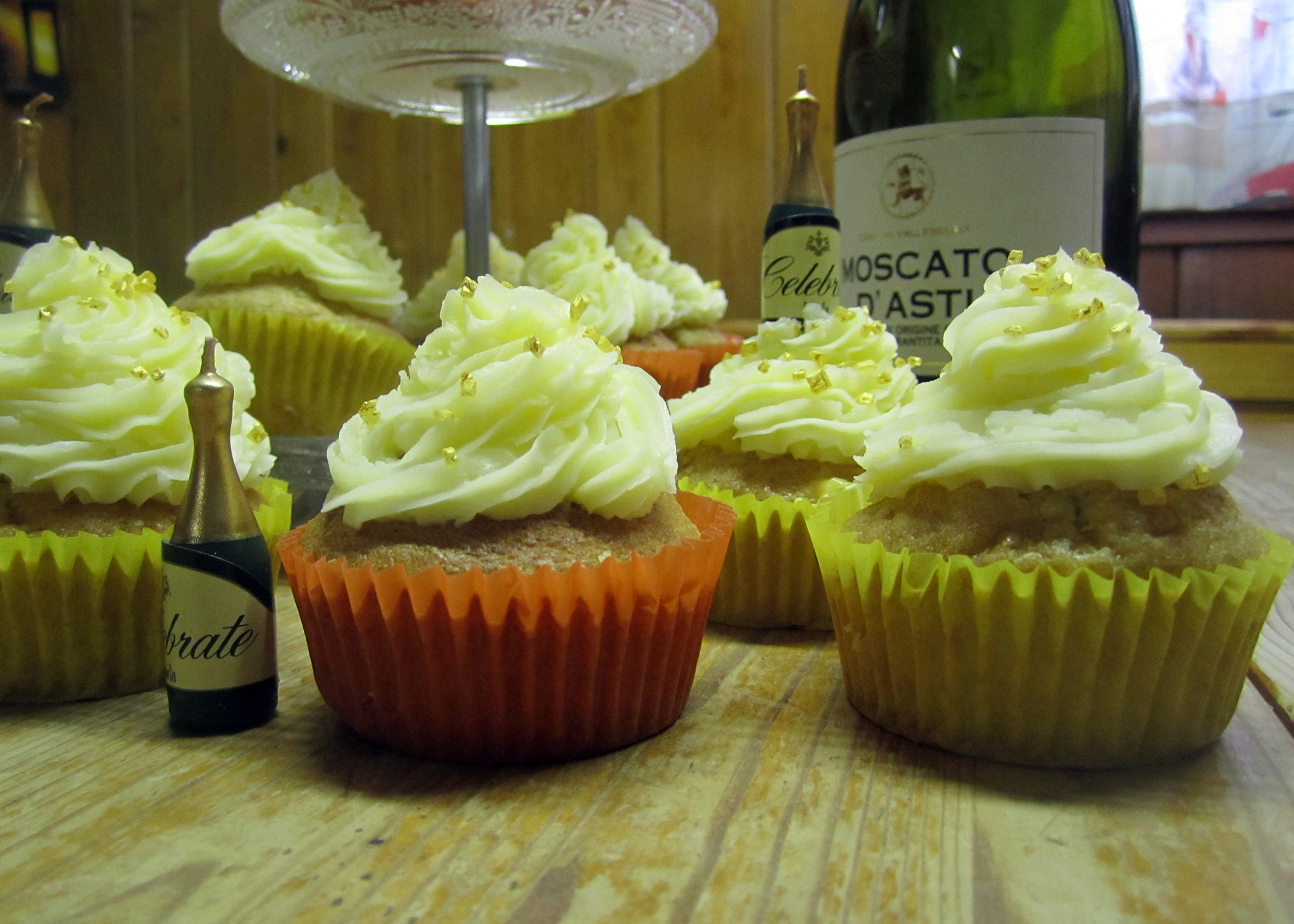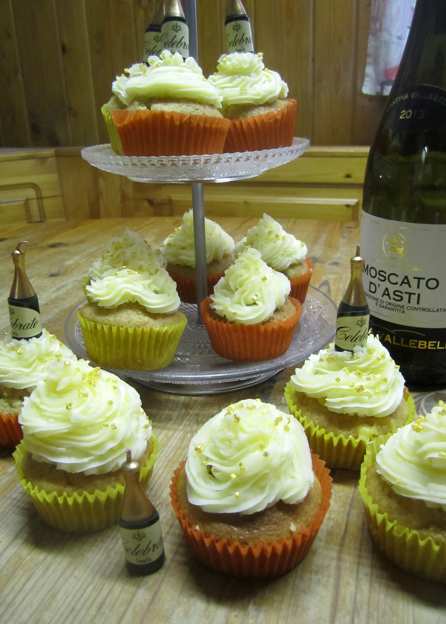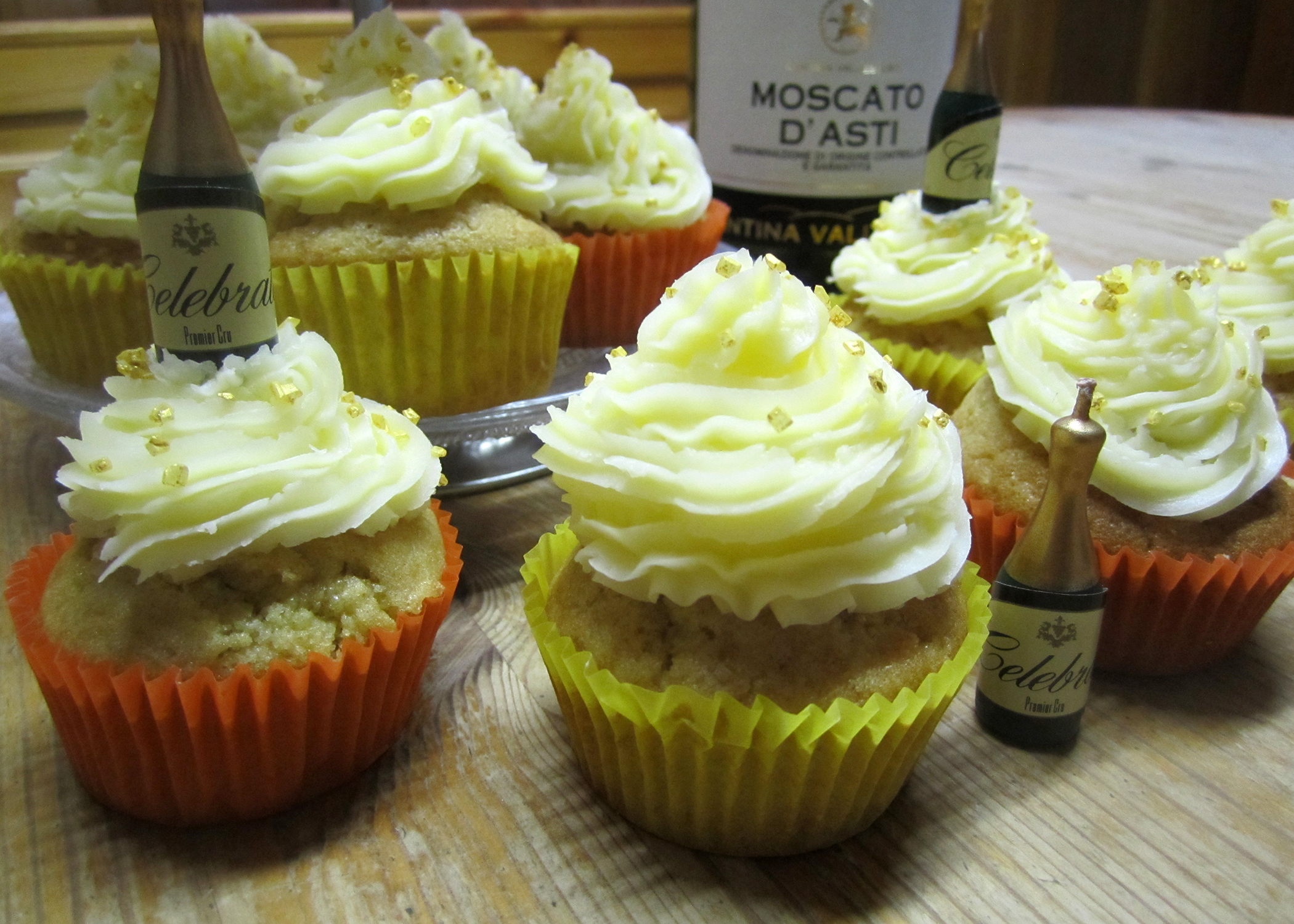 Für das Frosting zuerst die Butter mit dem Puderzucker verrühren, bis die Masse schön geschmeidig ist. Zum Schluss den Moscato unterrühren. Das Frosting portionenweise in einen Spritzsack geben (nicht alles auf einmal, das braucht seeeehr viel Kraft in der Hand!) und auf die Cupcakes spritzen. Ich hatte viel Buttercreme übrig, es darf also ruhig sehr grosszügig gefrostet werden.