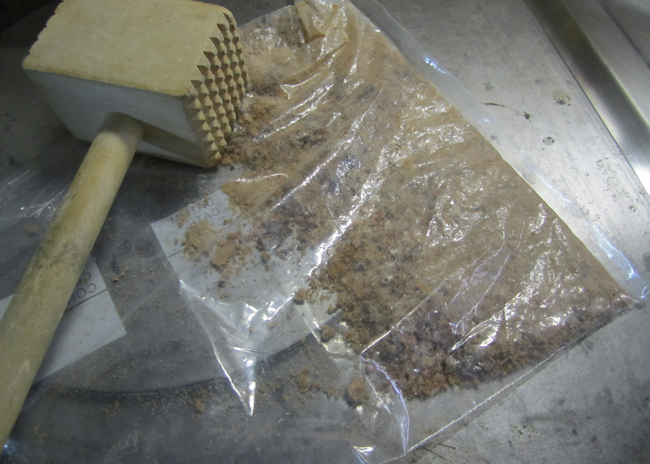 Zu Beginn die Cookies portionenweise in einem Gefrierbeutel mit einem Fleischstampfer fein zerbröseln.
