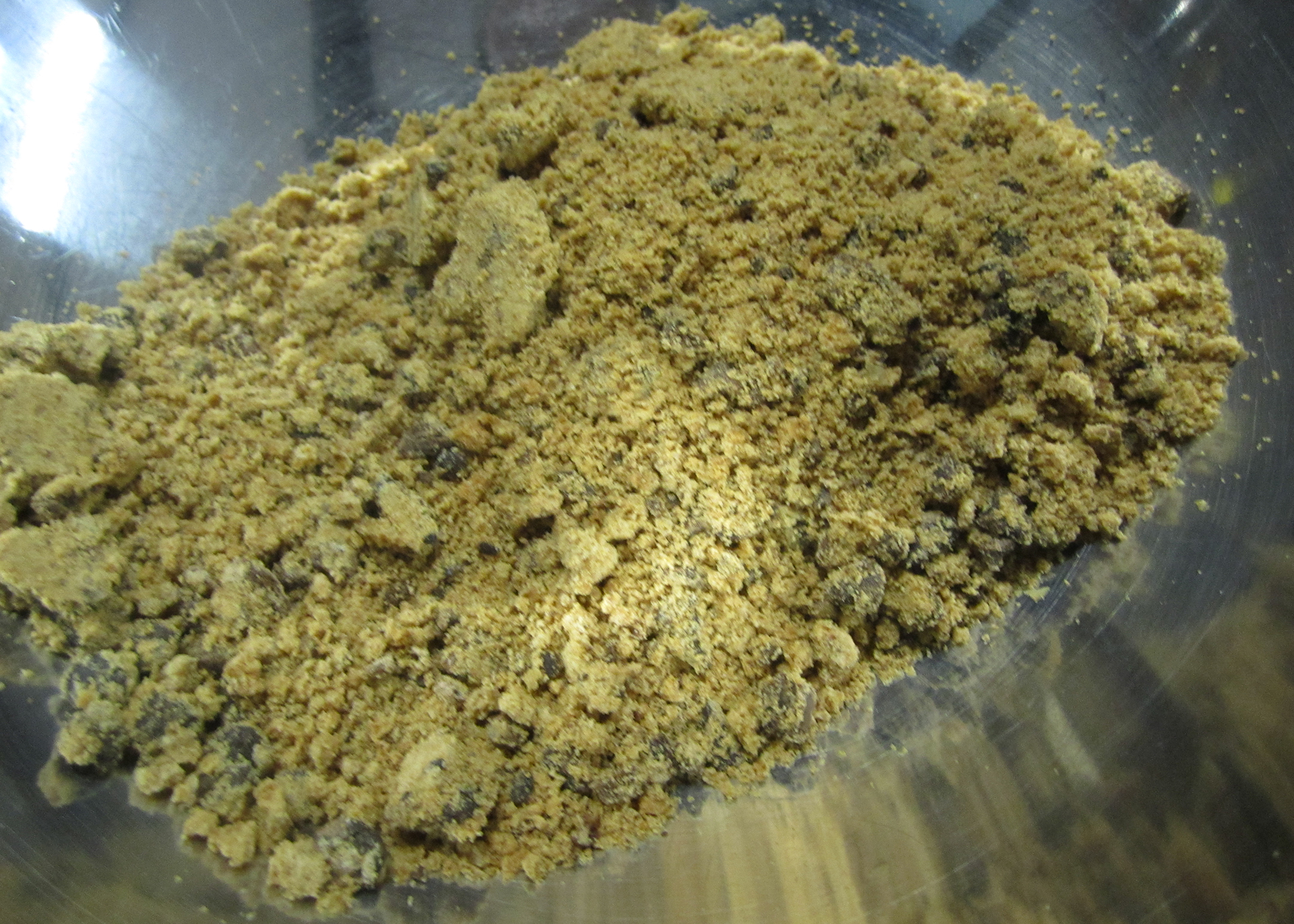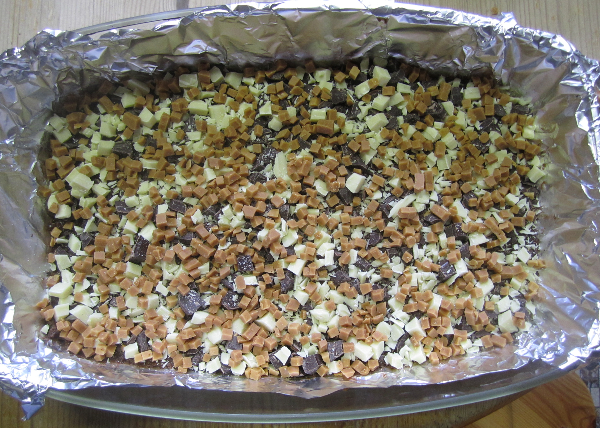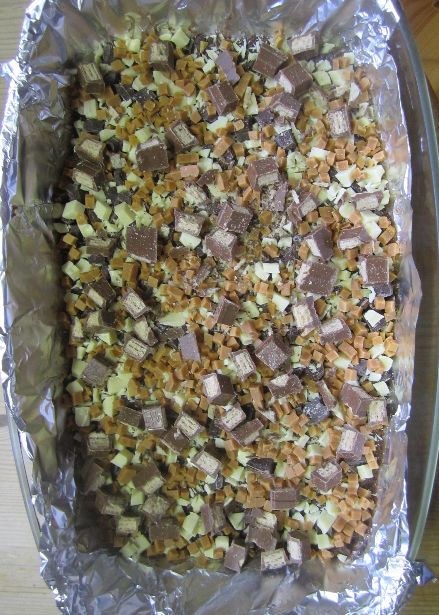 Diese Schnittchen stehen ganz unter dem Moto „Ganz oder gar nicht“…Alles oder Nichts. Die Idee kam mir bei einem Rezept für sogenannte „Seven Layer-Bars“ (Also sieben verschiedene Schichten/Zutaten) auf einem anderen Blog. Alles was eine Süssigkeitenseele begehrt wird zusammengeworfen und gebacken. Teig? gibts nicht! Das einzige was man mischen muss sind Cookie-Brösel und Butter, damit man einen Boden für das ganze hat. Die restlichen Zutaten werden ganz einfach klein gewürfelt und nach einander in die Form gegeben.