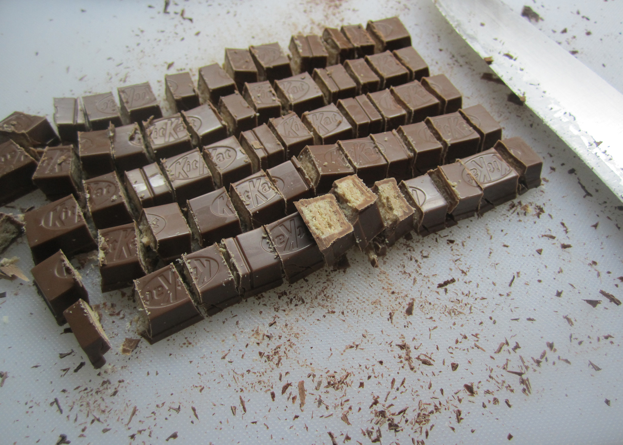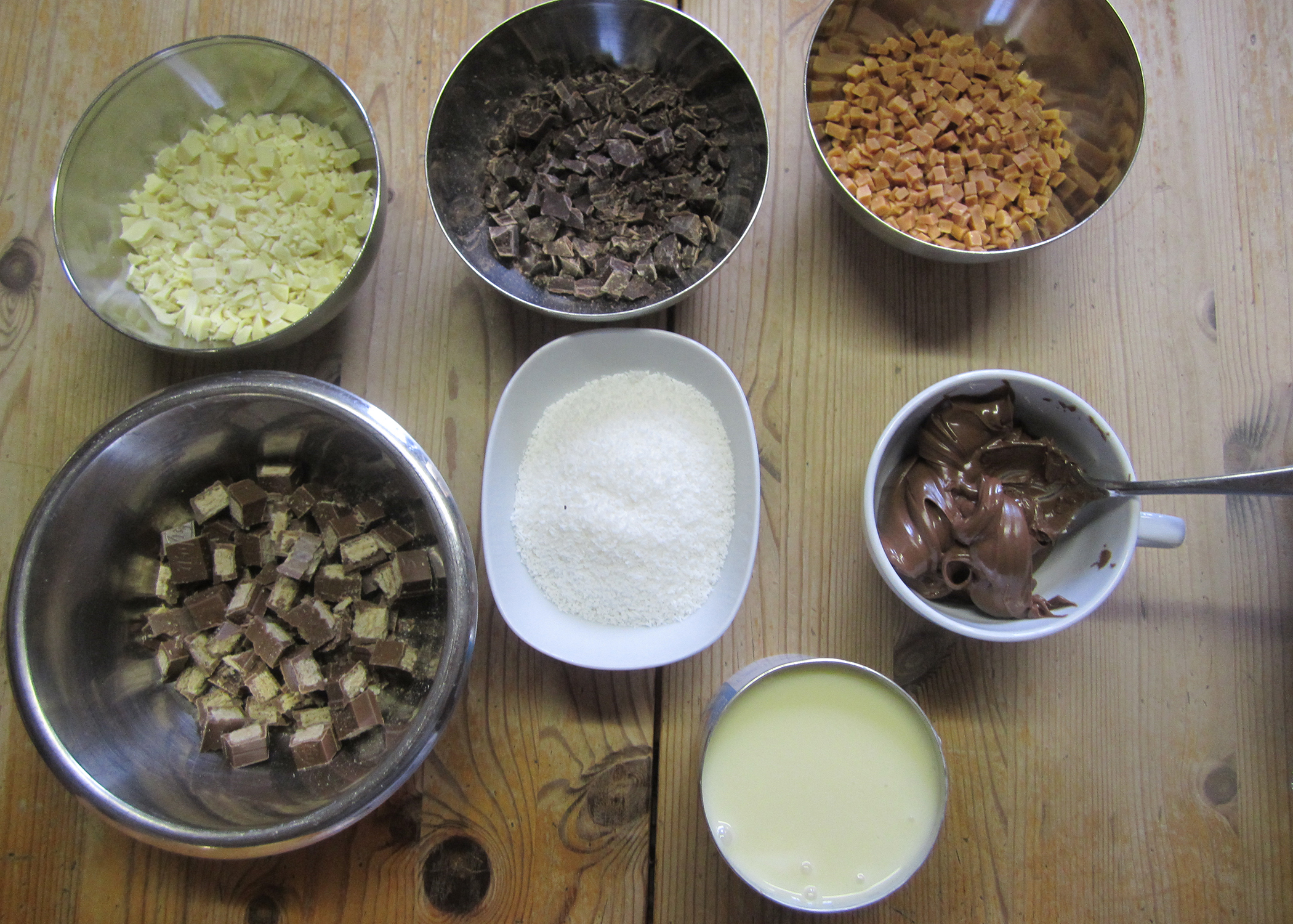Anschliessend die dunkle Schokolade, weisse Schokolade, sowie die Kitkats in kleine Würfel schneiden und in separate Schüsselchen geben.