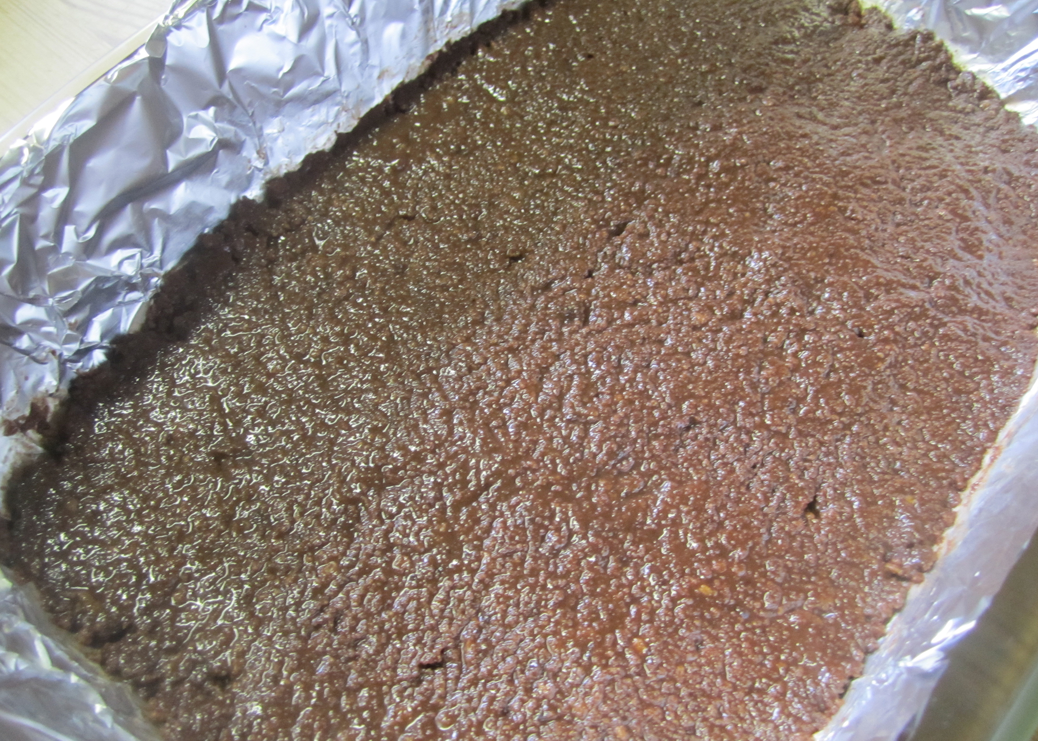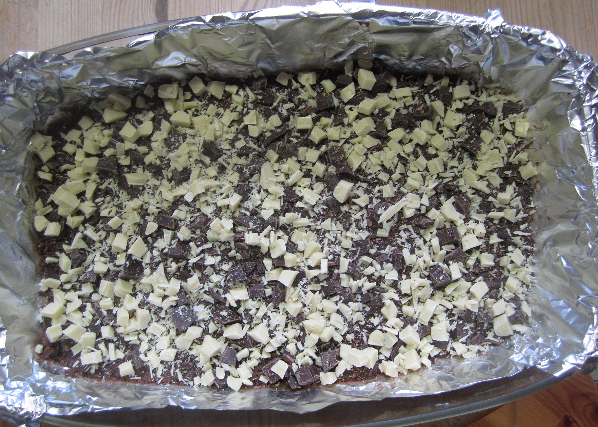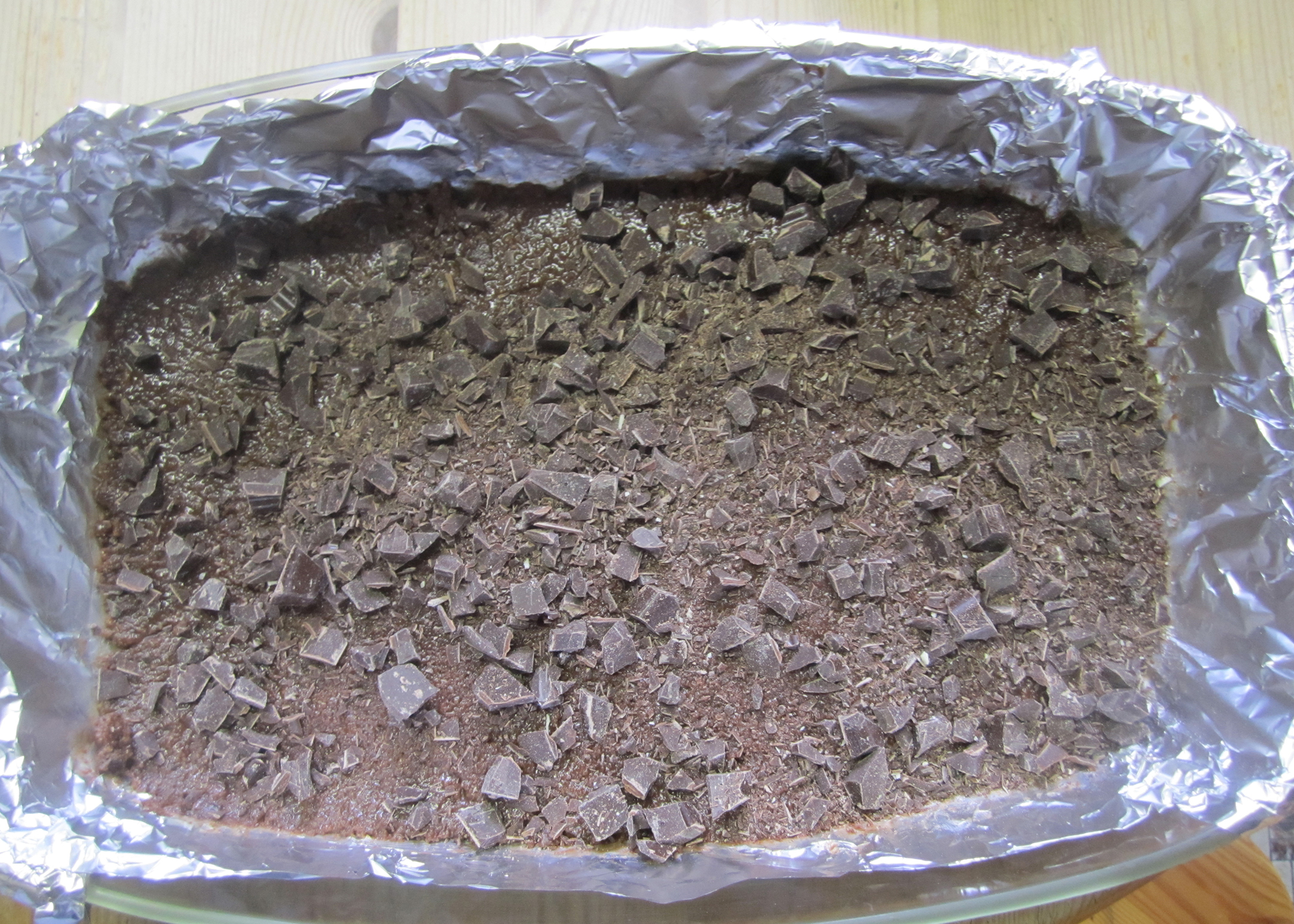 Eine rechteckige Form (22x33cm) mit Alufolie auslegen, diese leicht einfetten und den Backofen auf 175°C Umluft vorheizen.